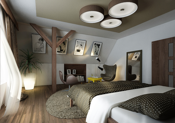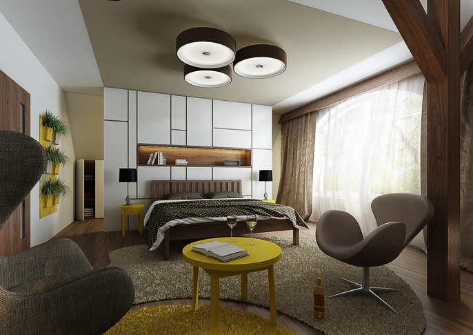 Stylová pokrovní ložnice v zemitých barvách ve skandinávském stylu. K sezení slouží designové ikony od dánského designéra Arne Jacobsena - křesla The Egg a The Swan. Odstíny hnědé jsou kombinovány s bílou barvou a celý interiér zpestřují žluté doplňky. Prostor projasňuje světlá podlaha, na které se nachází zajímavě tvarované koberce v různých odstínech. Místnost dostatečně prosvětlují velká okna po délce stěny a umožňují tak výhled do zahrady. Zajímavým prvkem jsou dřevěné podpěrné sloupy.