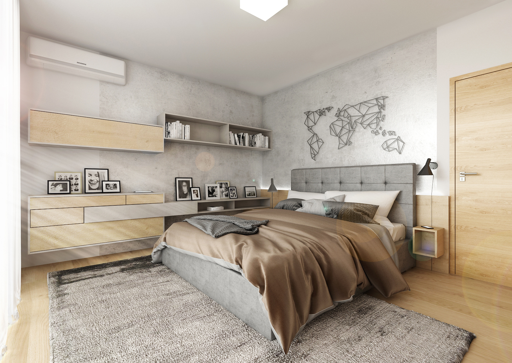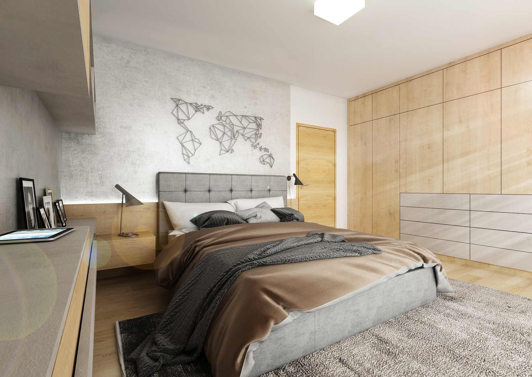 Majitelé si přáli pomoci se zařízením ložnice a zabydlením venkovní terasy. Ta je okouzlila při výběru bytu, a kterou chtěli maximálně využívat. V návrhu ložnice udala tón jejich čalouněná postel. Dotvořilo se podsvícené čelo postele s nočními stolky a navazující boční sestavou zásuvek. Vestavná šatní skříň, zaplňující jednu celou stěnu, v pokoji nijak neruší a poskytuje dostatek úložného prostoru. Tmavší šedou kůži doplnilo lamino v kombinaci světle šedé a dekoru přírodního dubu.