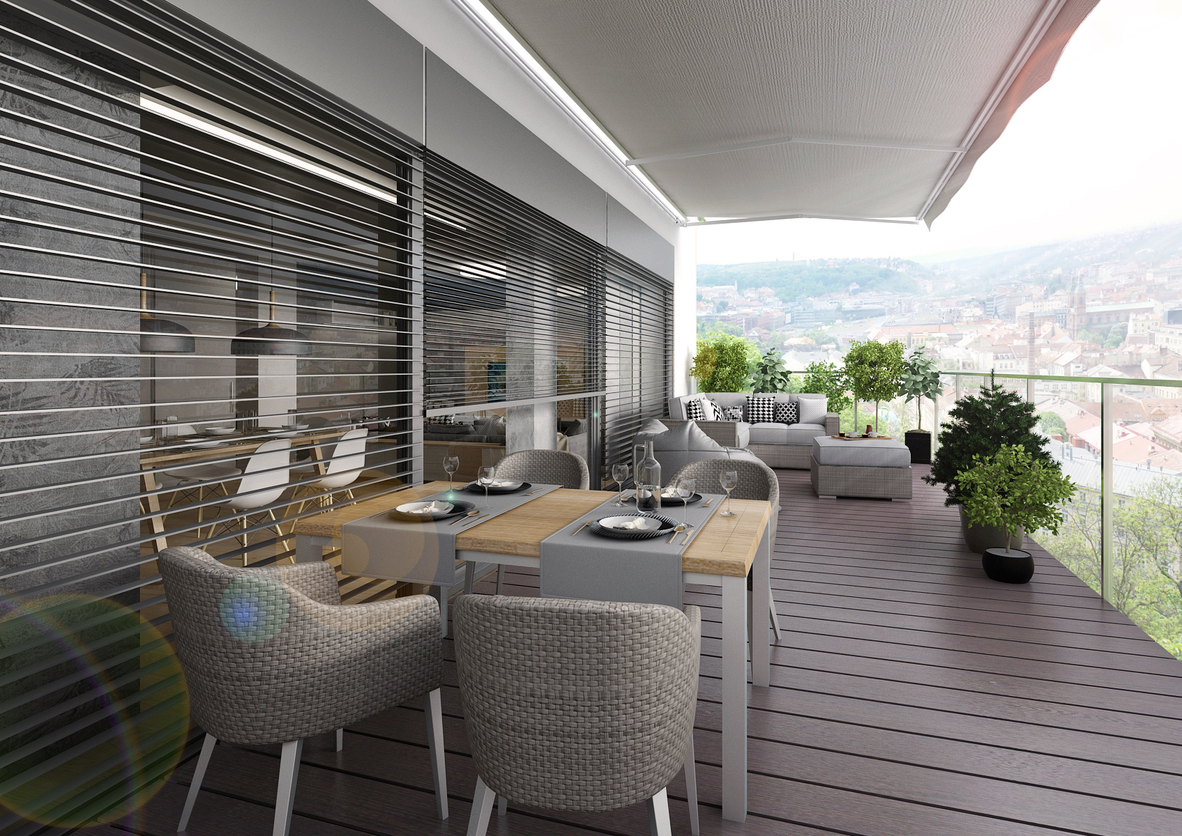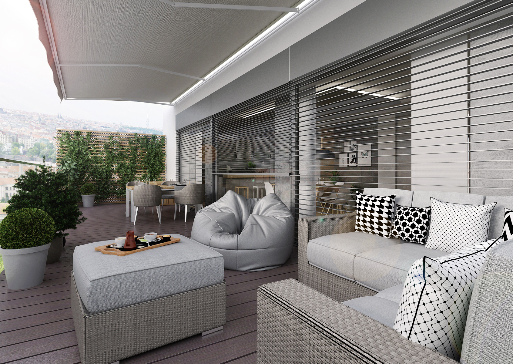 Pobyt na terase zpříjemňuje nábytek určený pro venkovní prostory, stolová deska z týku a posezení z umělého ratanu. Materiál, který nesaje vodu a je odolný vůči nepříznivému počasí. Rolovací pergola na zastínění, dostatek zeleně, krásný výhled, prostě pohoda.