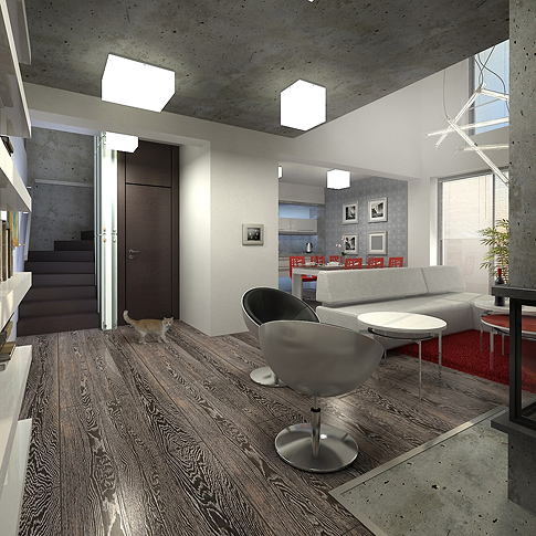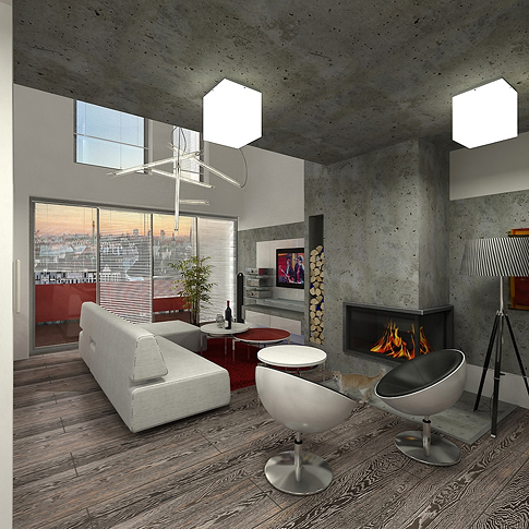 V interiéru obývacího pokoje s posezením u krbu bylo použito betonové stěrky na stěnách a stropu. Podlaha je v kouřovém dubu. Prostor rozjasňují bílé nábytkové prvky a stropní světla. Nad pohovkou je zavěšen lustr originálního designu.