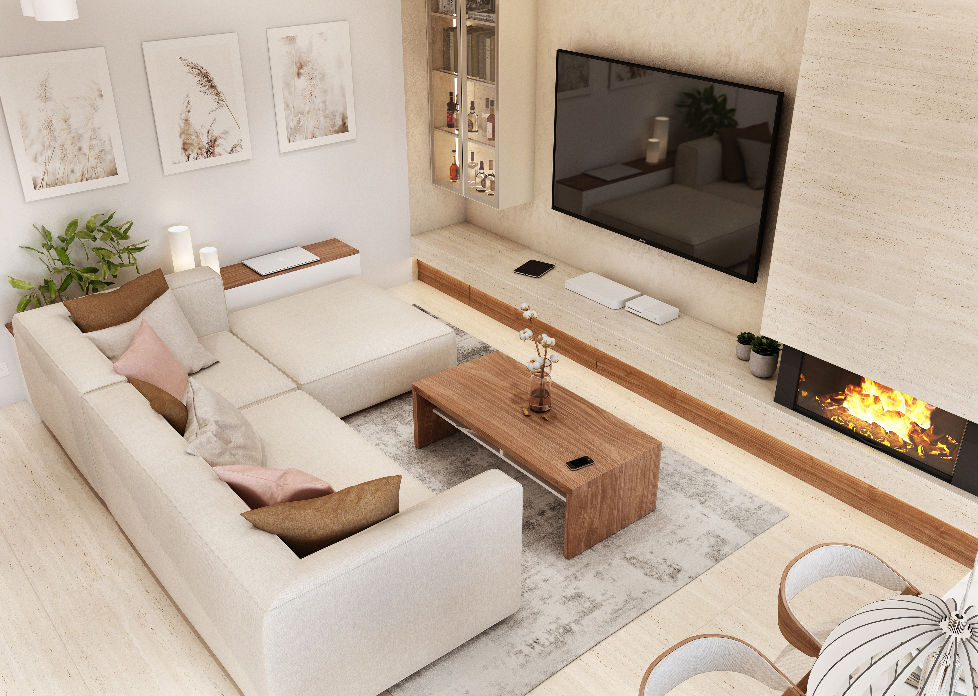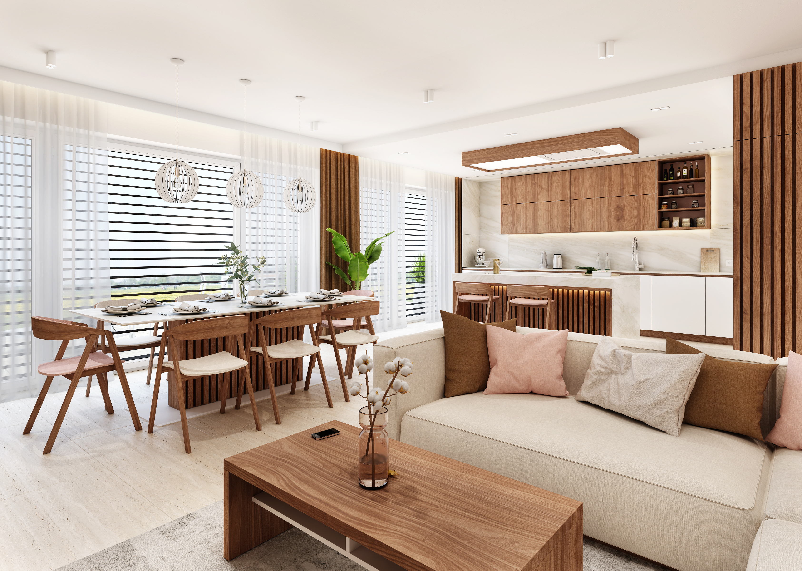 Obytný prostor díky volbě materiálu a barev působí na první pohled sladce a hřejivě. Teplé tóny se odráží nejen v ořechu, ale také ve světle růžových doplňcích, které design interiéru zjemňují.