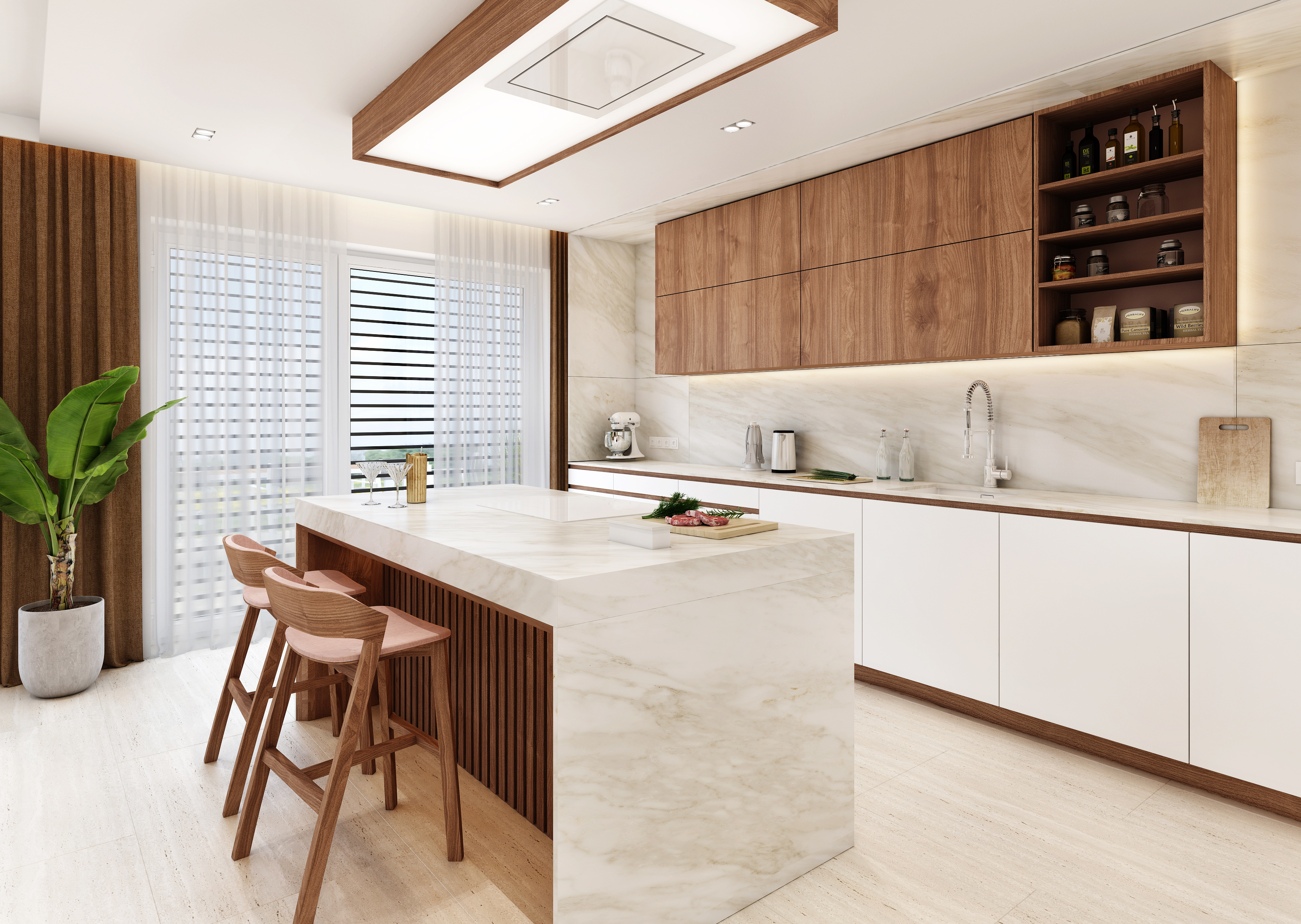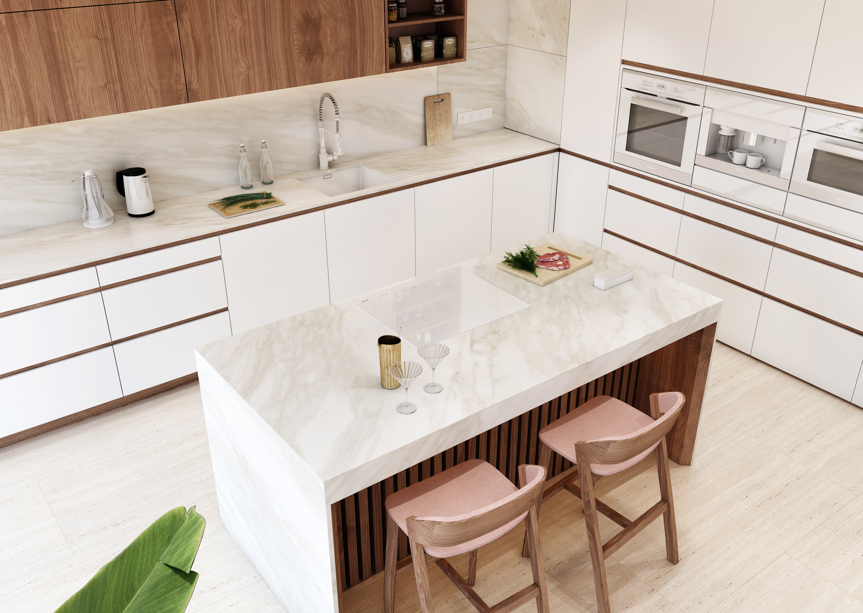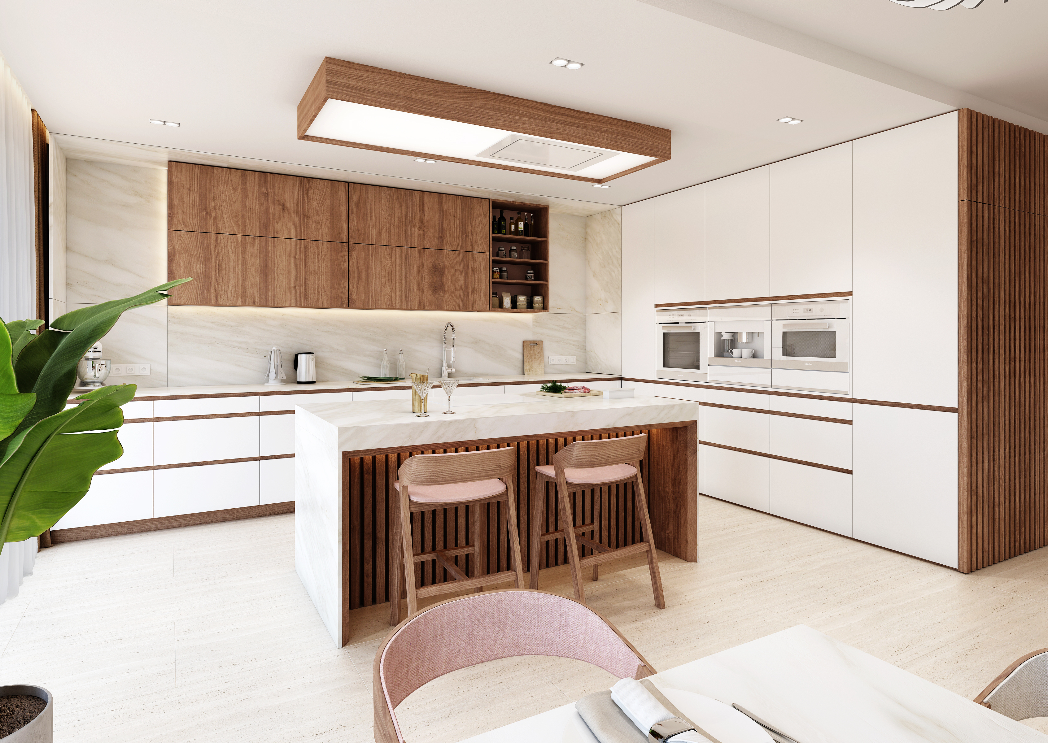 Prostorná kuchyň do tvaru „L“ v bílé, která je opět doplněna o ořechovou dýhu. Ve velkém množství lze vidět na horních skříňkách, v menším pak odděluje šuplíky spodních kuchyňských skříněk. Nechybí zde ani kuchyňský ostrůvek s kamennou deskou a podsvícenou lamelovanou podnoží, nad kterým je umístěna stropní digestoř.