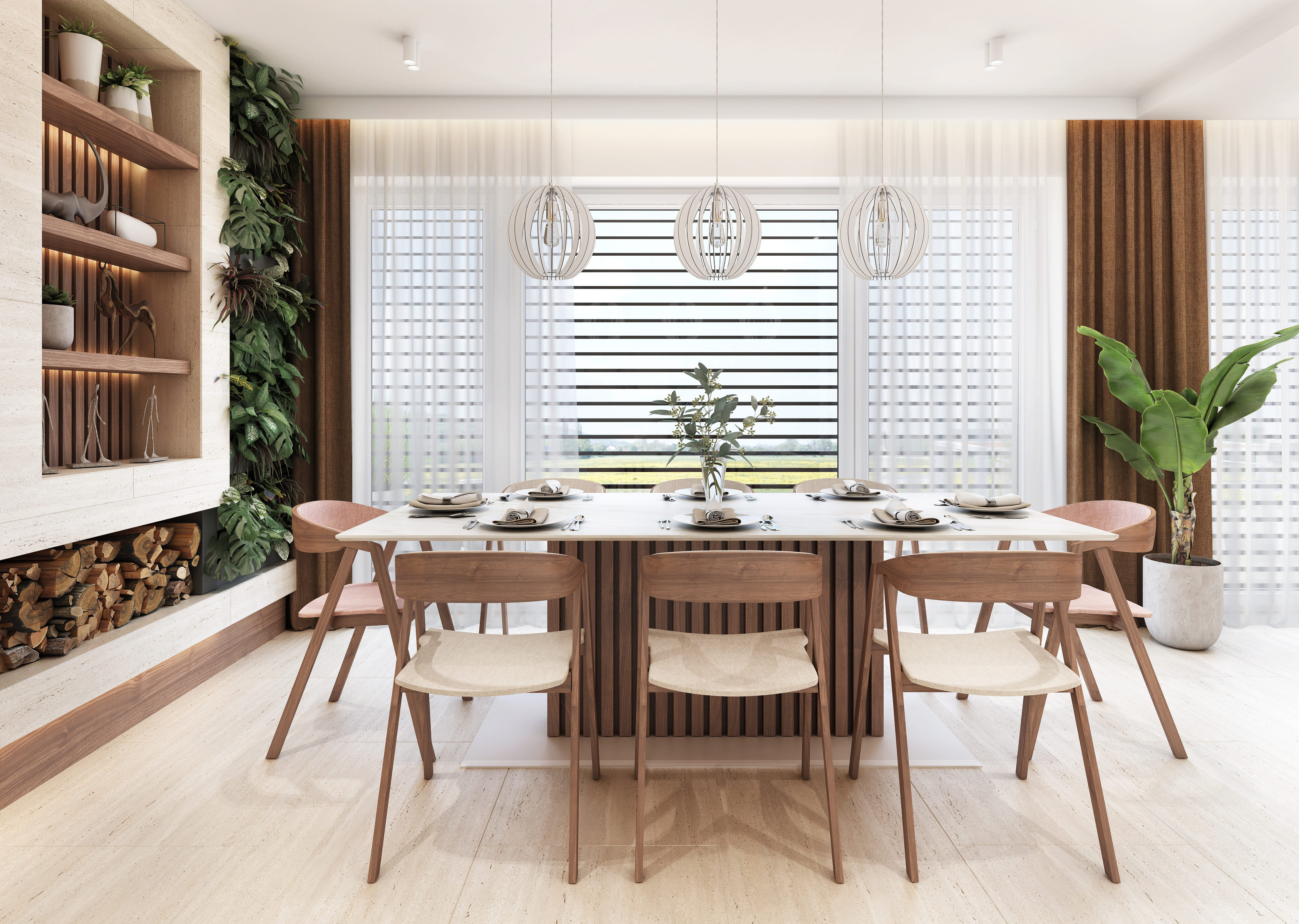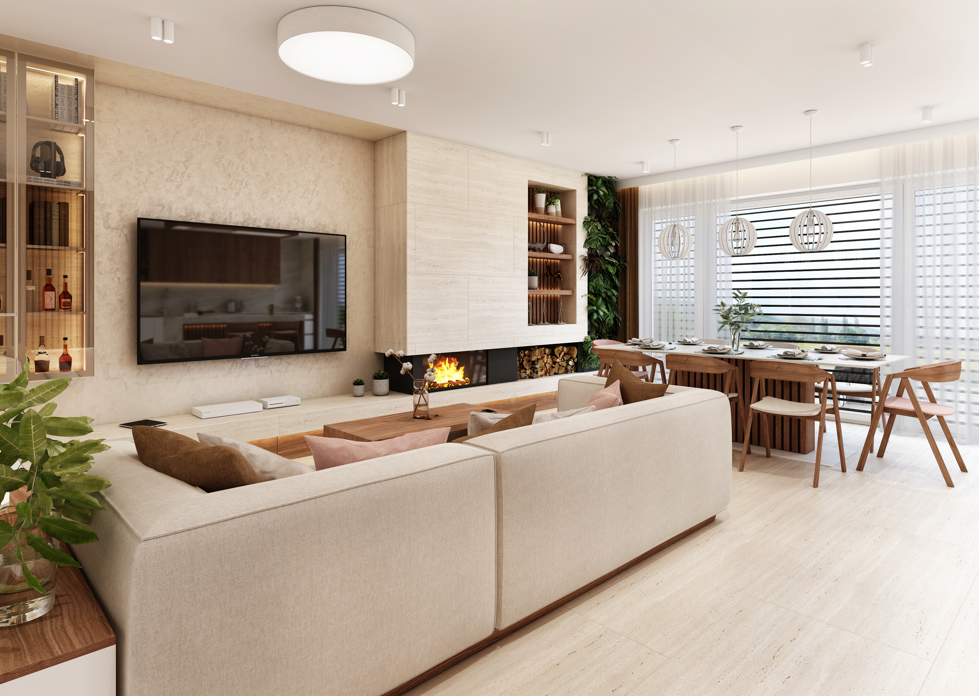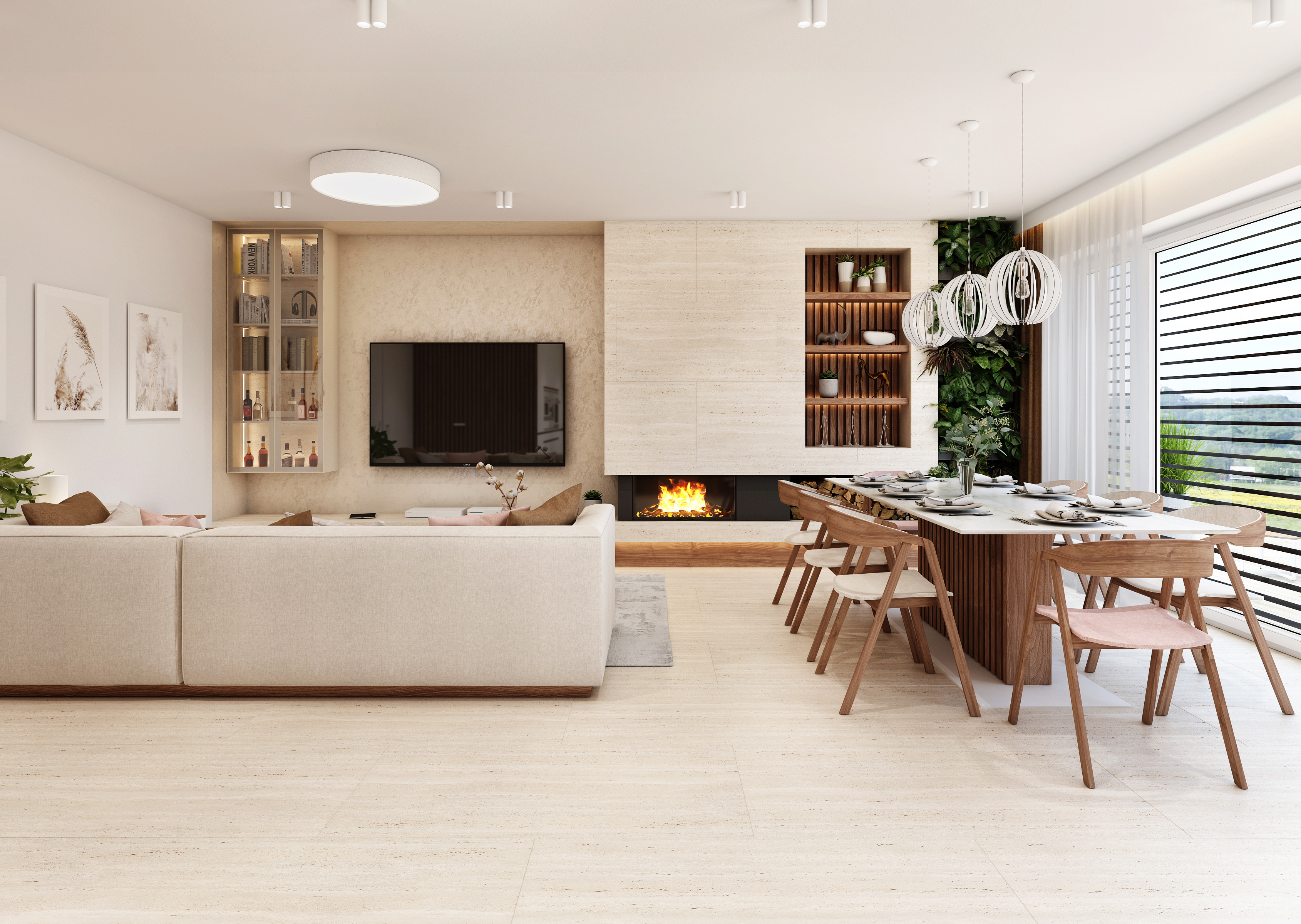 Jídelní stůl s tenkou kamennou deskou zaujme pravděpodobně hlavně svou lamelovanou středovou podnoží z ořechu, nad kterým visí trojice překližovaných skládacích lustrů. Po celé délce zdi se pak táhne obývací stěna se zabudovaným krbem a úložným prostorem na dřevo. Nad ním je umístěn výklenek s policemi, kterými opět prostupují podsvícené lamely v pozadí. Na druhé straně obývací stěny se nachází prosklená vitrína na prémiový alkohol.