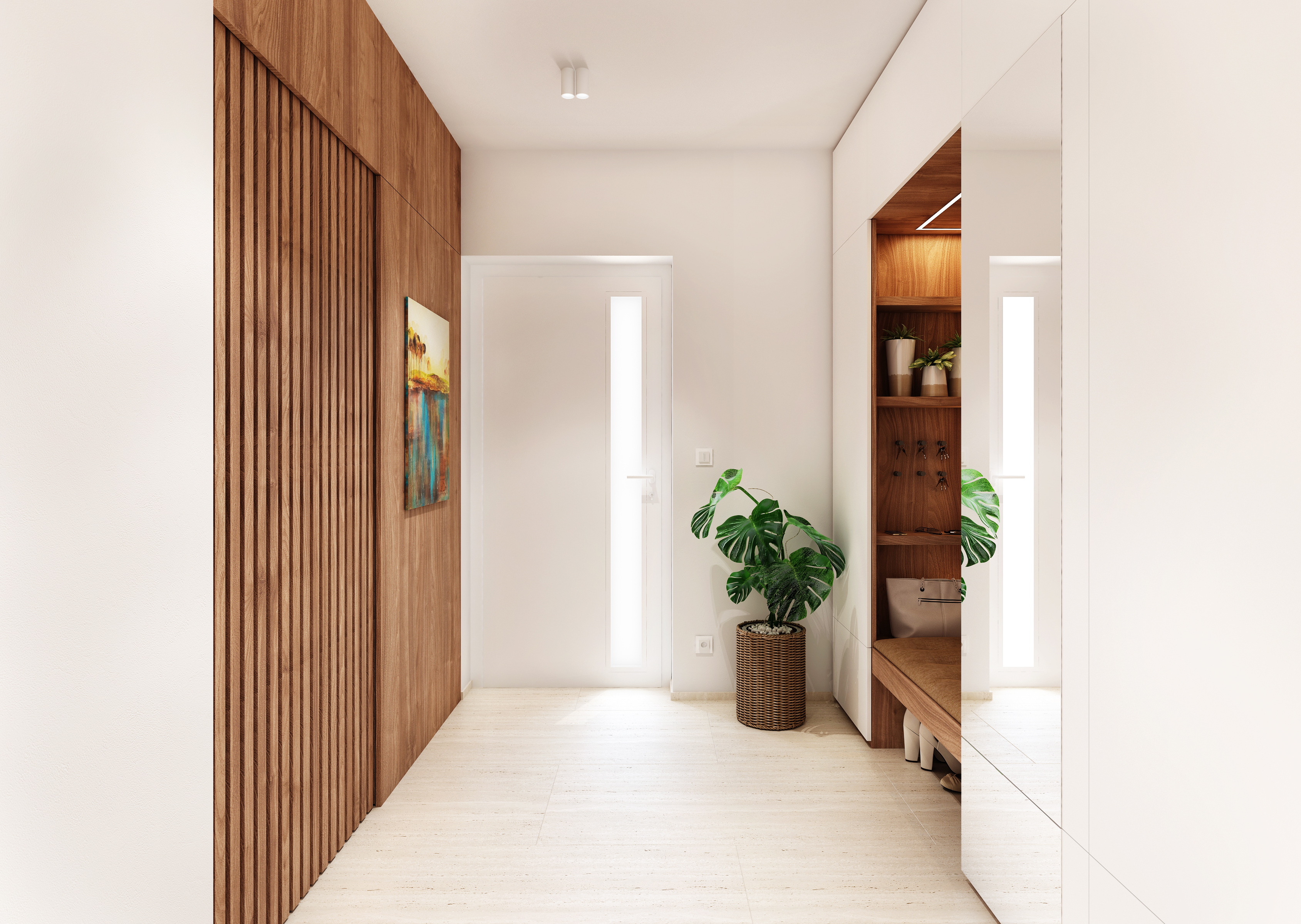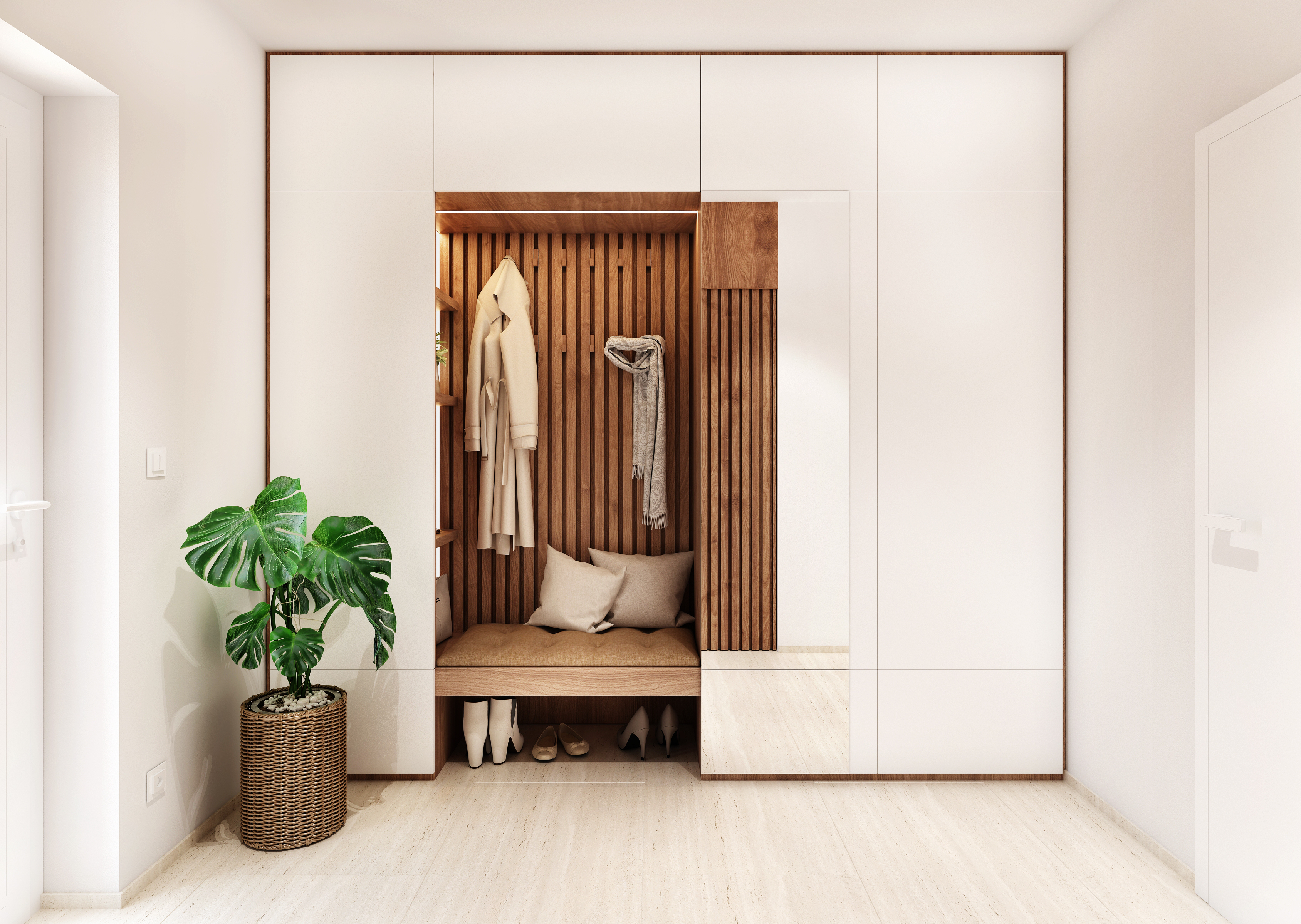 Prostorná vstupní hala nabízí možnost úschovy oděvů a obuvi, dokonce nechybí ani místo k sezení pro usnadnění přípravy.