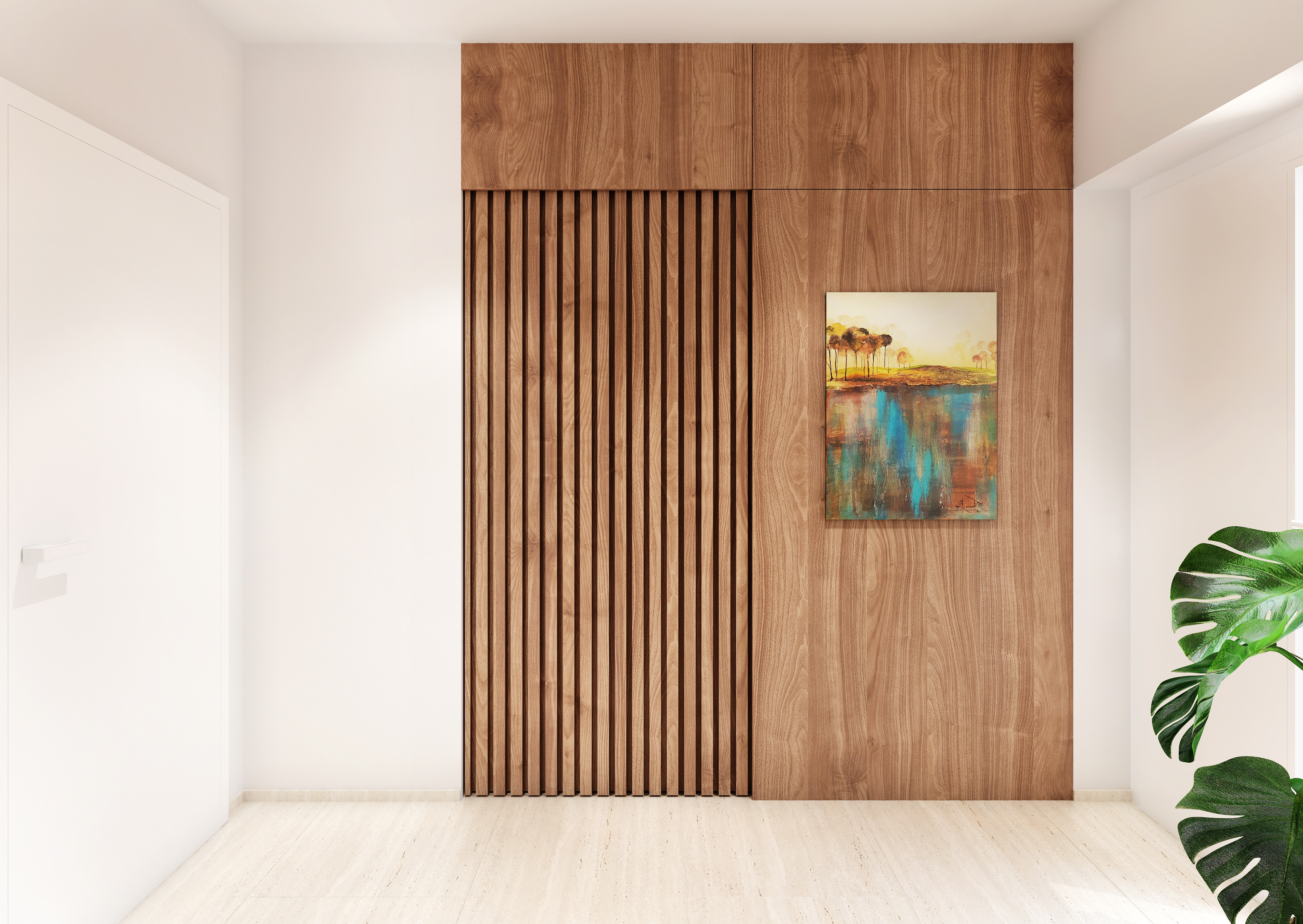 Výrazným prvkem, který na první pohled zaujme, je barva a textura ořechové dýhy, která tomuto interiéru dominuje.