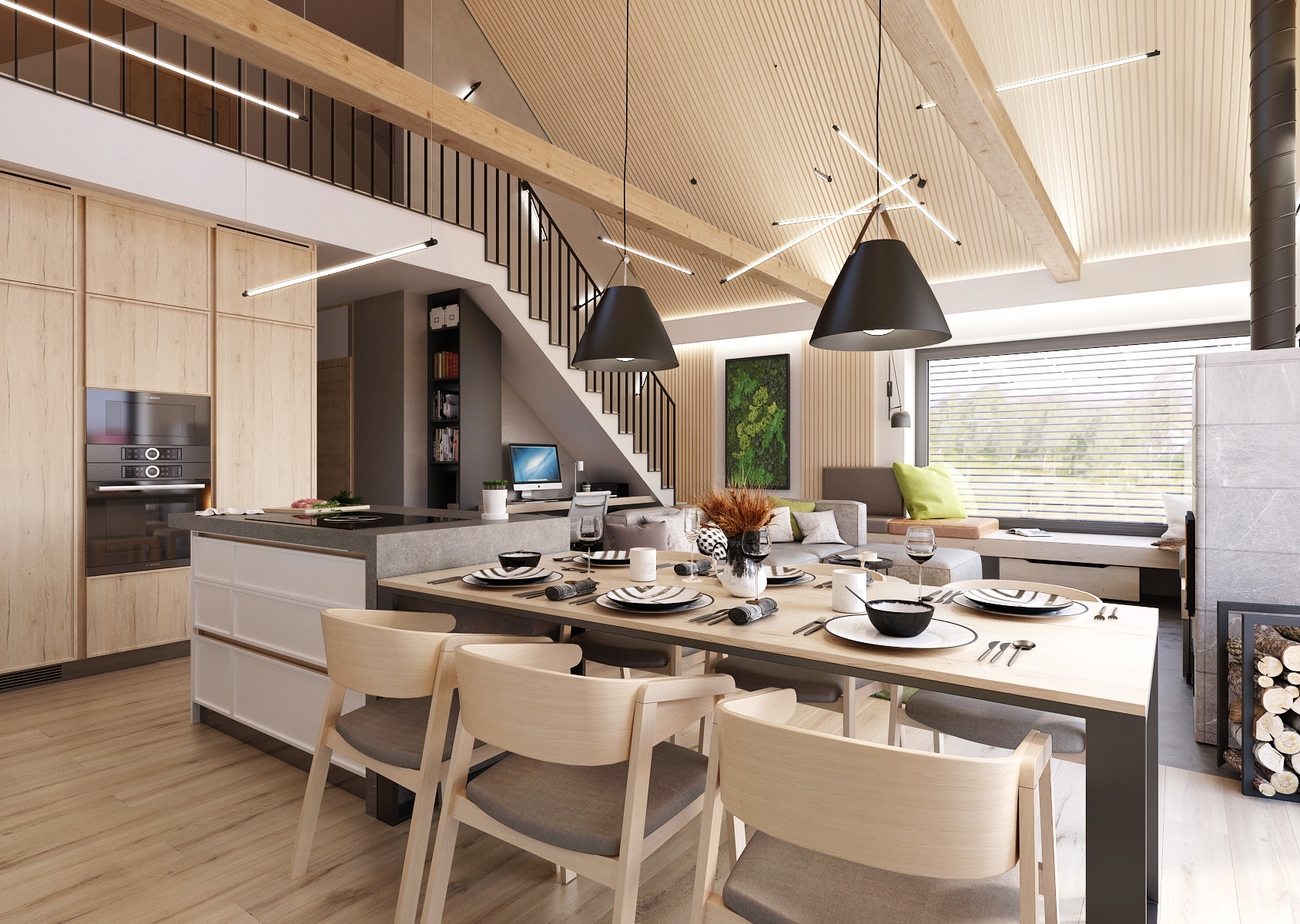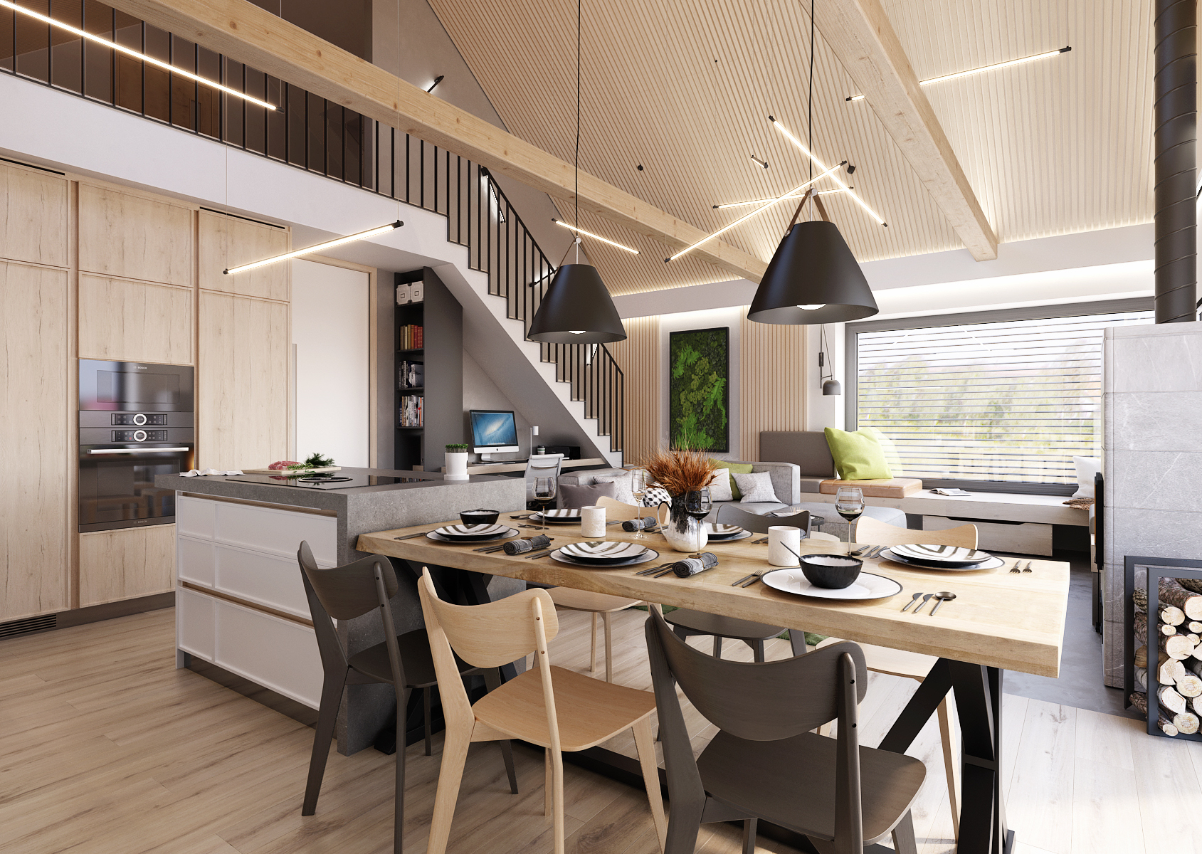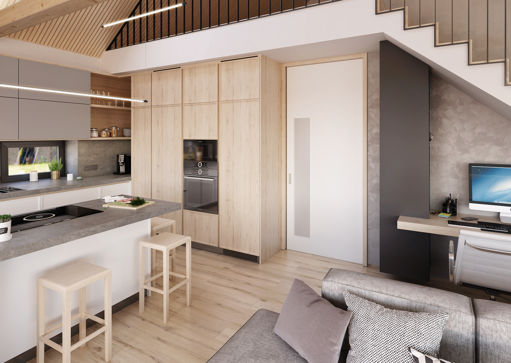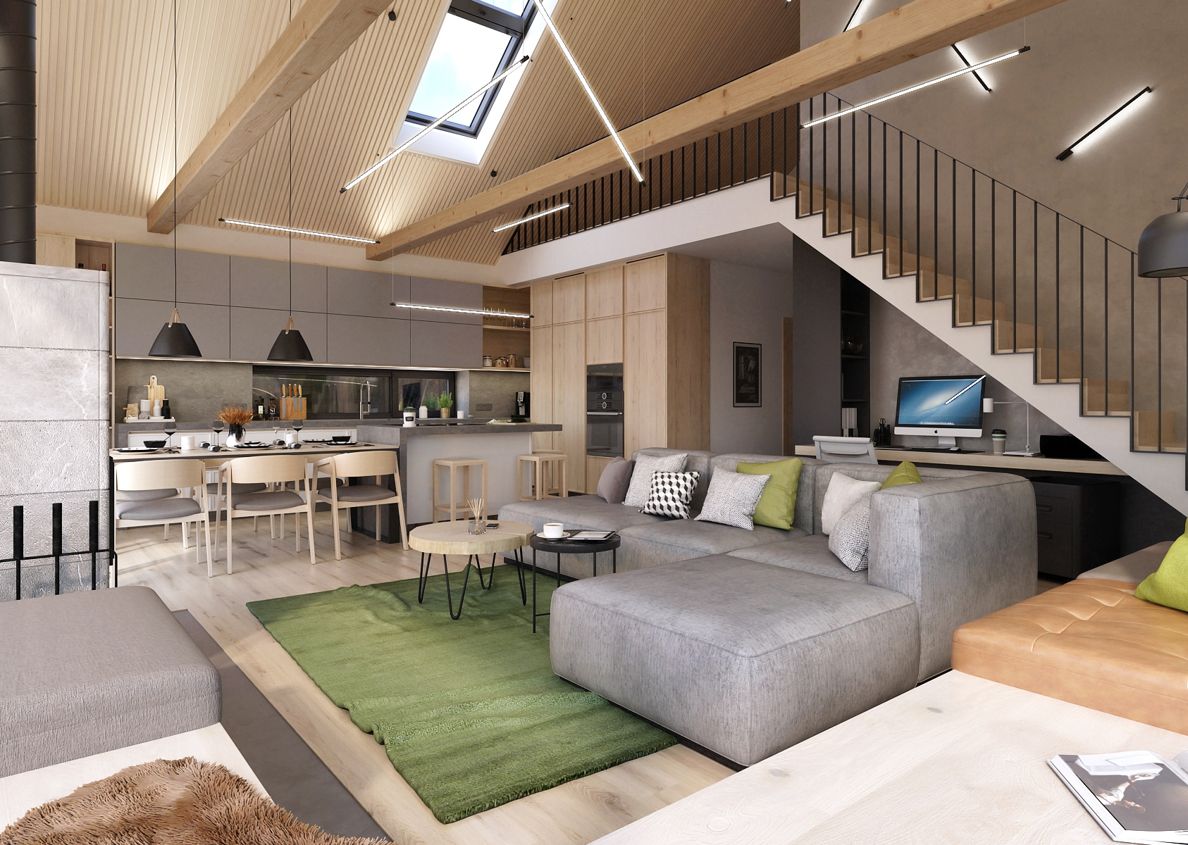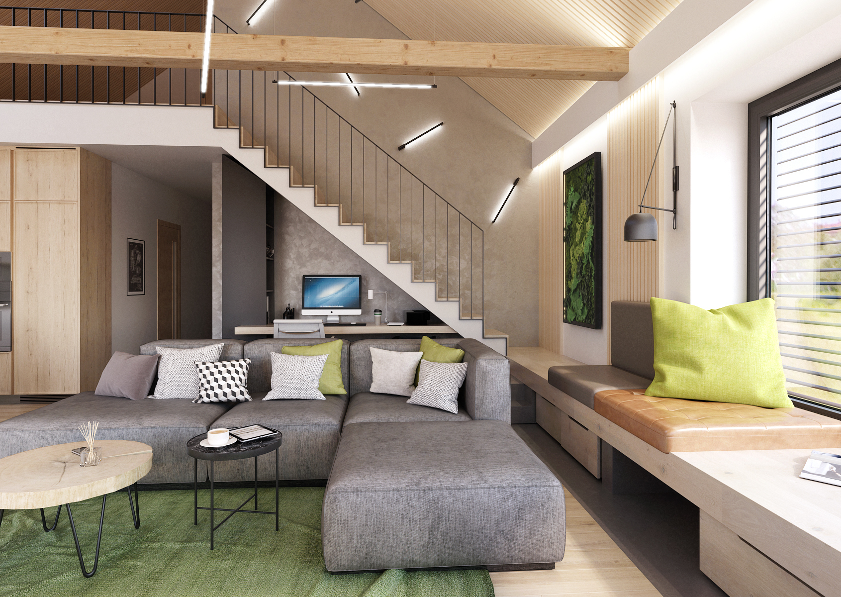 V prostoru pod schody je schované pracovní stůl. Interiér je osvětlen světelnými lištami, ať už zavěšenými nebo nepravidelně připevněnými ke zdi nad schodištěm.