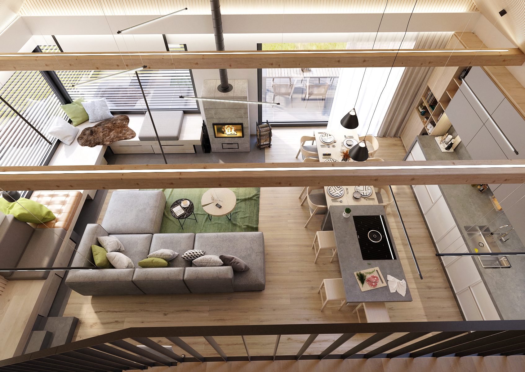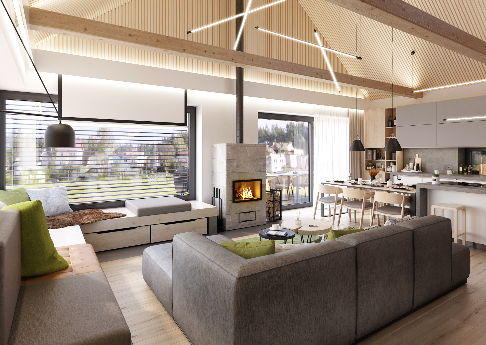 Obytná část rodinného domu v přízemí disponuje vysokými stropy s přiznanými stropními trámy s podsvícením a akustickým obkladem.