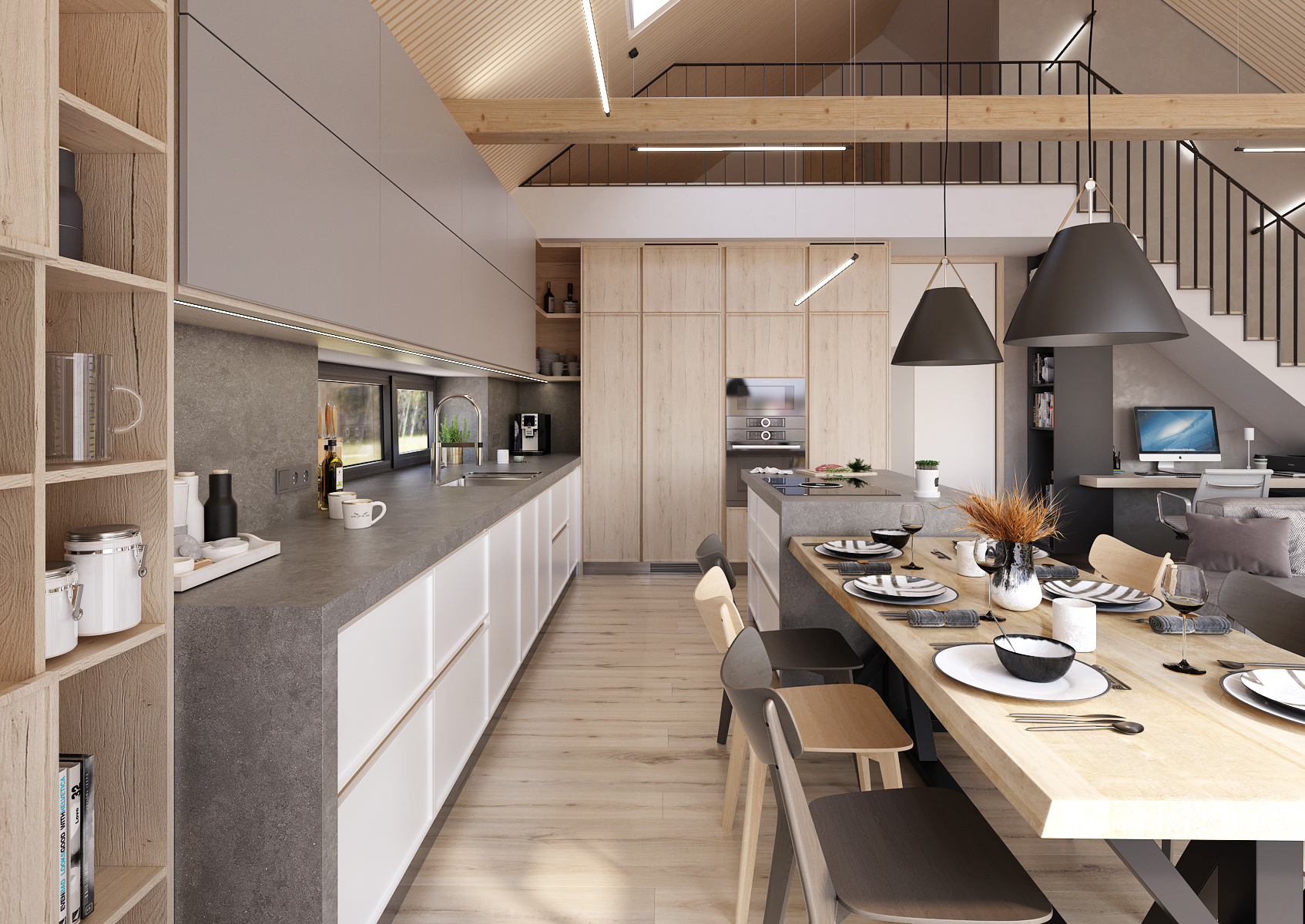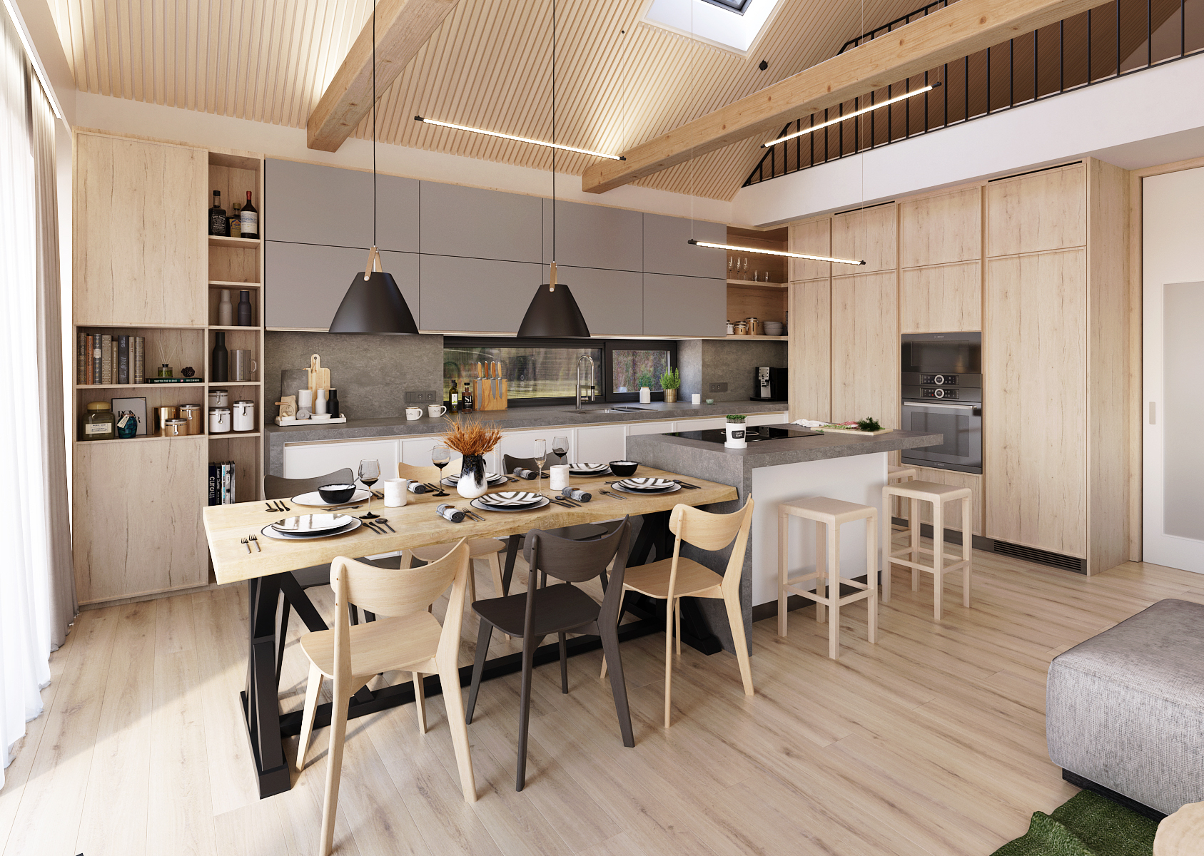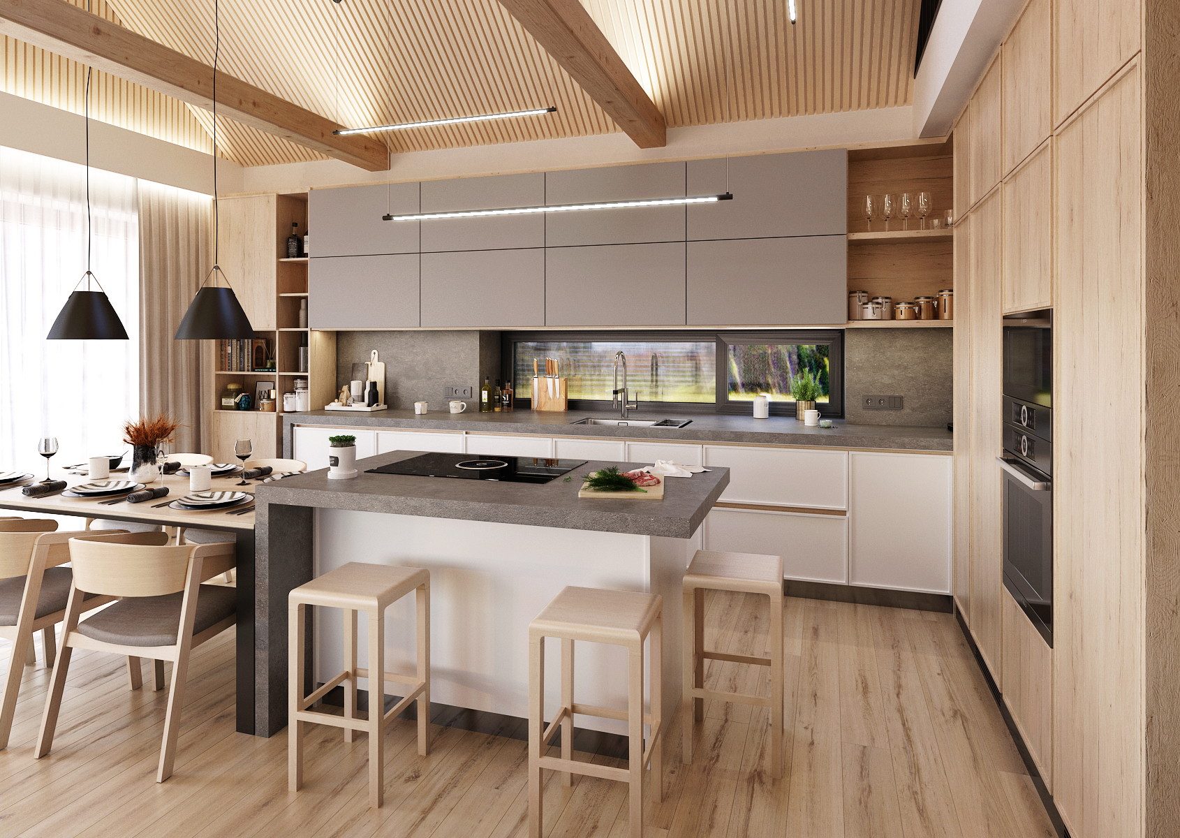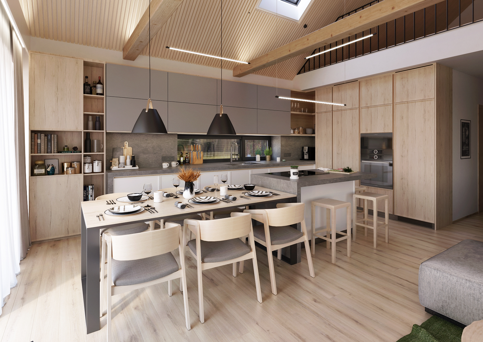 Prostorná rohová kuchyň s kuchyňským ostrůvkem, který je vizuálně prodloužen jídelním stolem, je v kombinaci šedé matné s přírodním dubem. Důležitým prvkem podtrhující čistotu designu jsou bezúchytová dvířka skříněk.