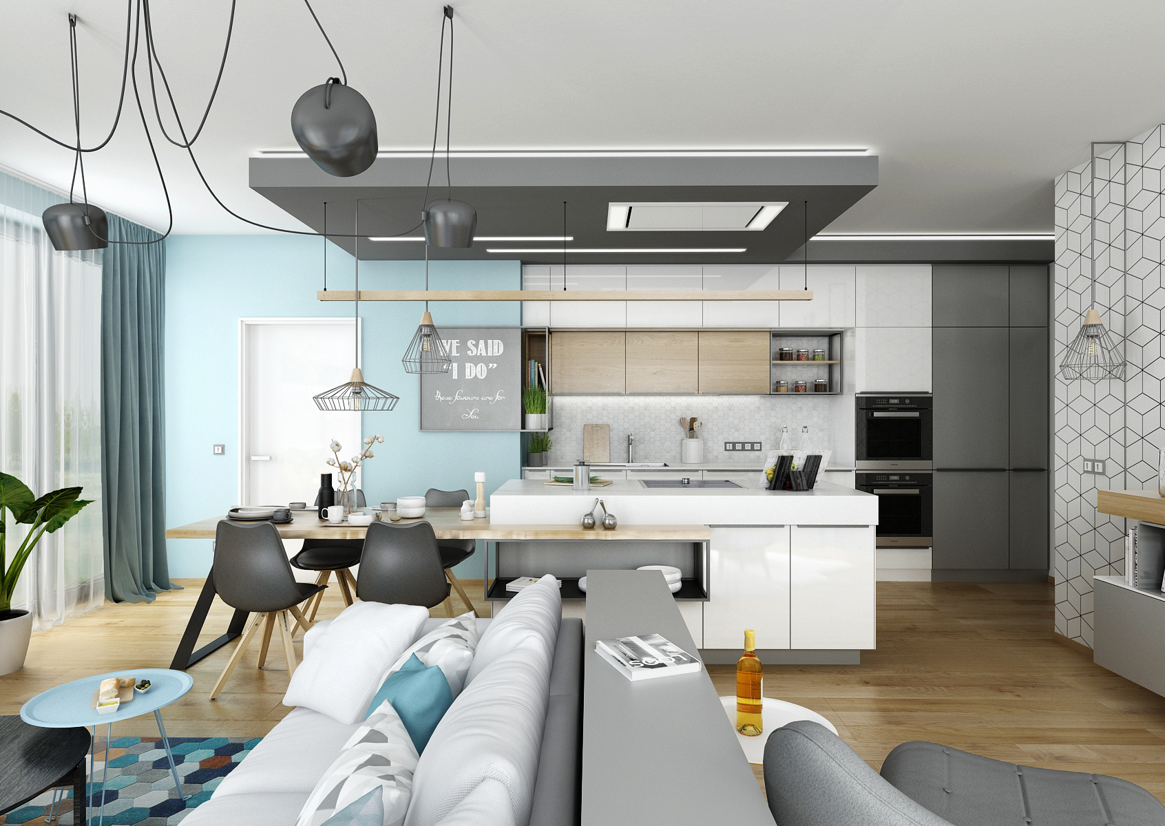 Společná prostor obývací pokoj s kuchyní a jídelnou