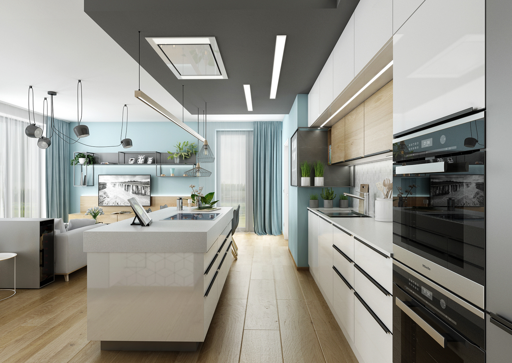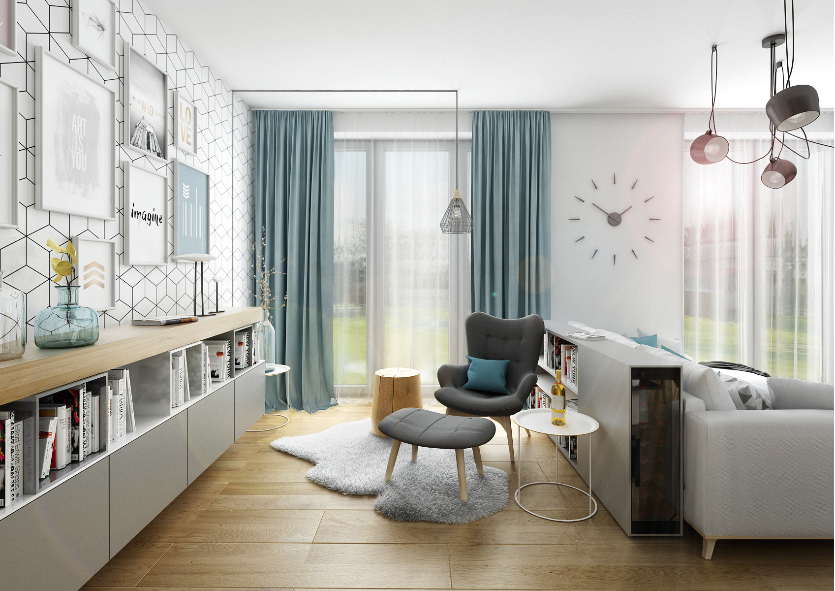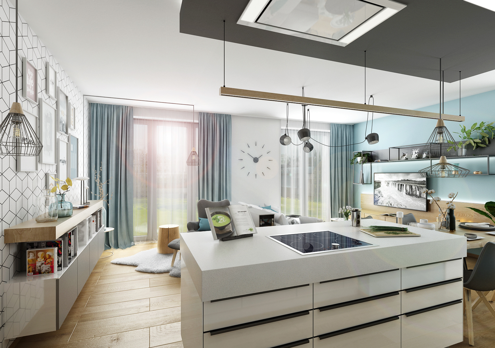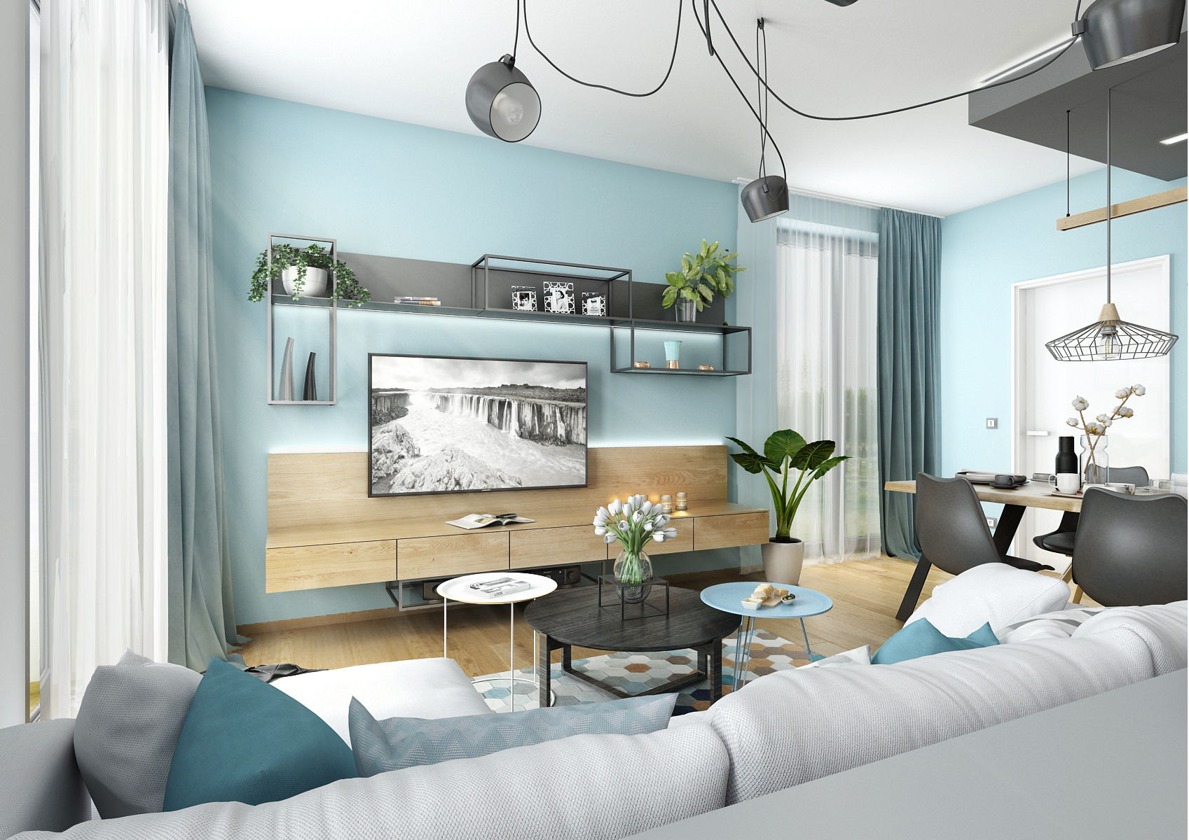 V tomto rodinném domě je viditelná inspirace severským stylem. Prostory jsou laděn do příjemných světlých tónů. To se týká i odstínu ledovcově modré, jak na tapetách, tak textiliích. Vymyká se pouze kontrastní antracitová, která je doplňkovou barvou.