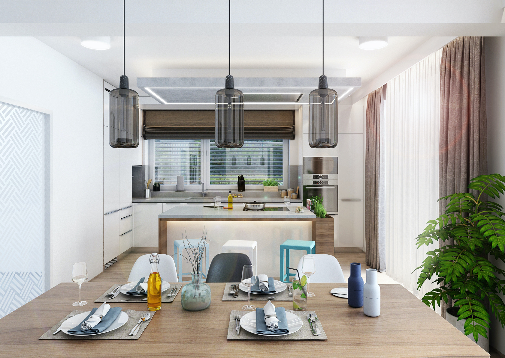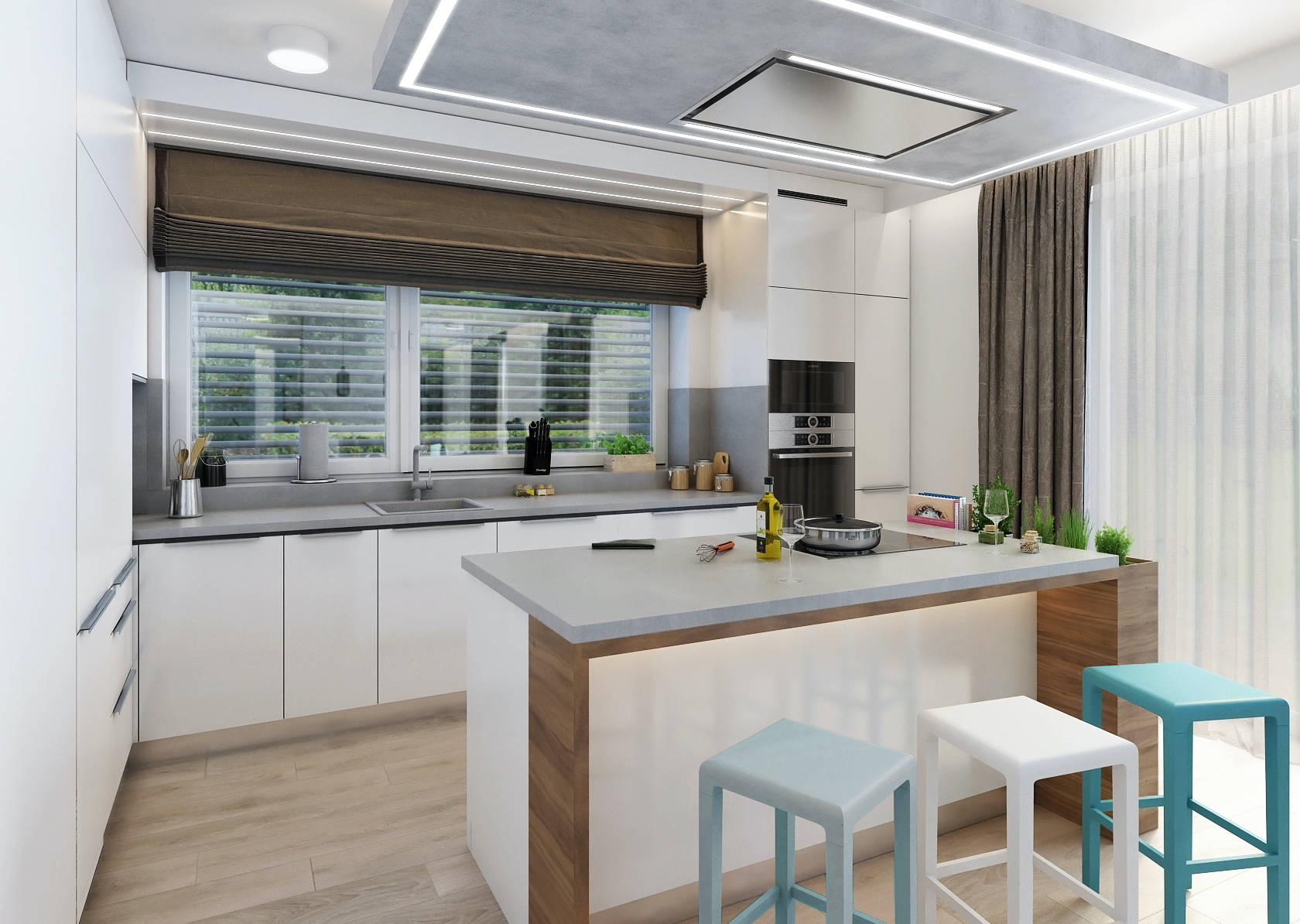 Kuchyně je sladěna do světlých tónů s bílou barvou v kombinaci s tmavým dřevodekorem. Tmavě hnědá barva je použita i na závěsech.
