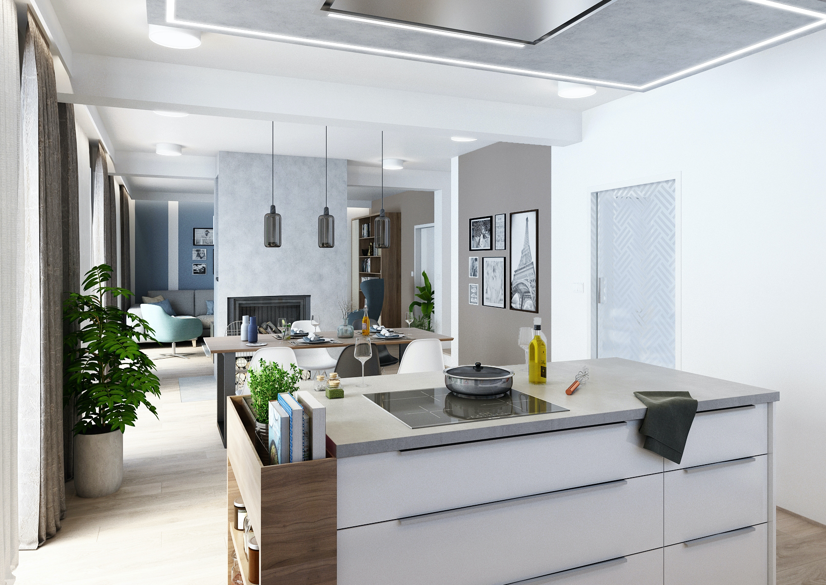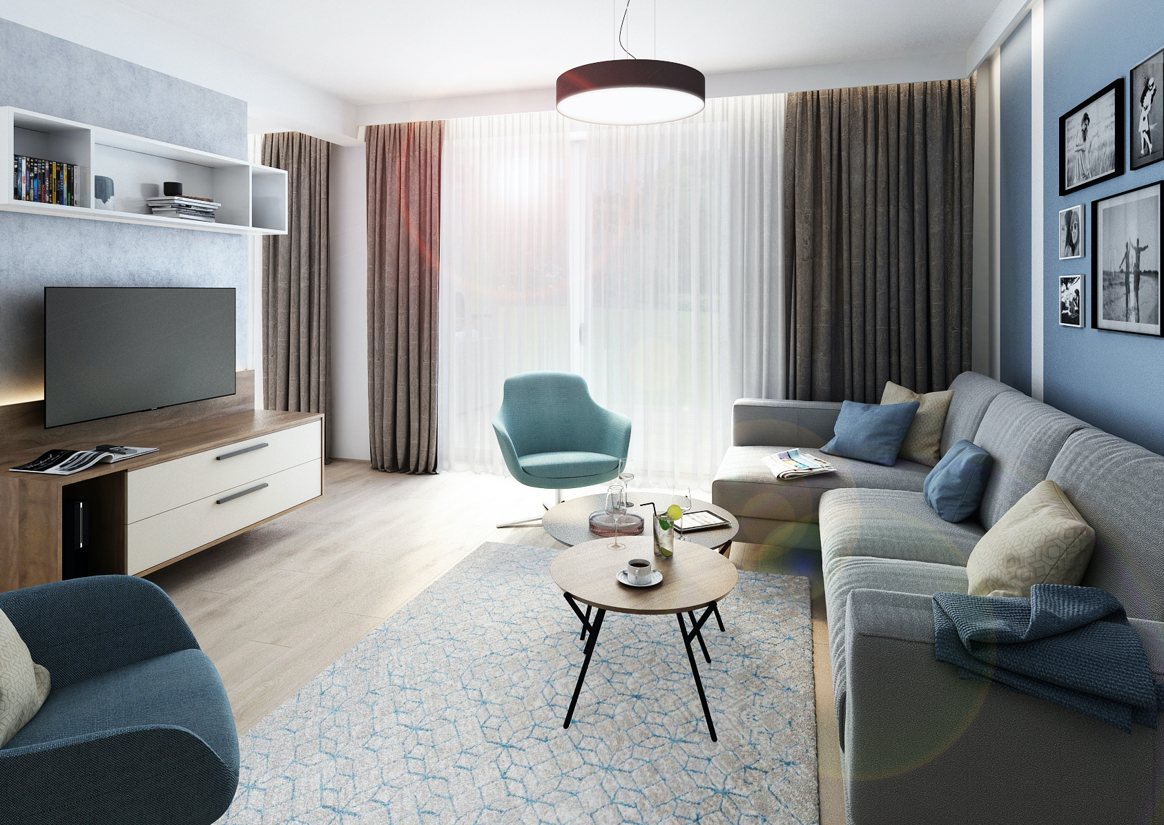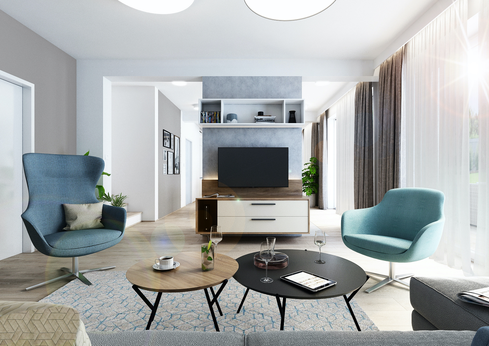 Jednoduchý design obývacího pokoje, který je od kuchyně oddělen nábytkovým prvkem, je laděn do šedo-modrých tónů.