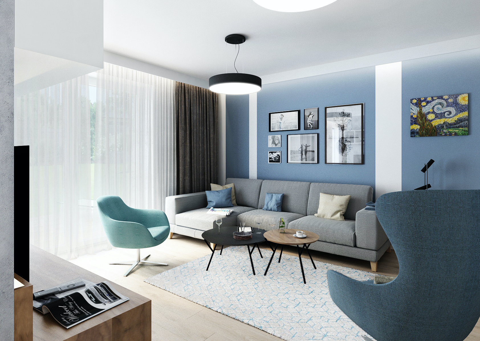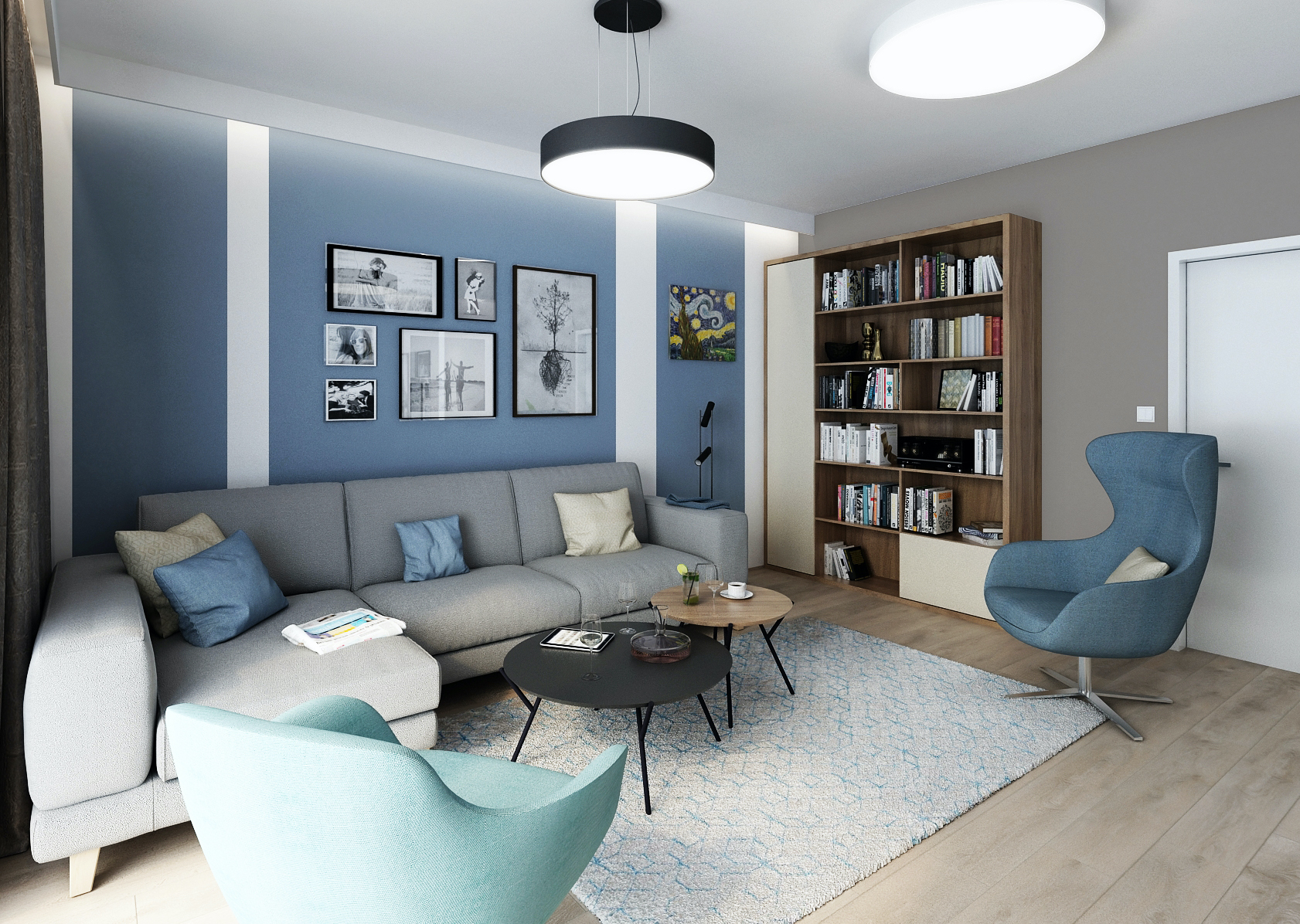 Obývací pokoj s rohovou sedací soustavou v šedé barvě je opět doplněn o modrou v podobě výmalby na zdi či nábytkových prvků a doplňků.