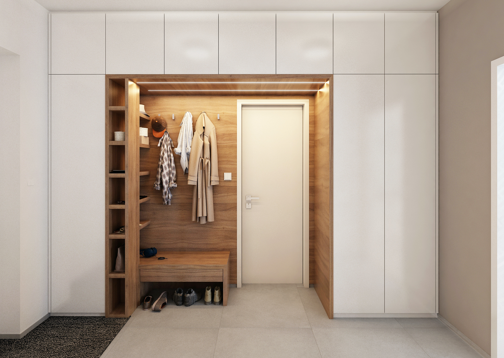 Bytu nechybí ani šatní nika v zádveří, které dominuje bílá barva nakombinovaná s dřevěným obkladem.