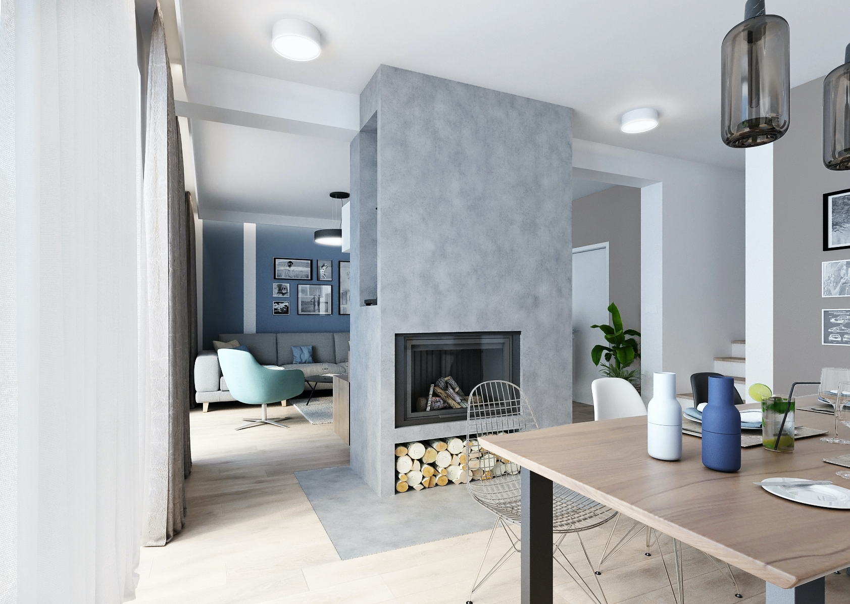Dělící část slouží v první řadě jako krb, který je ze strany kuchyně, z druhé strany jsou naopak vsazena multimédia. Zpestřena je dekorativní betonovou stěrkou, jejíž struktura je napojena i na obklad kolem krbu na podlaze.