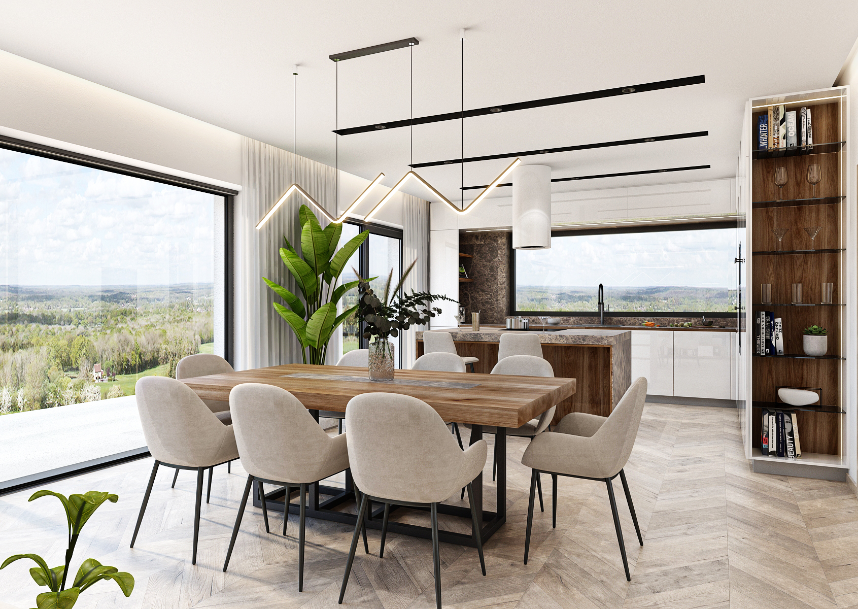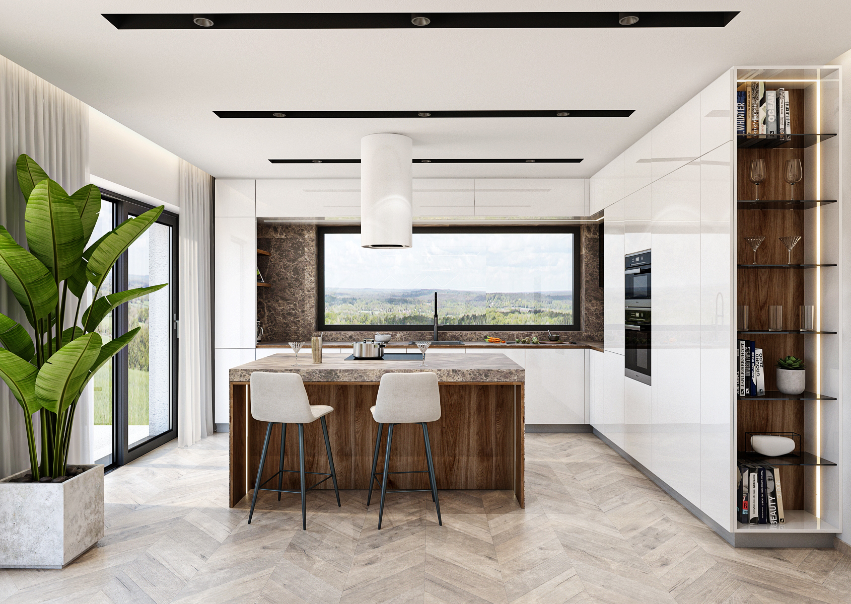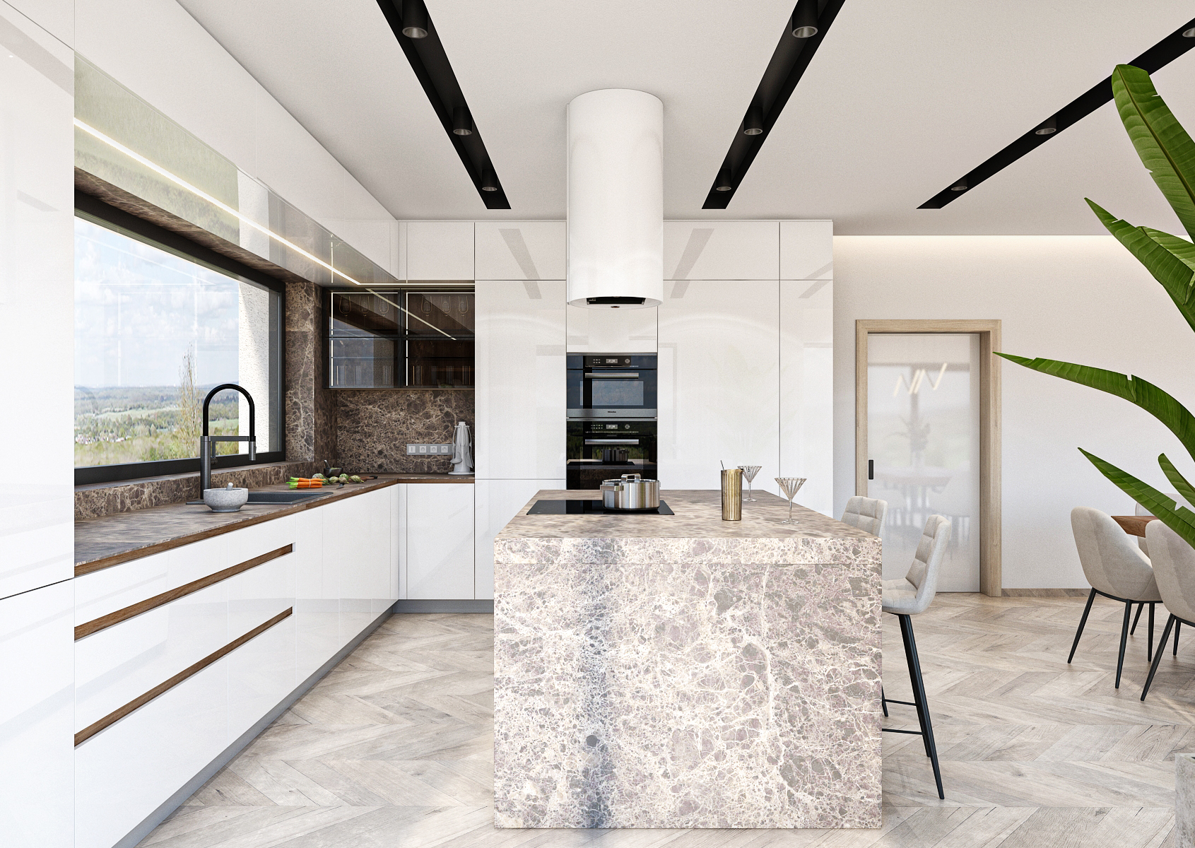 Kuchyňská linka s kamennou pracovní deskou je navržena v bílém lesku s detaily z tmavé ořechové dýhy. Tou je zdobená i celá spodní část kuchyňkého ostrůvku, která mimo jiné nabízí i dvě místa k sezení. Jídelní stůl z masivního dřeva a kovovou podnoží nabízí více jak šest míst v podobě čalouněných křesílek. Stůl je osvětlován originálními závěsnými svítidly, kuchyně pro změnu zabudovanými bodovými světly.