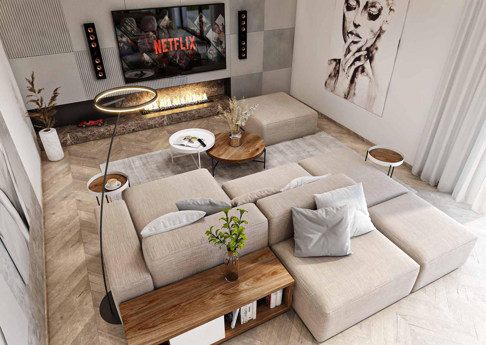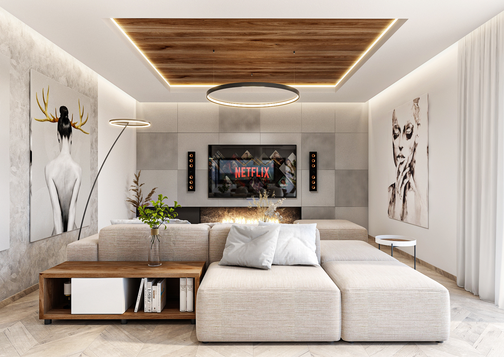 Obývací pokoj je vybaven modulární sedací soupravou, která umožňuje jak sezení ve směru ke stěně s televizí, tak i do části s kuchyní a jídelnou. Stěna za televizí je obložena čtvercovým obkladem, pod nímž se nachází zabudovaná krbová kamna.