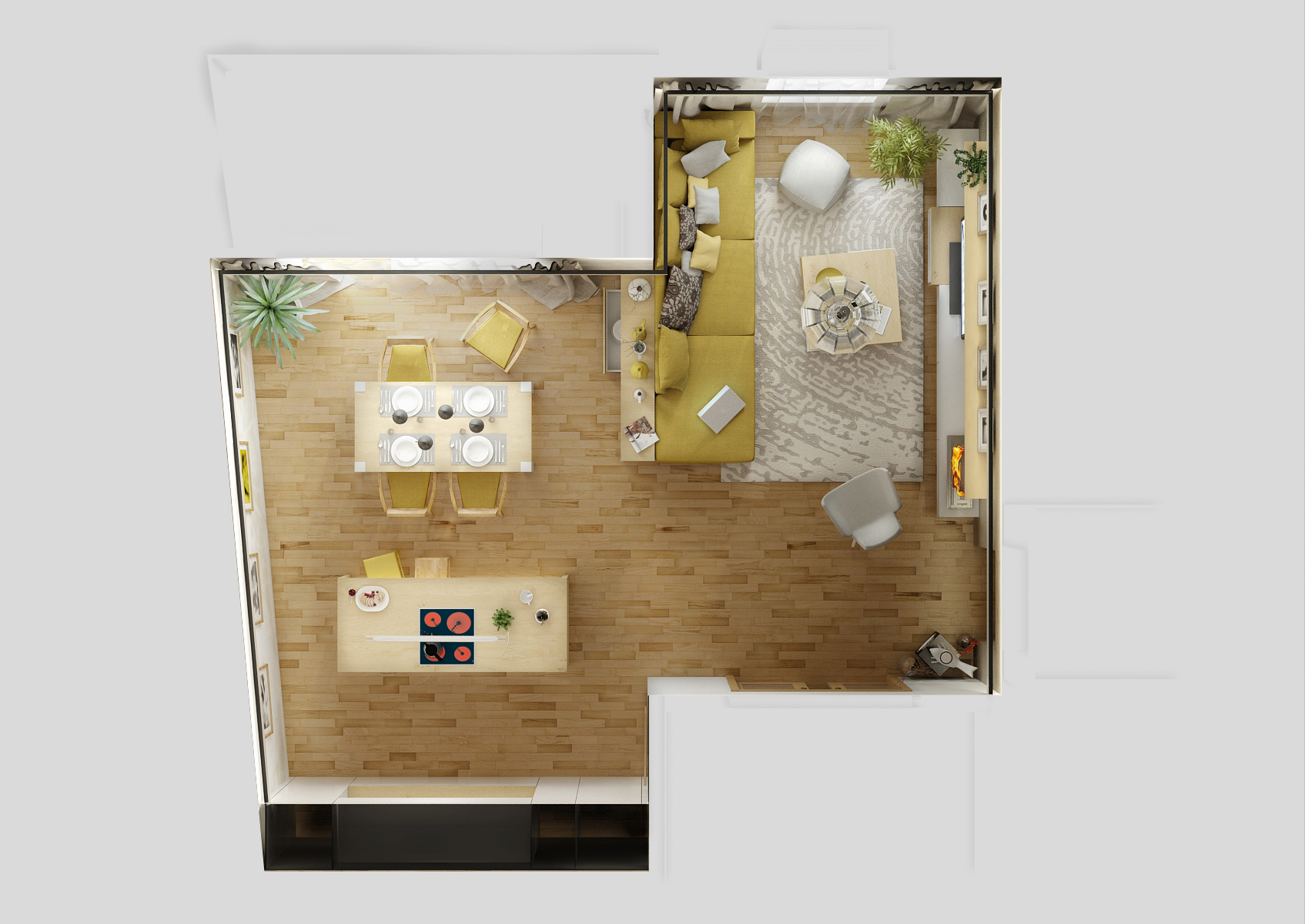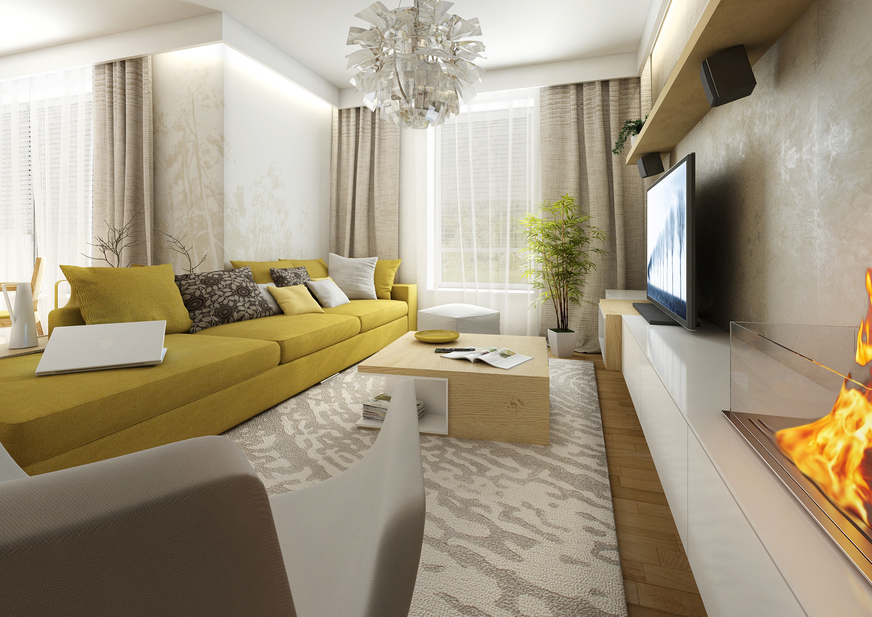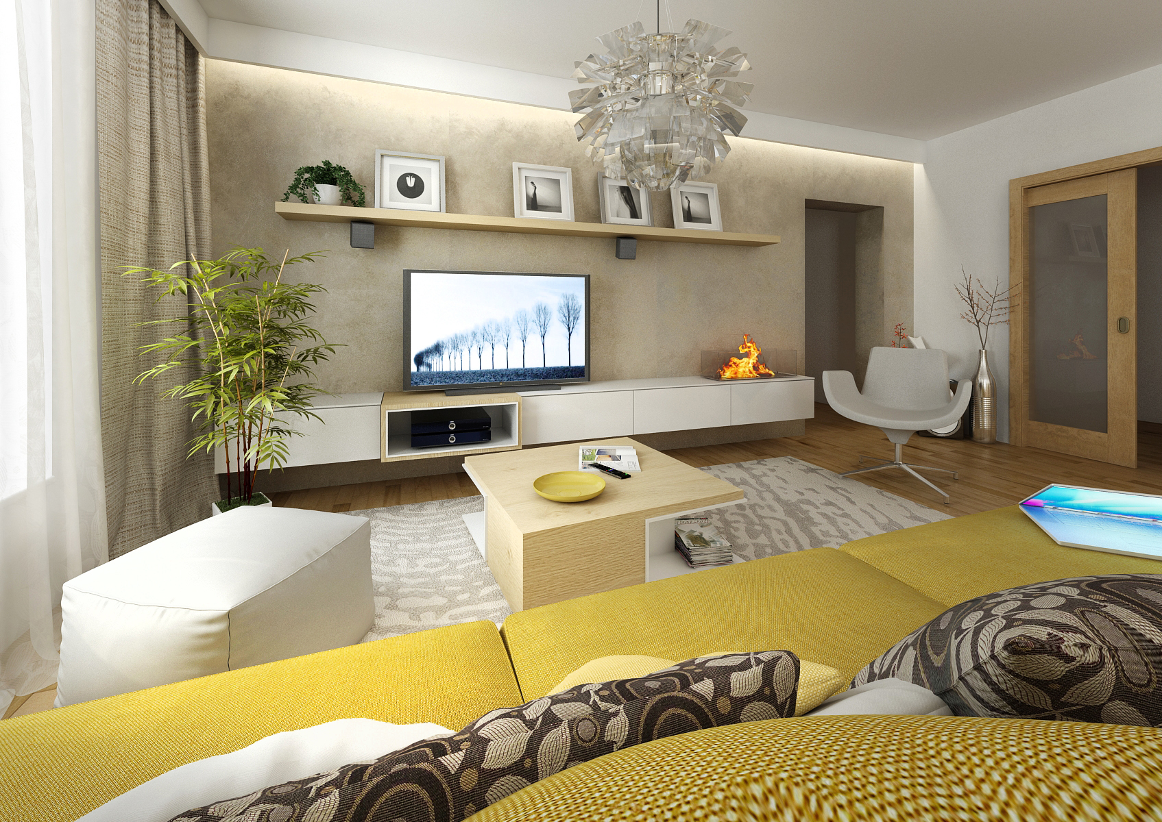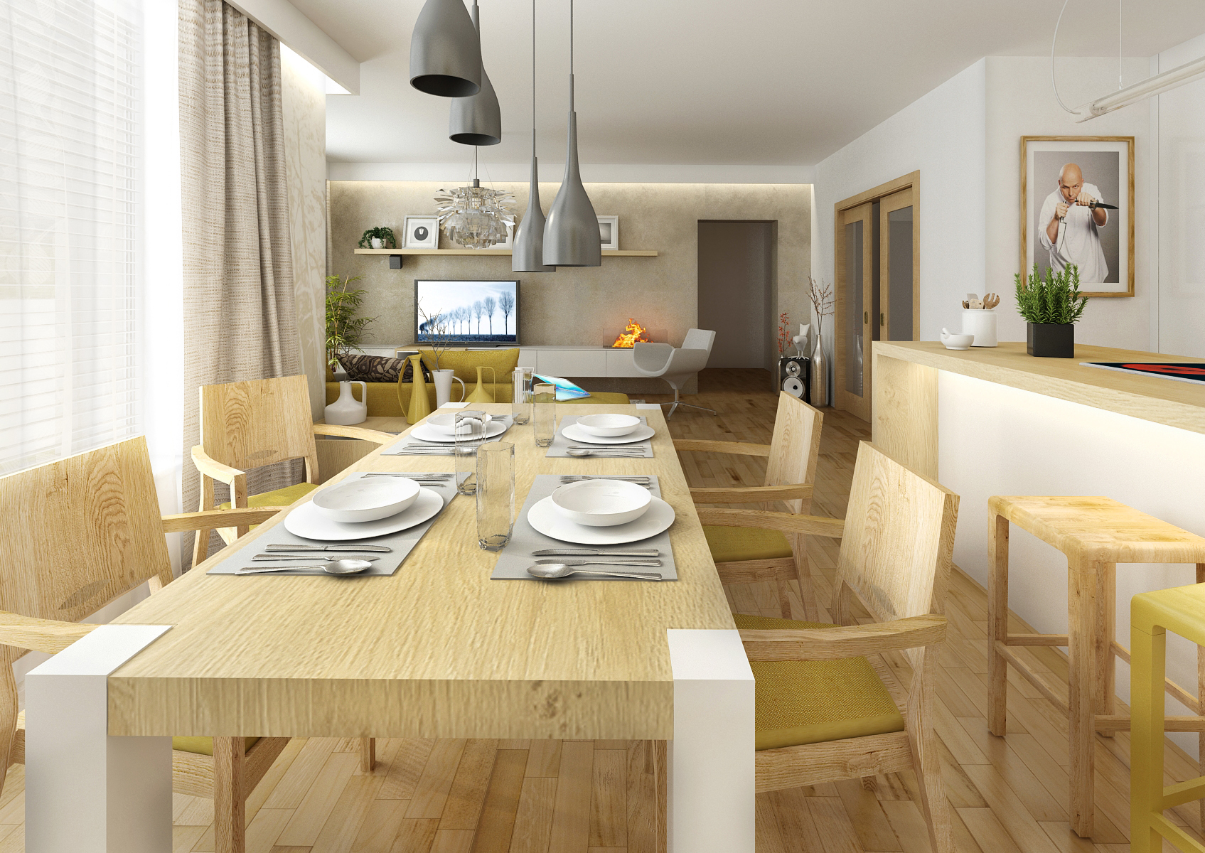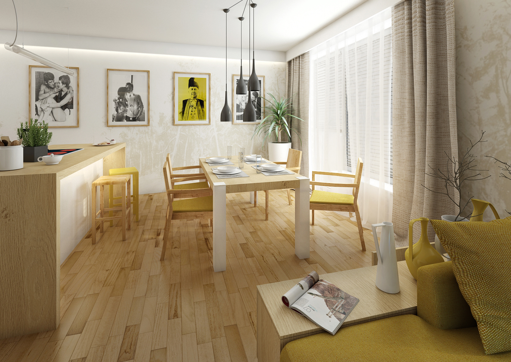 Nejvýraznějším prvkem obývacího pokoje a jídelny je sedací souprava v hořčicově žlutém odstínu. Interiér dotváří krémová barva stěrky, obrazová tapeta Tres Tintas a žluté doplňky. Prostor v kombinaci s bílou a světlým dřevem působí moderně a útulně.