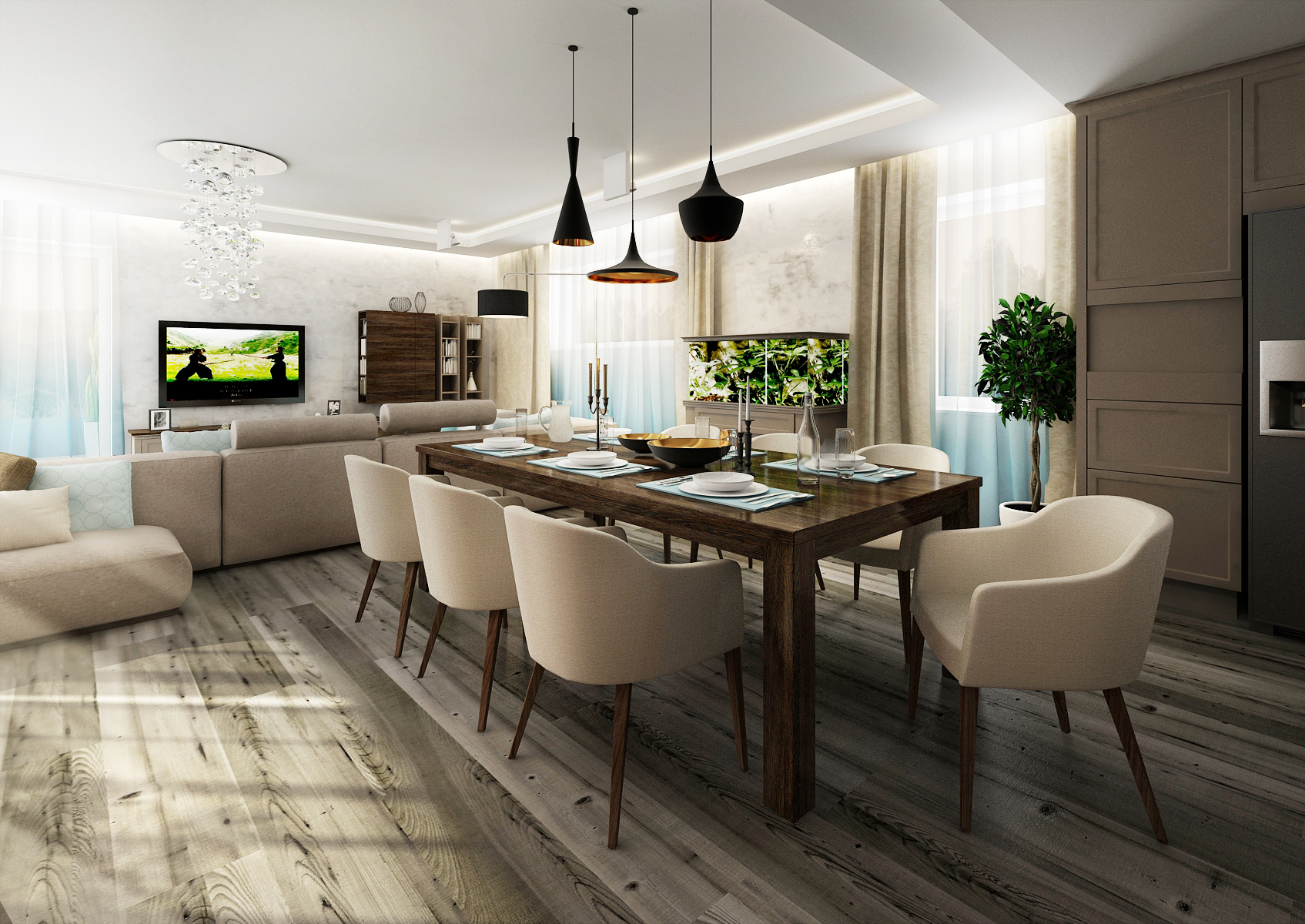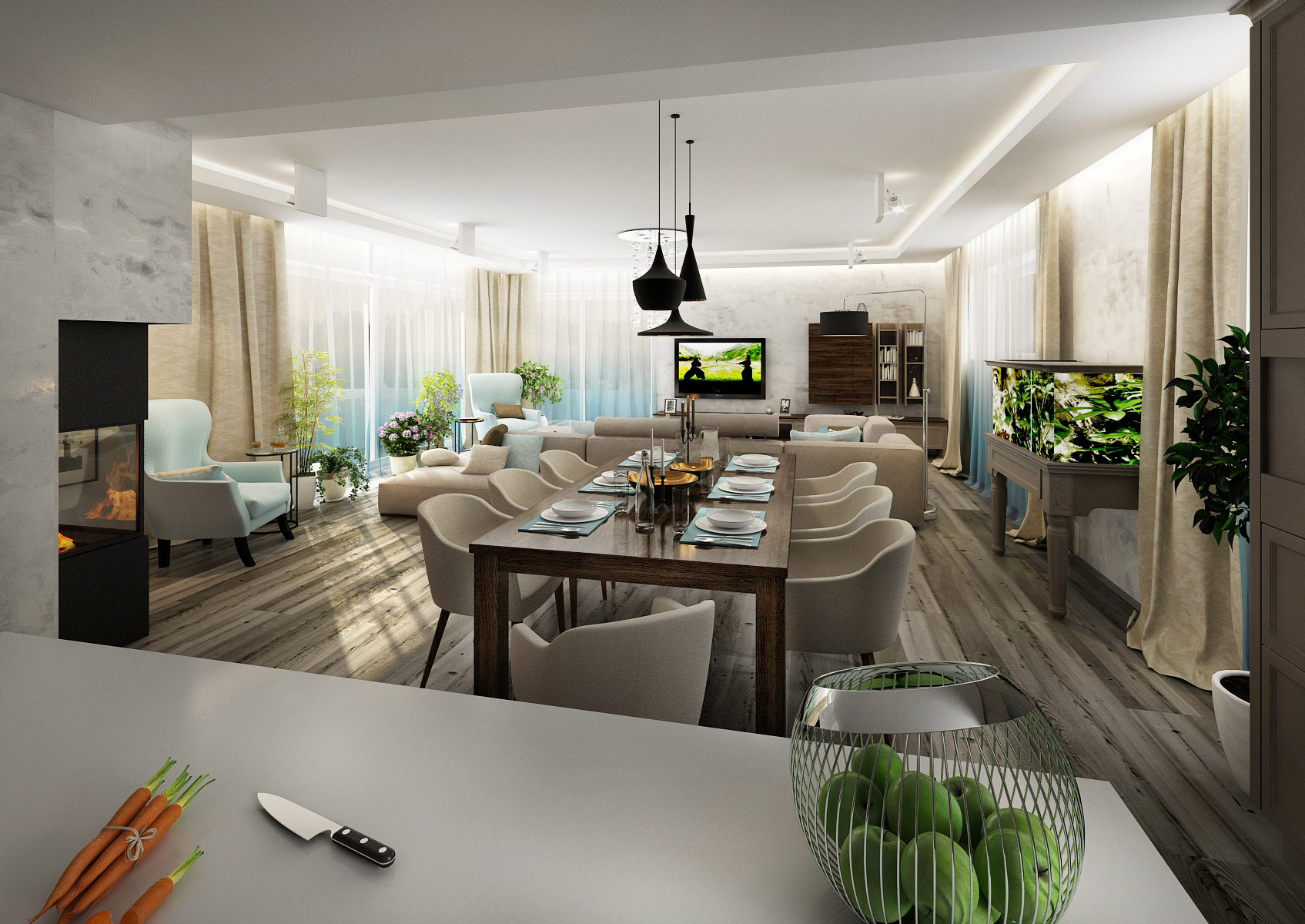 Moderní obývací pokoj s akváriem
