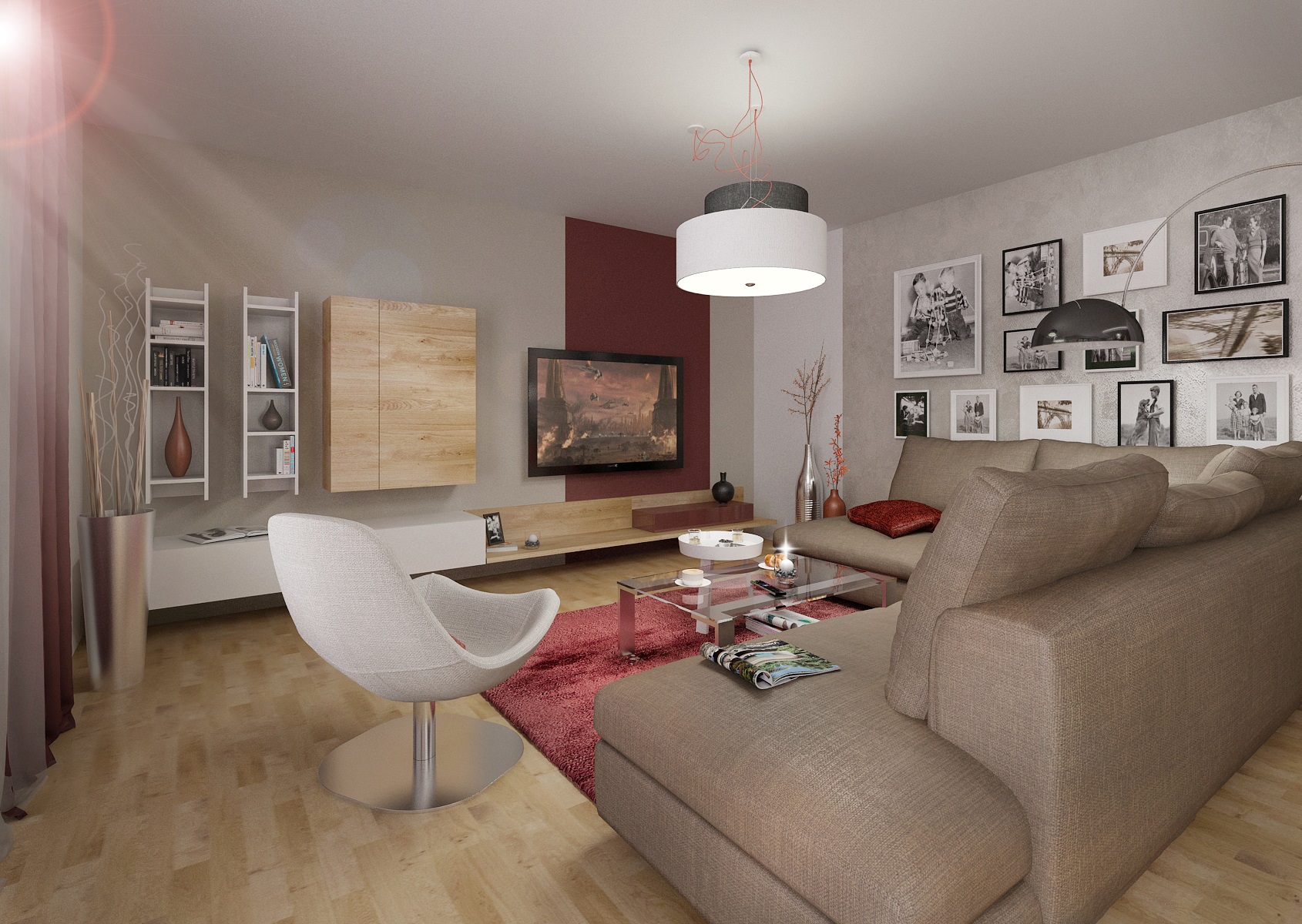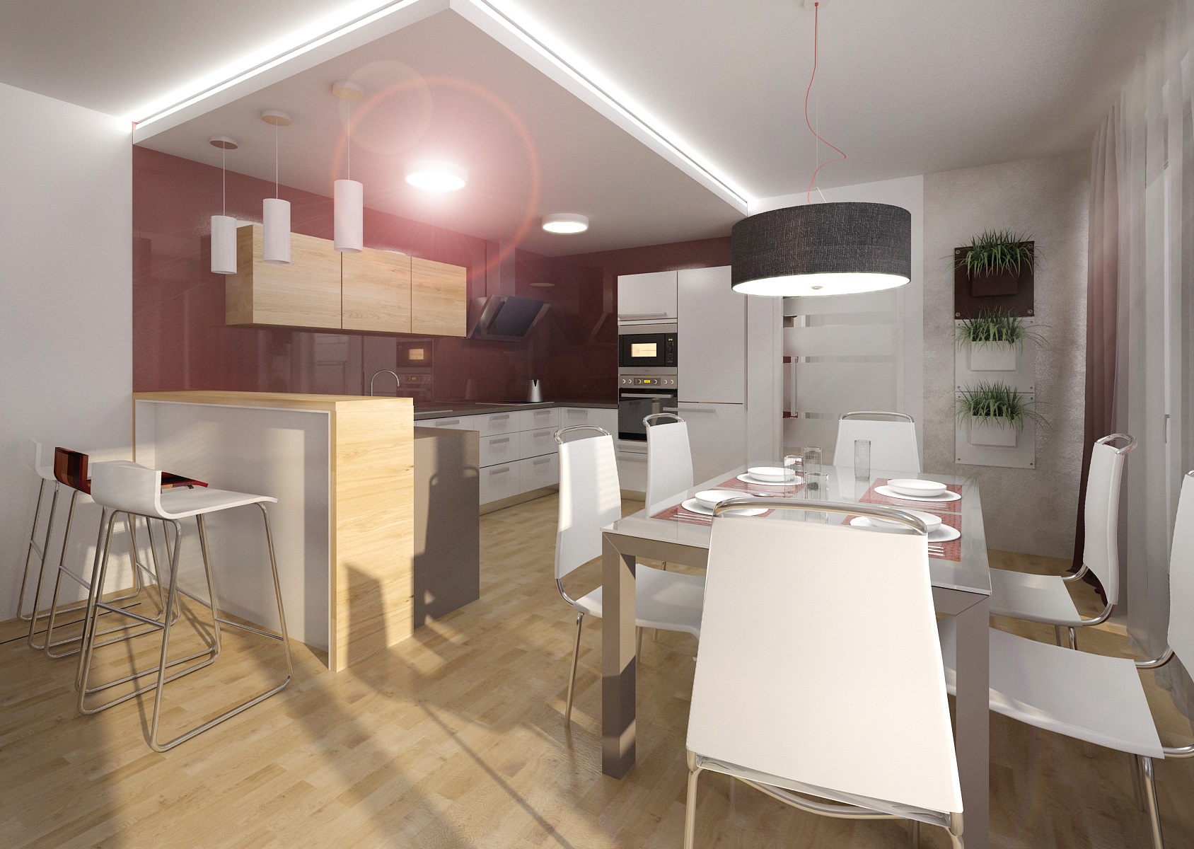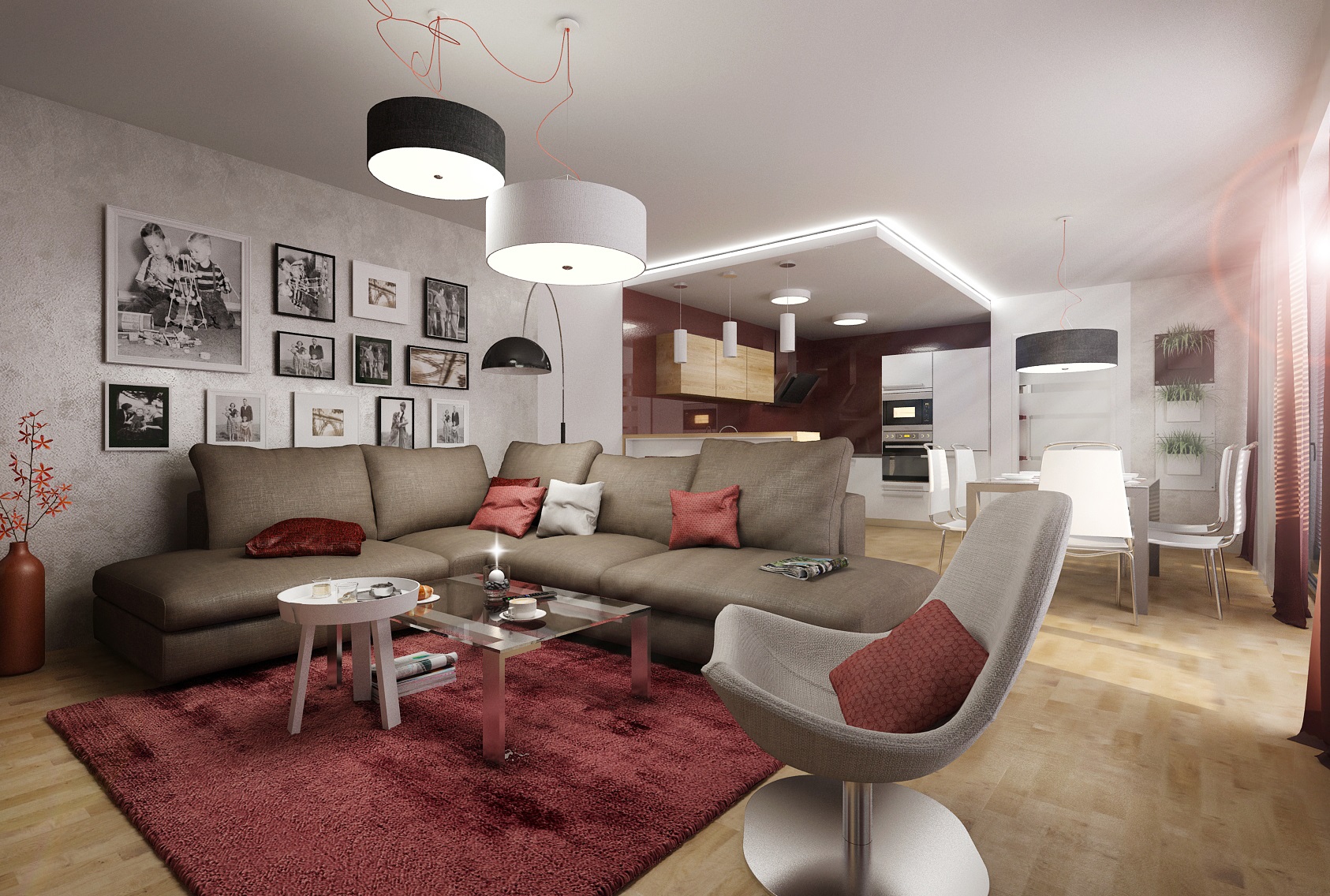 Prostor provází vínová barva, která se objevuje na skleněném obkladu v kuchyni, koberci, textilu, výmalbě i dekoracích. Dále je použita šedobéžová stěrka, hnědá sedačka a z prvků např. jídelní stůl a židle od firmy Calligaris.