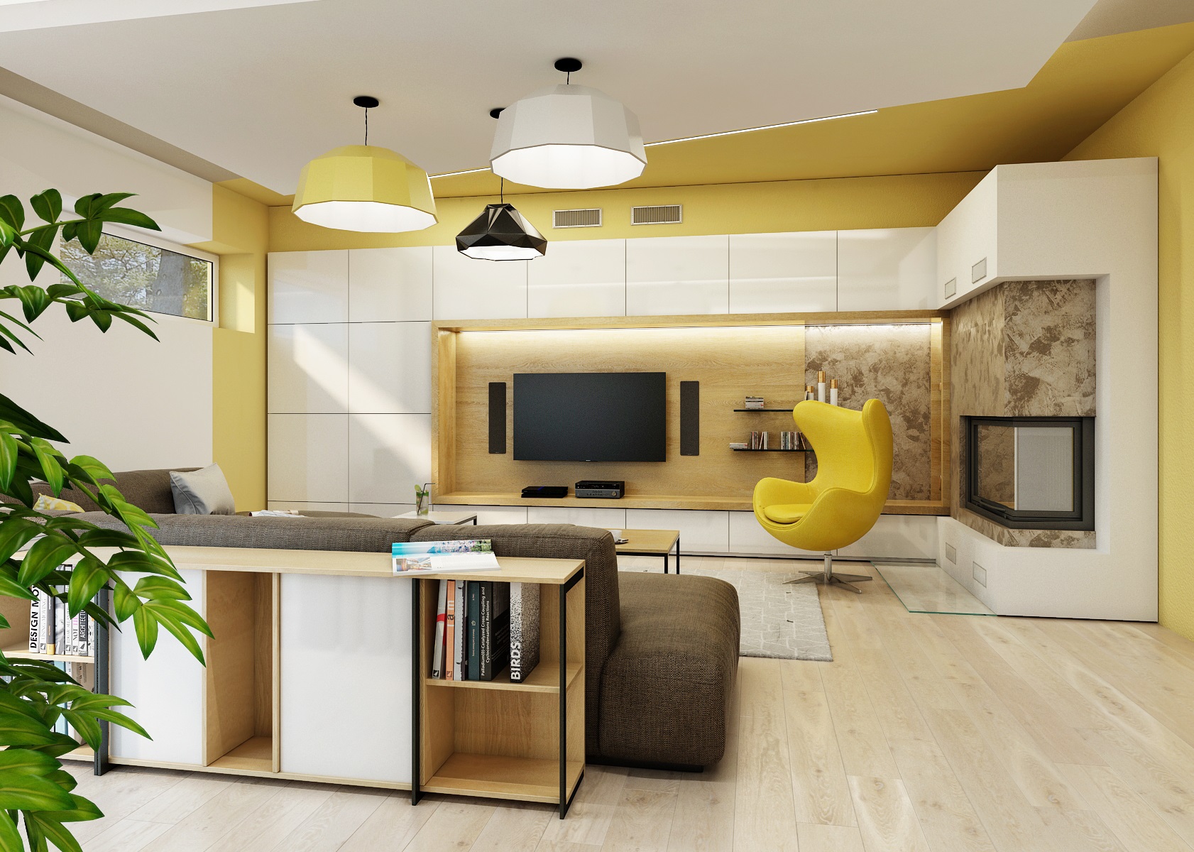 byla propojena televizní stěnu s rohovým krbem skrze hnědou dekorativní stěrku a bílou vyzdívku, na kterou navazují spodní a horní úložné prostory. Stropní podhled nad sedací soupravou je netradičně lichoběžníkového tvaru, který udal linii barevného rozdělení stropu. Část na Tv je hořčicově žlutá, snížený podhled v bílé, zbytek průchozích zón v pískové. Navazující prostor kuchyně s jídelnou má opět bílý celoplošně snížený stropní podhled.