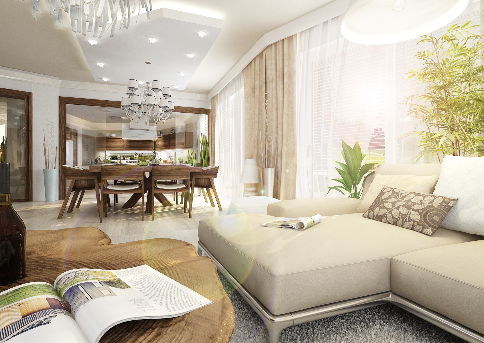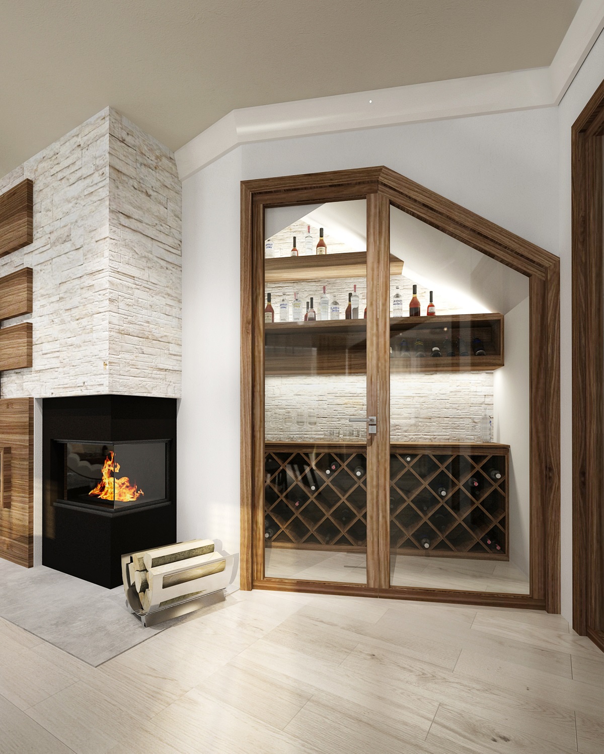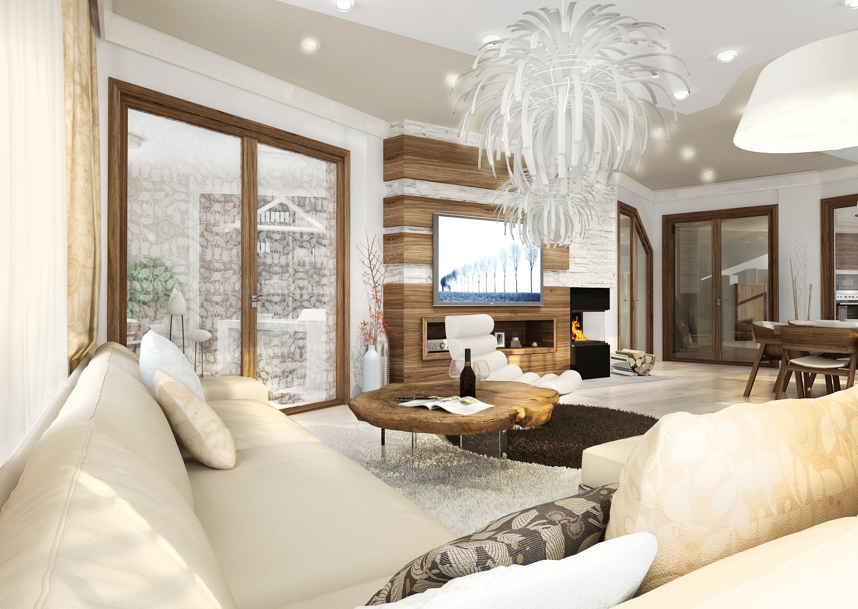 Obývací pokoj se vším co by měl mít…Velká rohová sedací souprava Poliform – Park, rohový krb s přilehlou vinotékou, velký čtvercový jídelní stůl s židlemi TON Merano v americkém ořechu, křeslo OVO od Vespera, podlaha bělený dub, nábytek ořech a štípaný kámen na obložení krbu. Vše v rustikálním moderním pojetí.