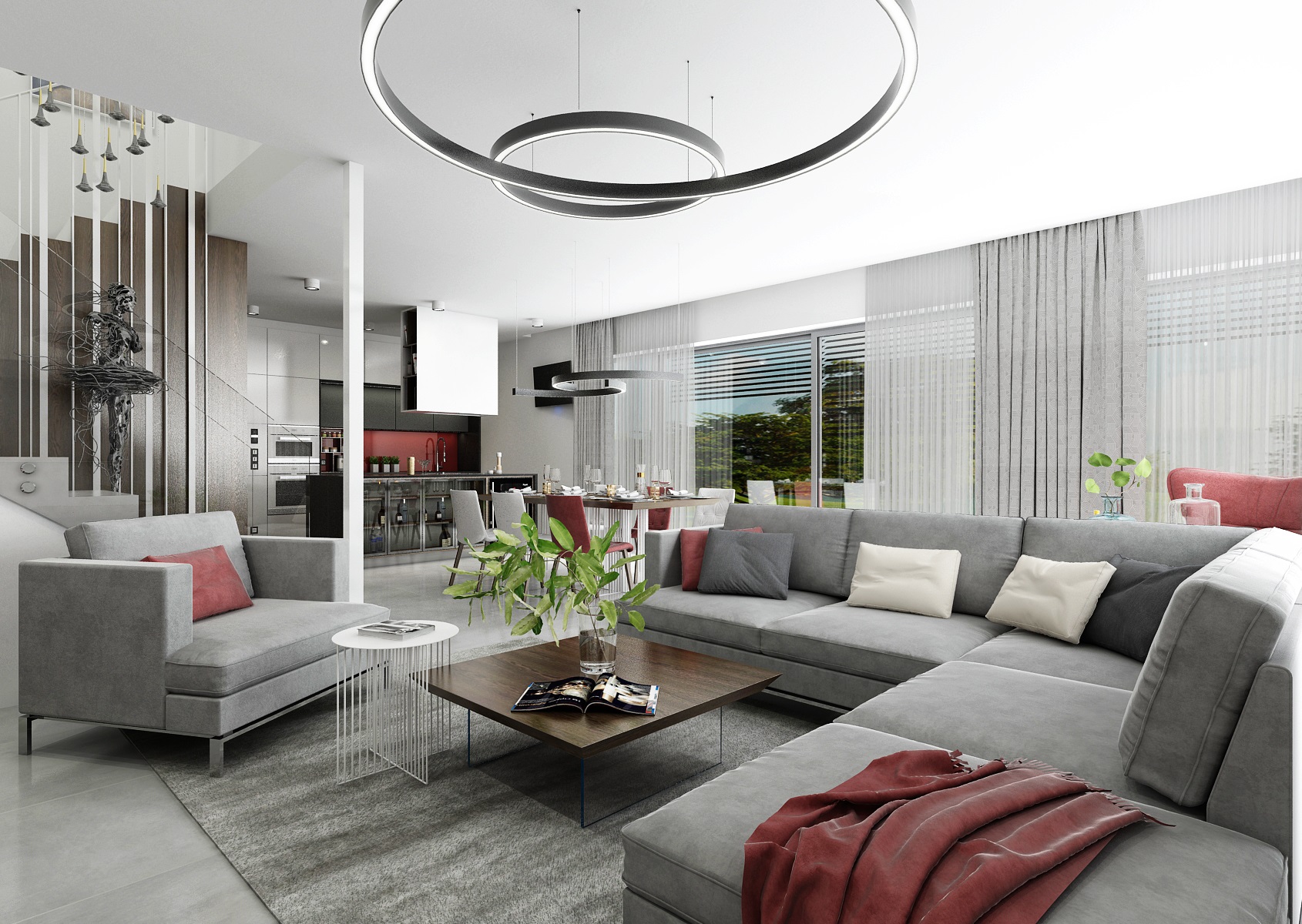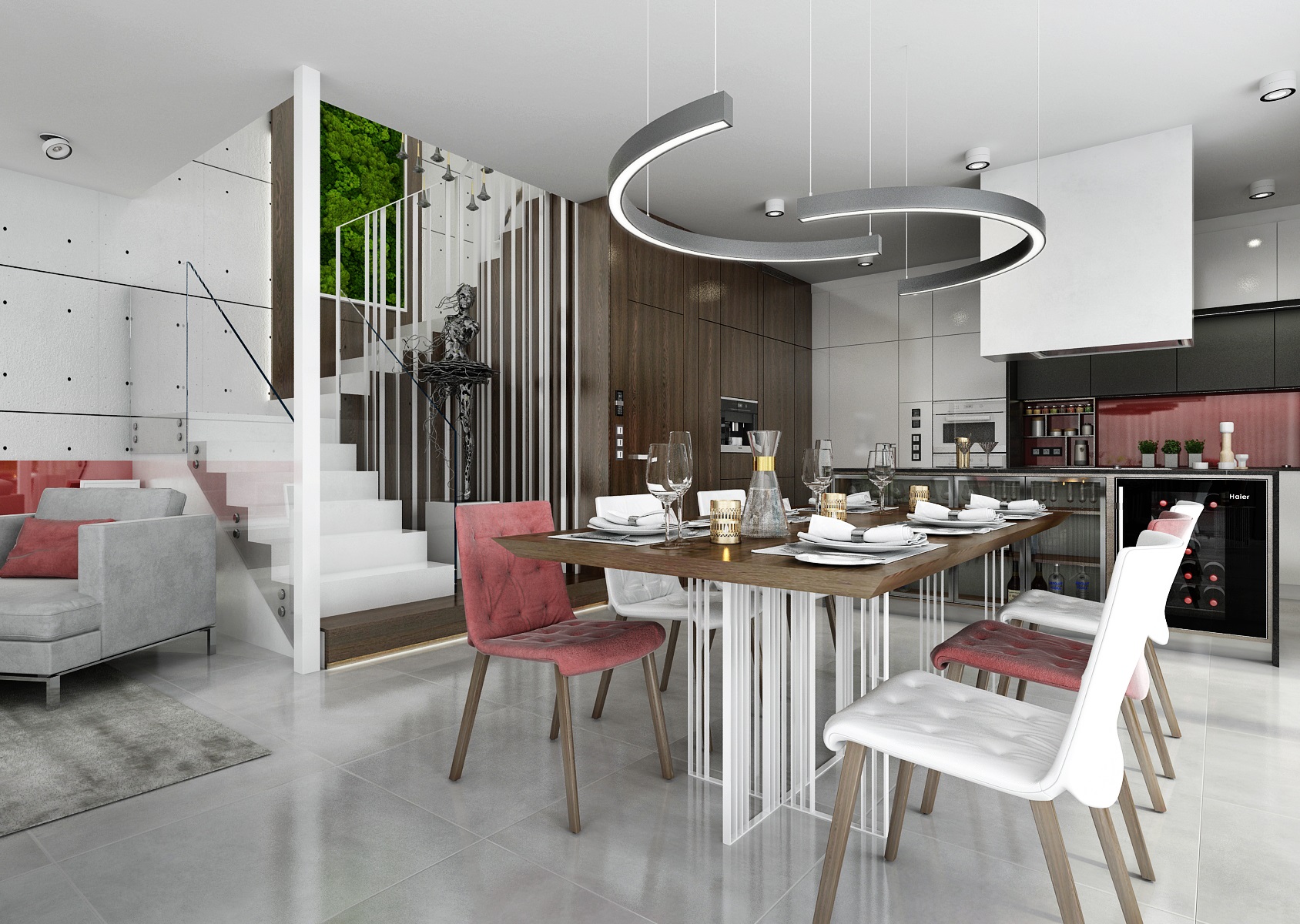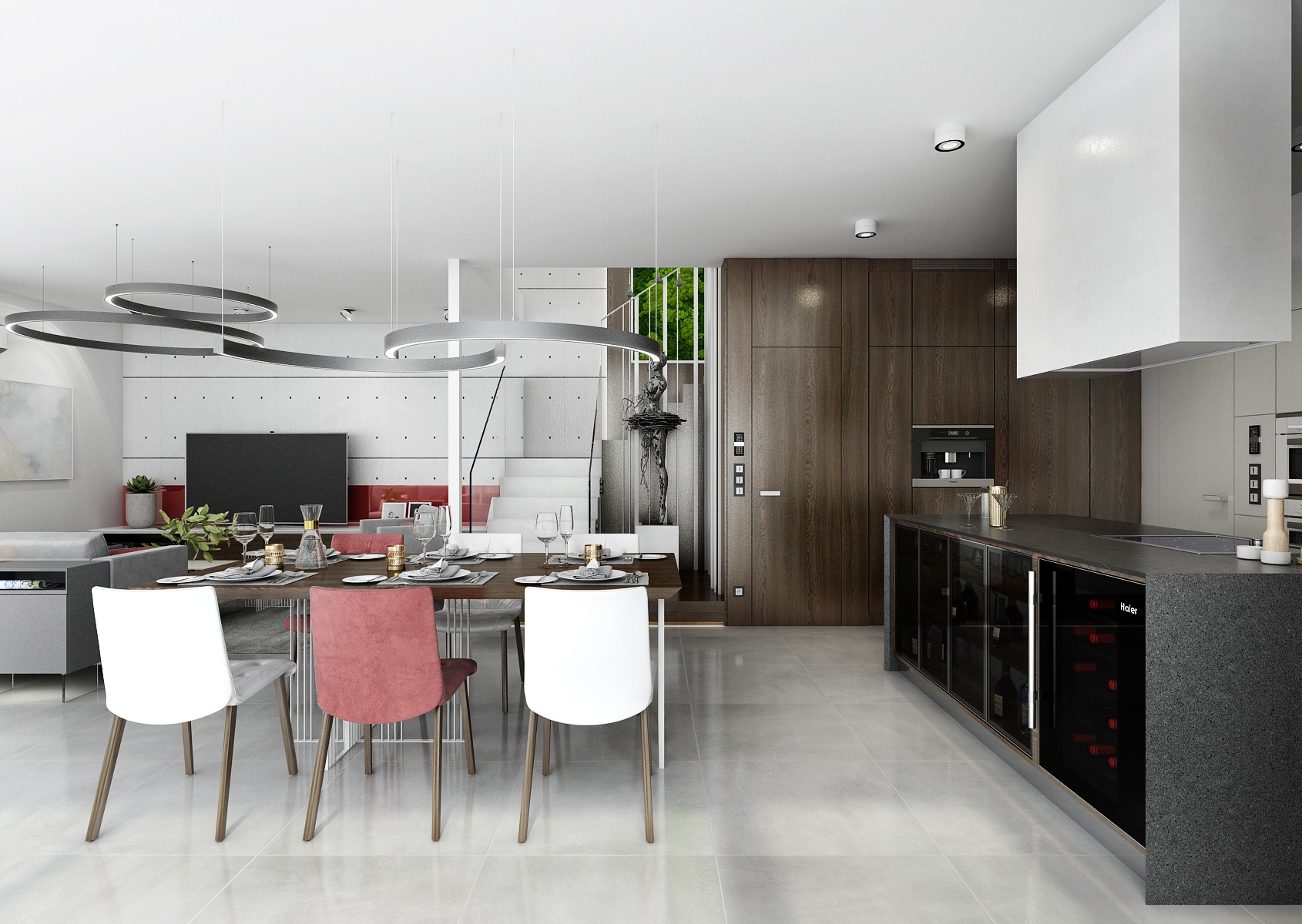 Osvětlení zajišťují LED kruhová svítidla RINNGO S a nad jídelním stolem oblouky SEGGMENT WAVE.