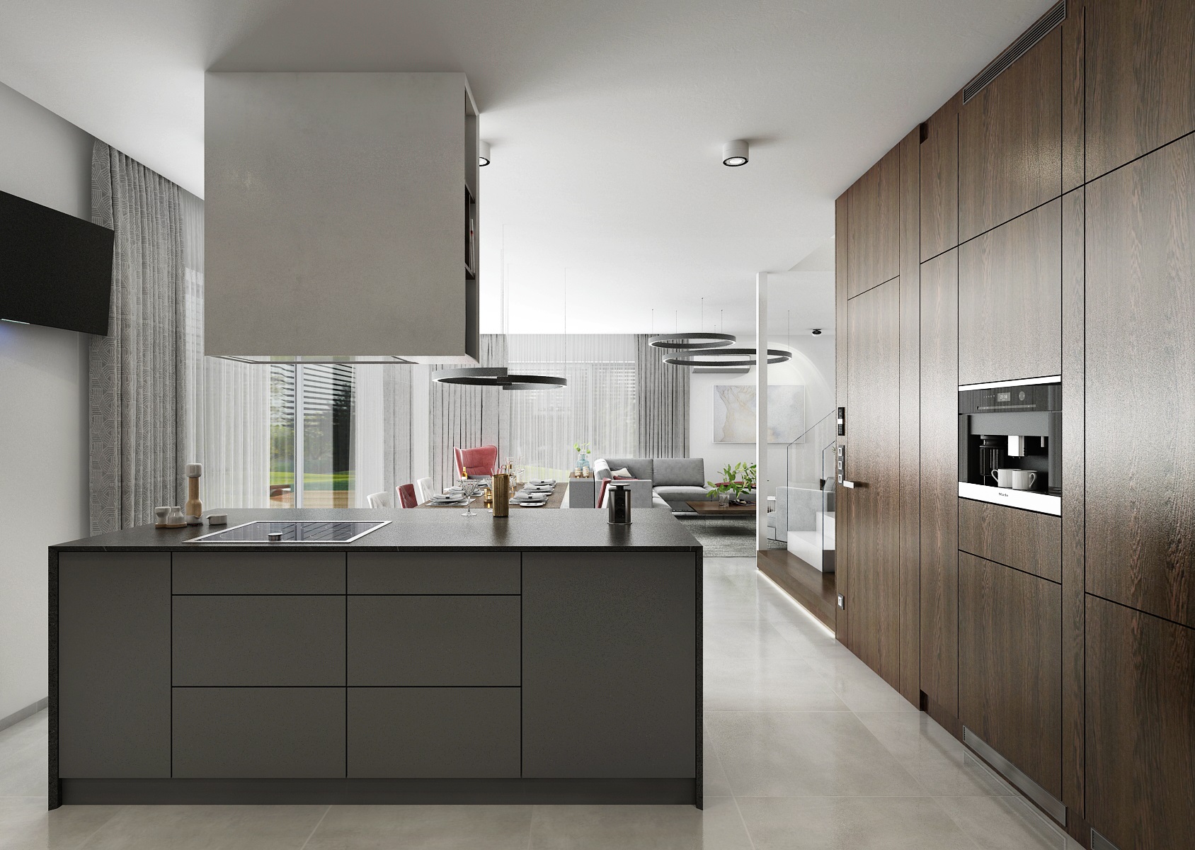 V celém prostoru dominuje bílá a šedá barva, která je použita na dlažbě (AC Dwell Gray), potah sedací soupravy i nábytku (PerfectSense Mattt šedá). Protiváhu ke světlému obývacímu pokoji najdeme v kuchyňské části, kde dominuje tabákový dub na vestavné skříni a obložení navazující na schodiště, spolu s černým kuch. ostrůvkem z umělého kamene.