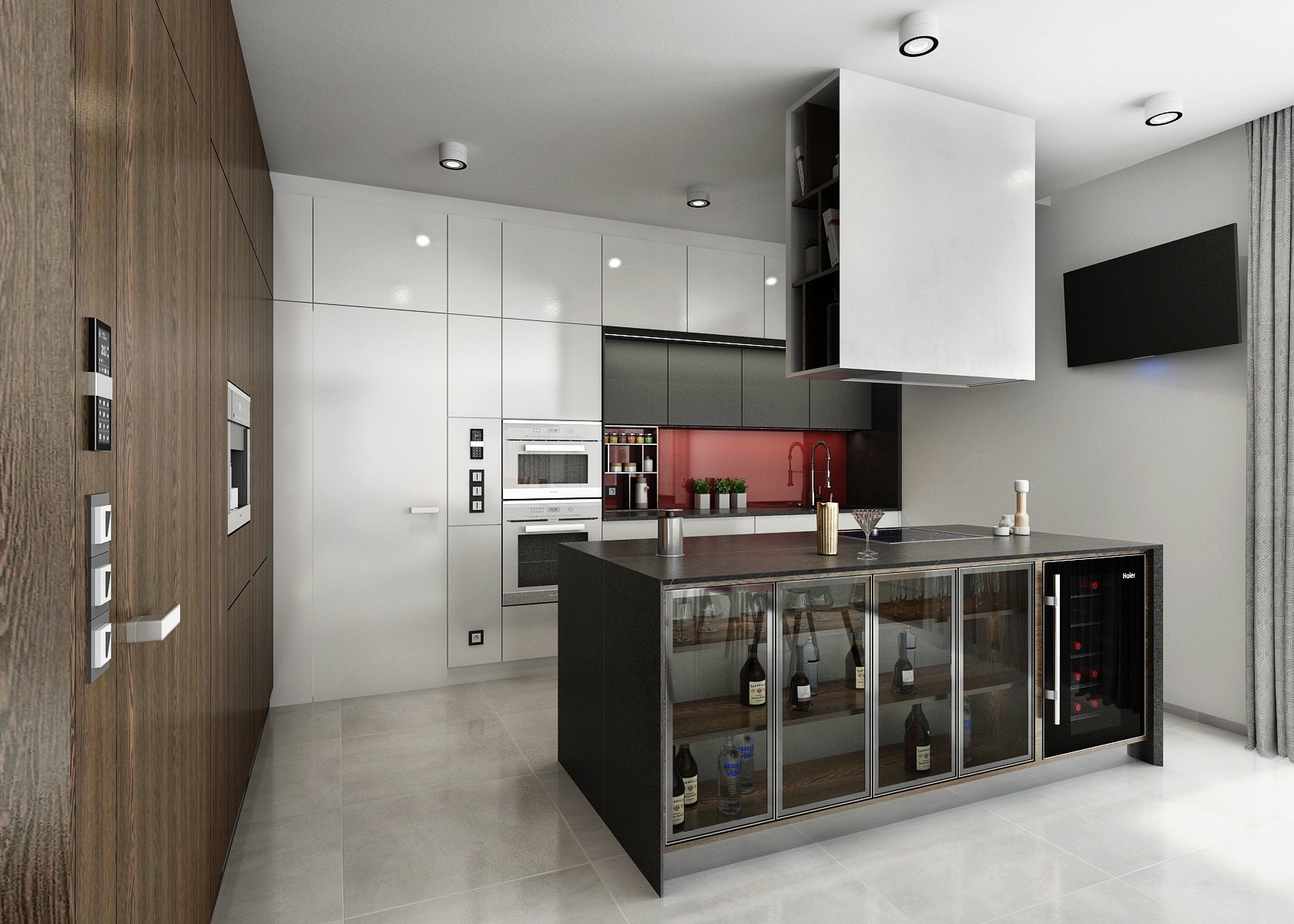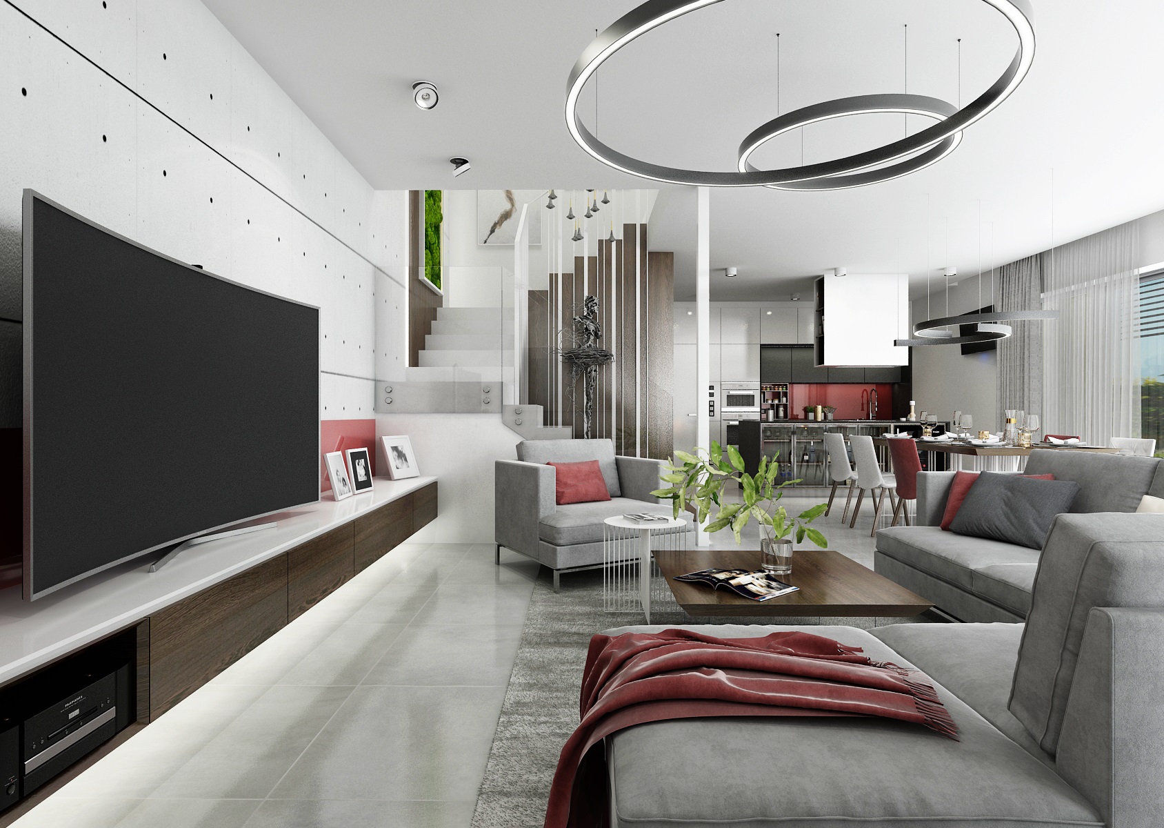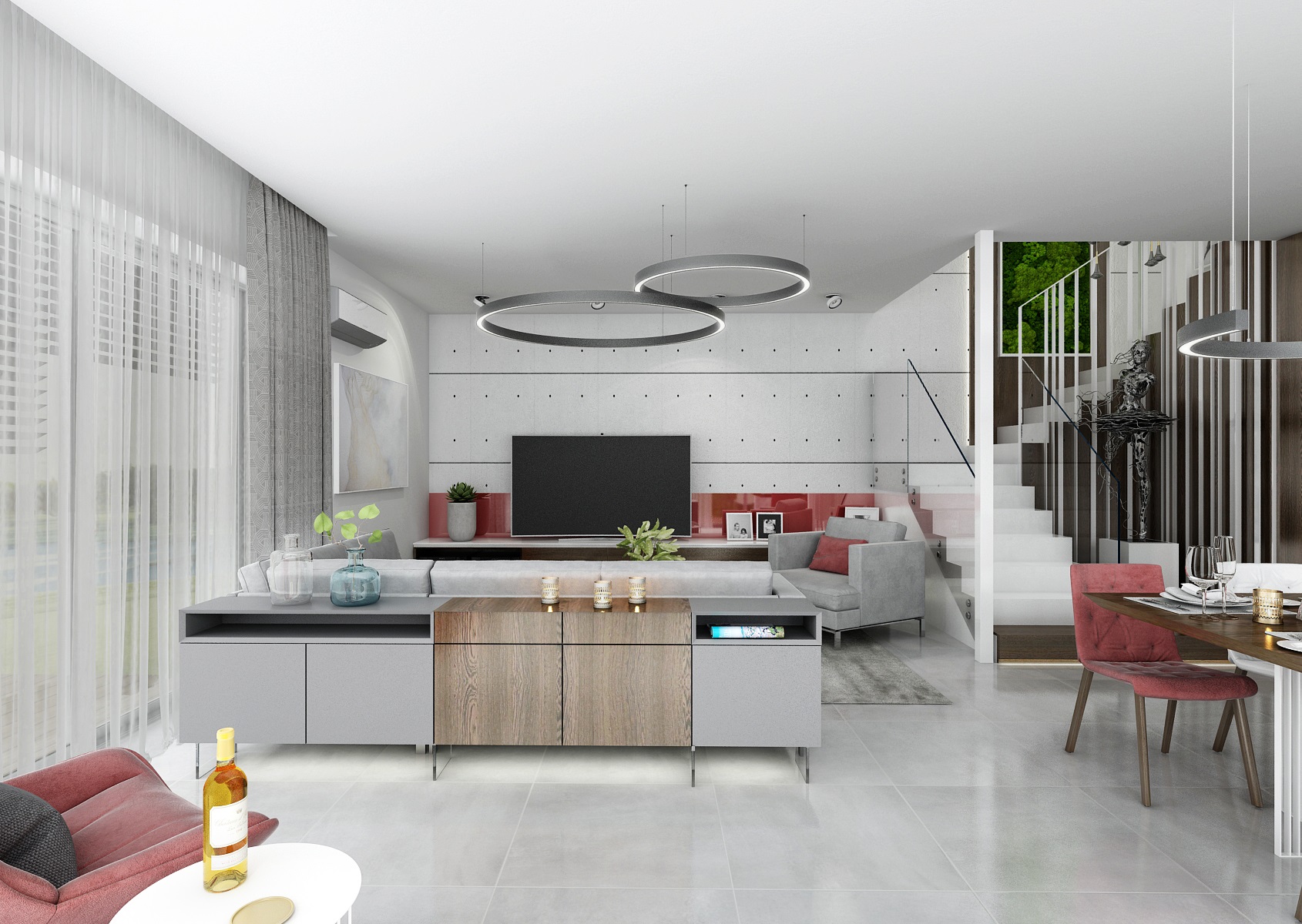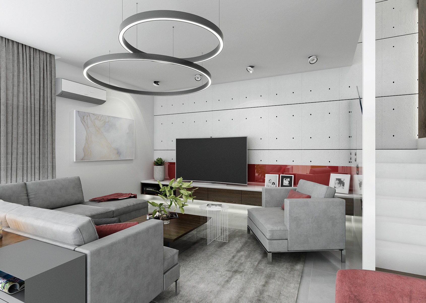 Návrh moderního téměř monochromatického interiéru se stěnou s pohledovými betonovými panely, výrazným akcentem červené a tabákového dubu.