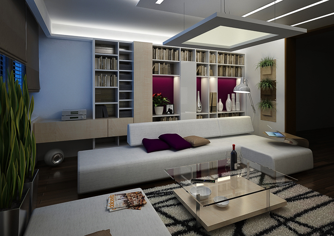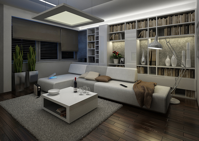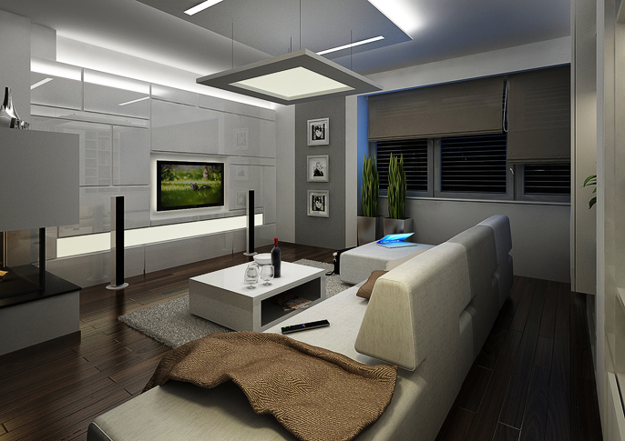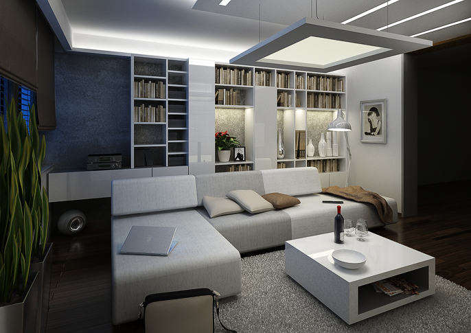 Obývací pokoj v elegantním minimalistickém provedení. Dominuje zde bílá barva ve vysokém lesku, která je v kontrastu s tmavou dřevěnou podlahou. V místnosti se hodně využívá nepřímého osvětlení zabudovaného v podhledu, tak i v nábytkových sestavách.