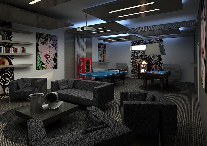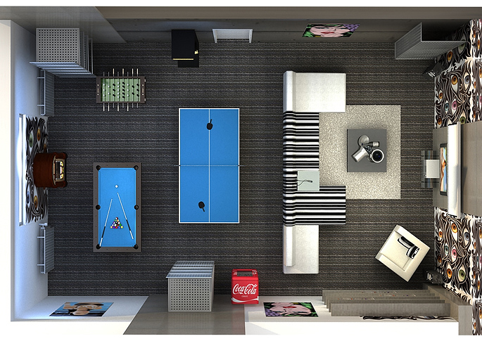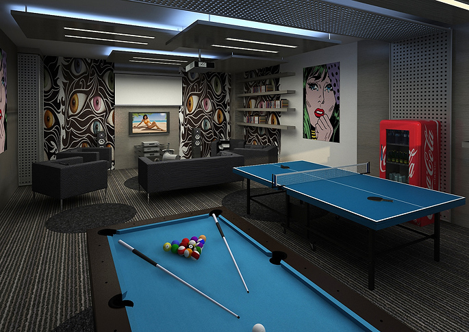 Atypické pojetí obývacího pokoje ctí rčení Kdo si hraje, nezlobí. Z klasického obýváku zůstala jen sedací část v kombinovaném provedení Systemi. Unikátně a kreativně vytvořený interiér s hracími stoly a automaty umožňuje rozjet tu pravou zábavu.