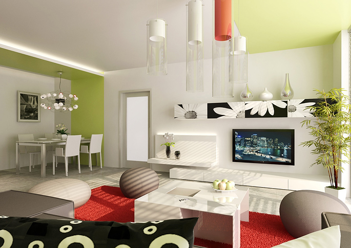 V části interiéru, která je vyčleněna pro obývací pokoj, je použito nápaditých svěžích barev, dekorů a motivů, které se navzájem doplňují. Pozornost byla soustředěna zejména na řešení prostoru k odpočinku a relaxaci. Dostatek denního světla zajišťují velká okna umožňující výhled do zahrady.