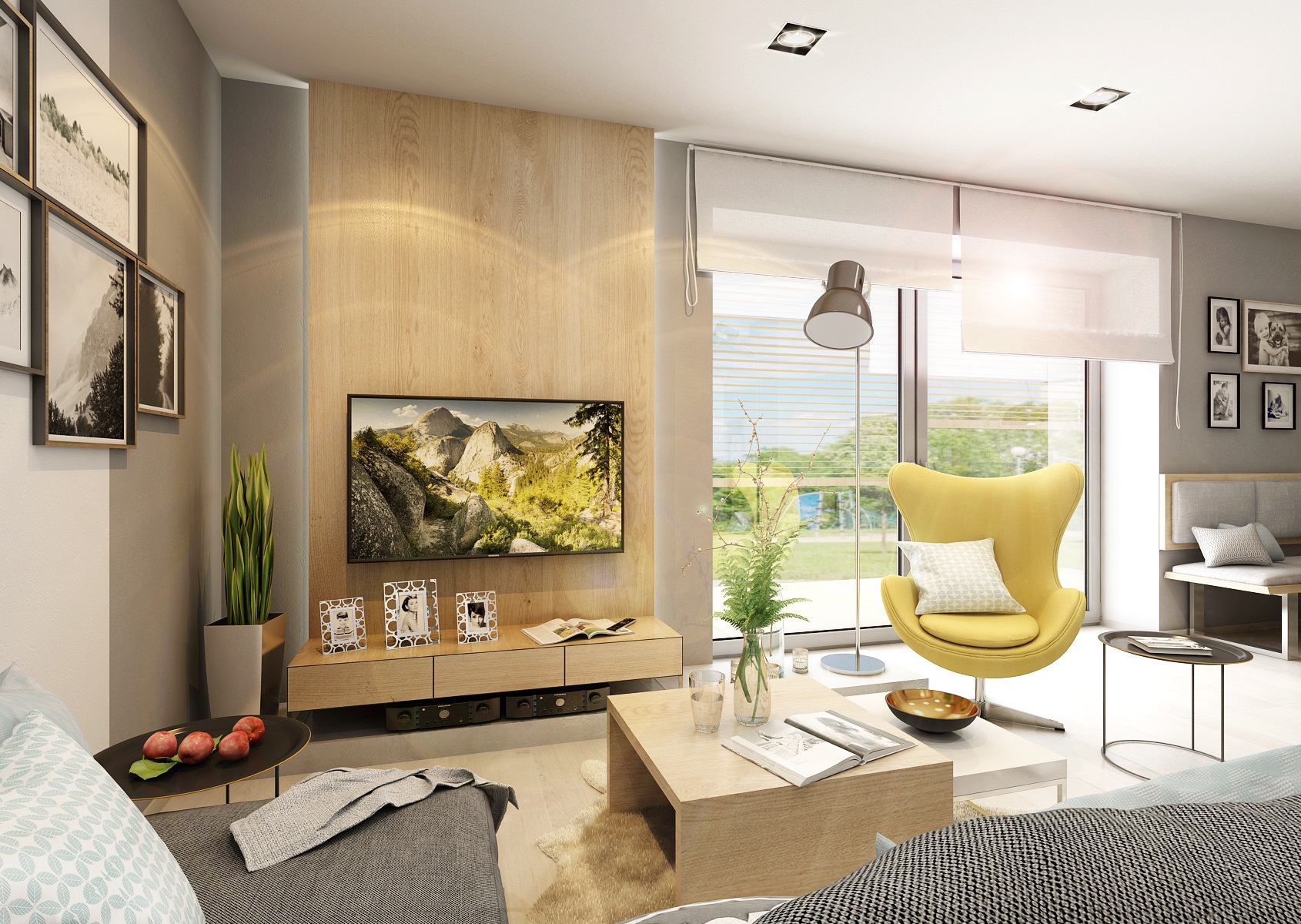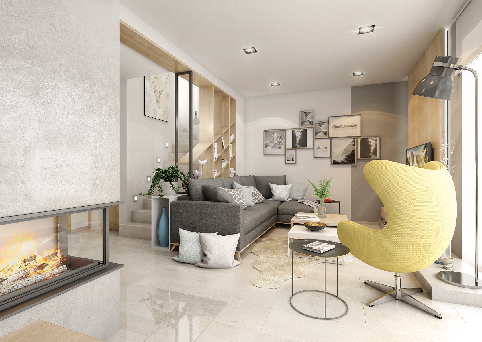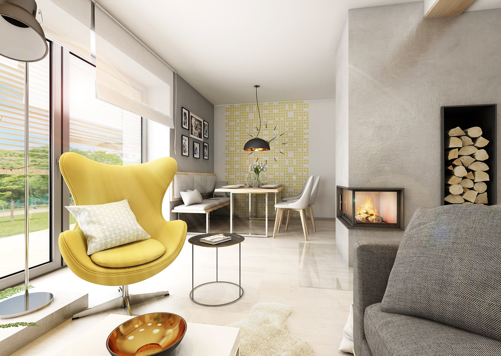 Kombinace přírodního dubu a více odstínů teplé šedé je v současné době velice oblíbená. Prostor jemně doladí žlutá, přidaná formou čalounění křesla Egg a vzorované tapety na pozadí jídelního koutu.