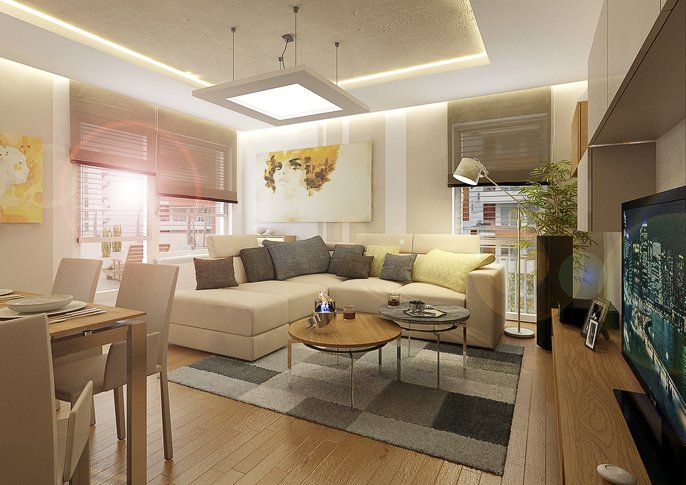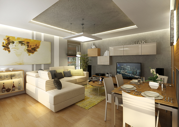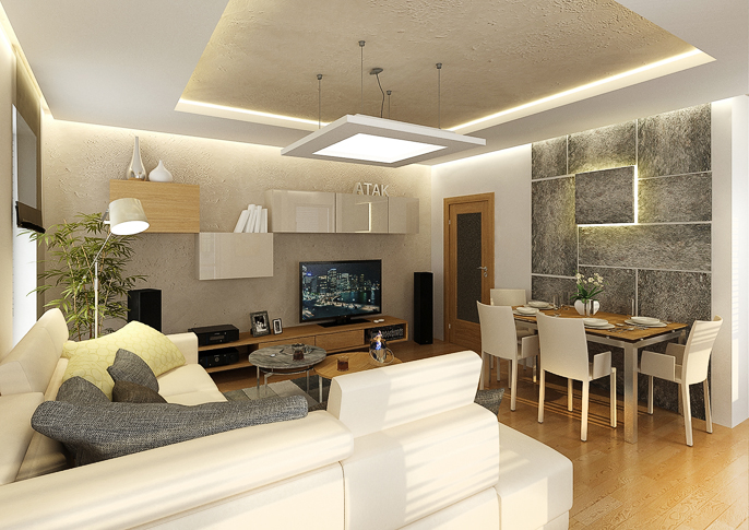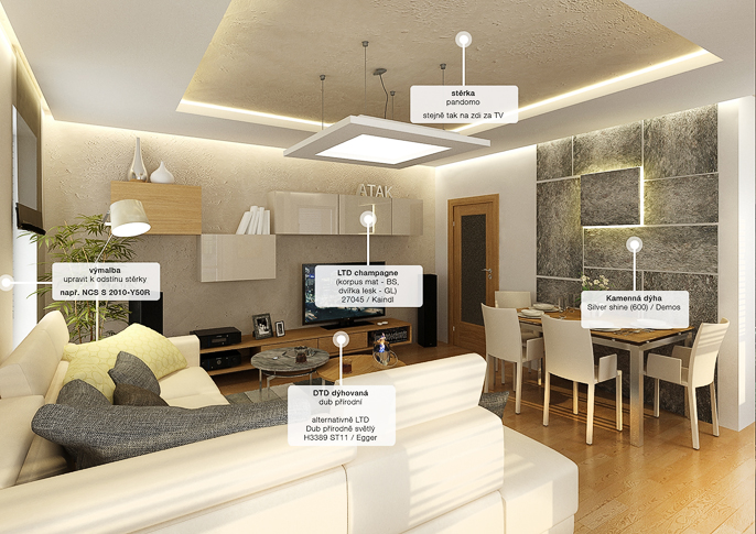V tomto návrhu je použita kamenná dýha na obložení stěny v kombinaci se dřevem. Vše je ještě doplněno betonovou stěrkou na stěnách a LED podsvícení. Prostor působí útulně a pohodlnně díky velké rohové sedačce ve světlé barvě. Celý prostor je laděný do krémových tónů, které se vyskytují na židlích či skříňkách. Místnost prosvětluje podlaha ze světlého dřeva a velká okna.