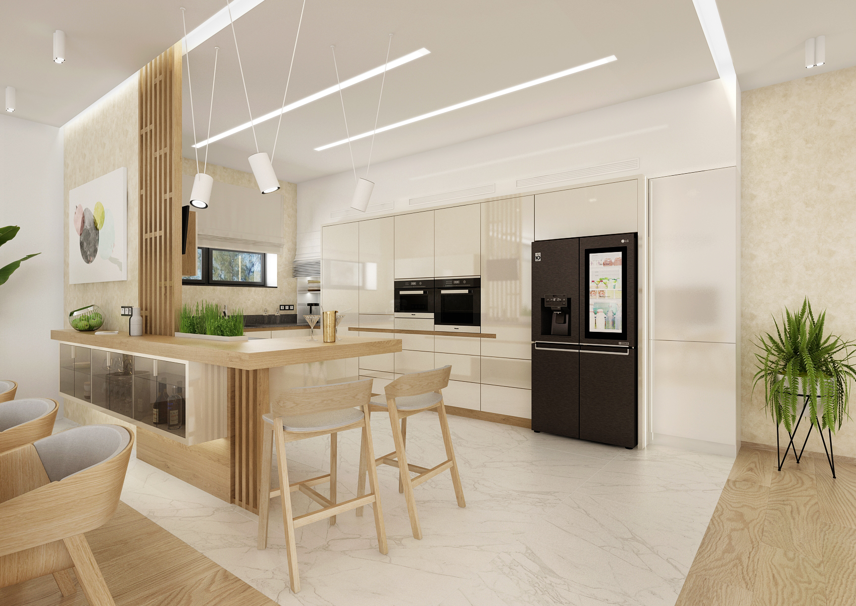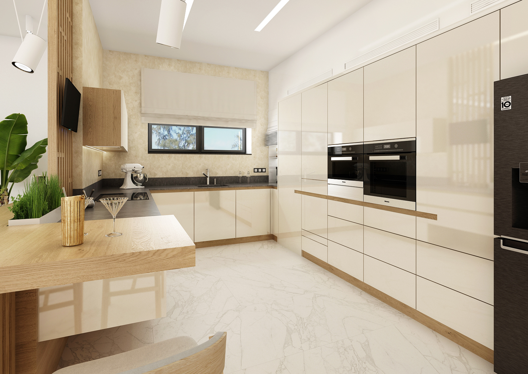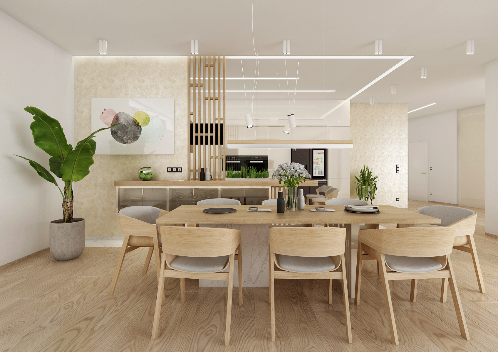 Masivní podlaha s výraznou texturou dřeva, která se nachází v části s jídelnou a obývacím pokojem přechází do mramorové dlažby, která vizuálně odděluje kuchyňský kout, kde nechybí ani bar. Dalším oddělujícím prvkem je podsvícený stropní podhled a lamelový oddělovač.