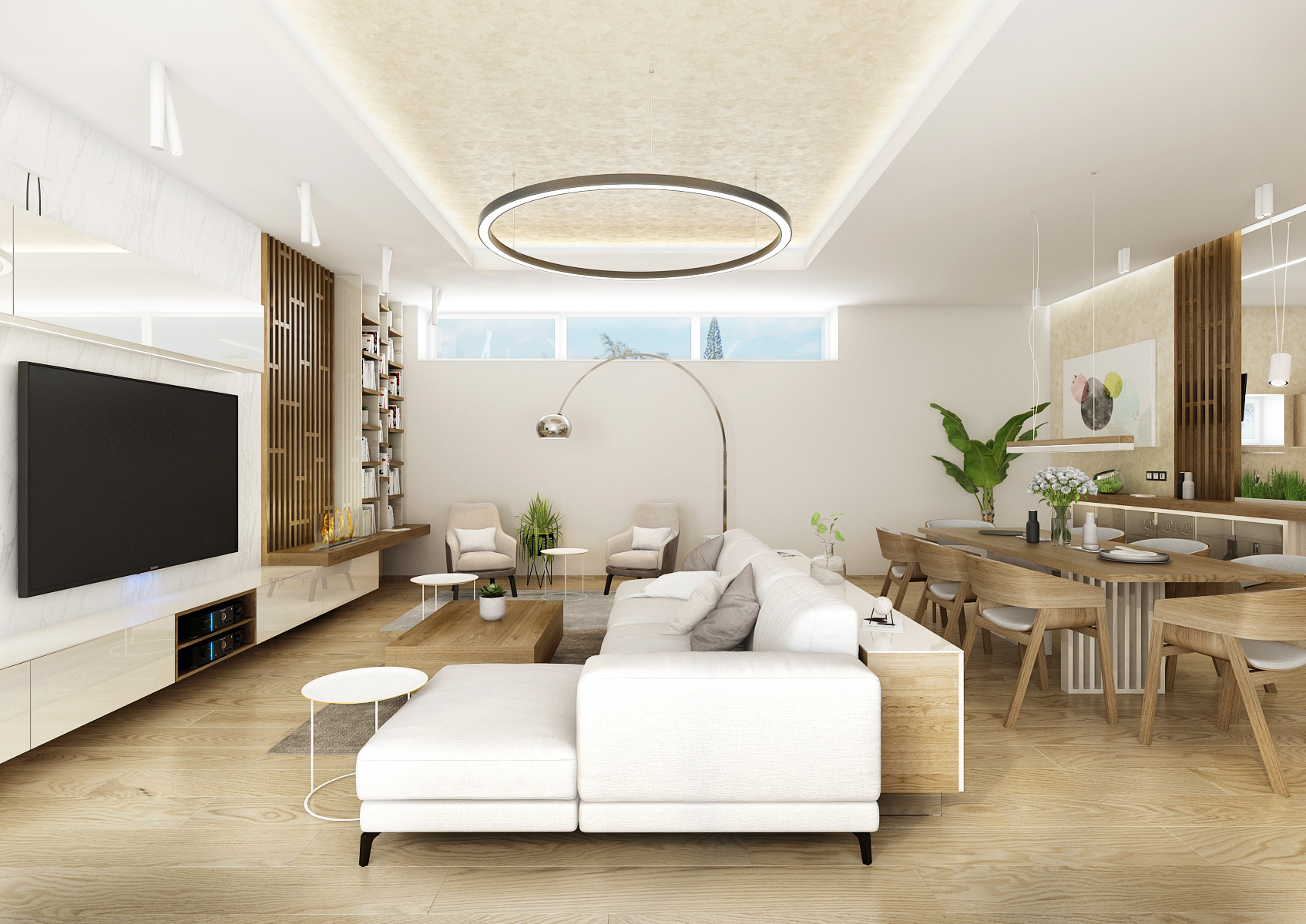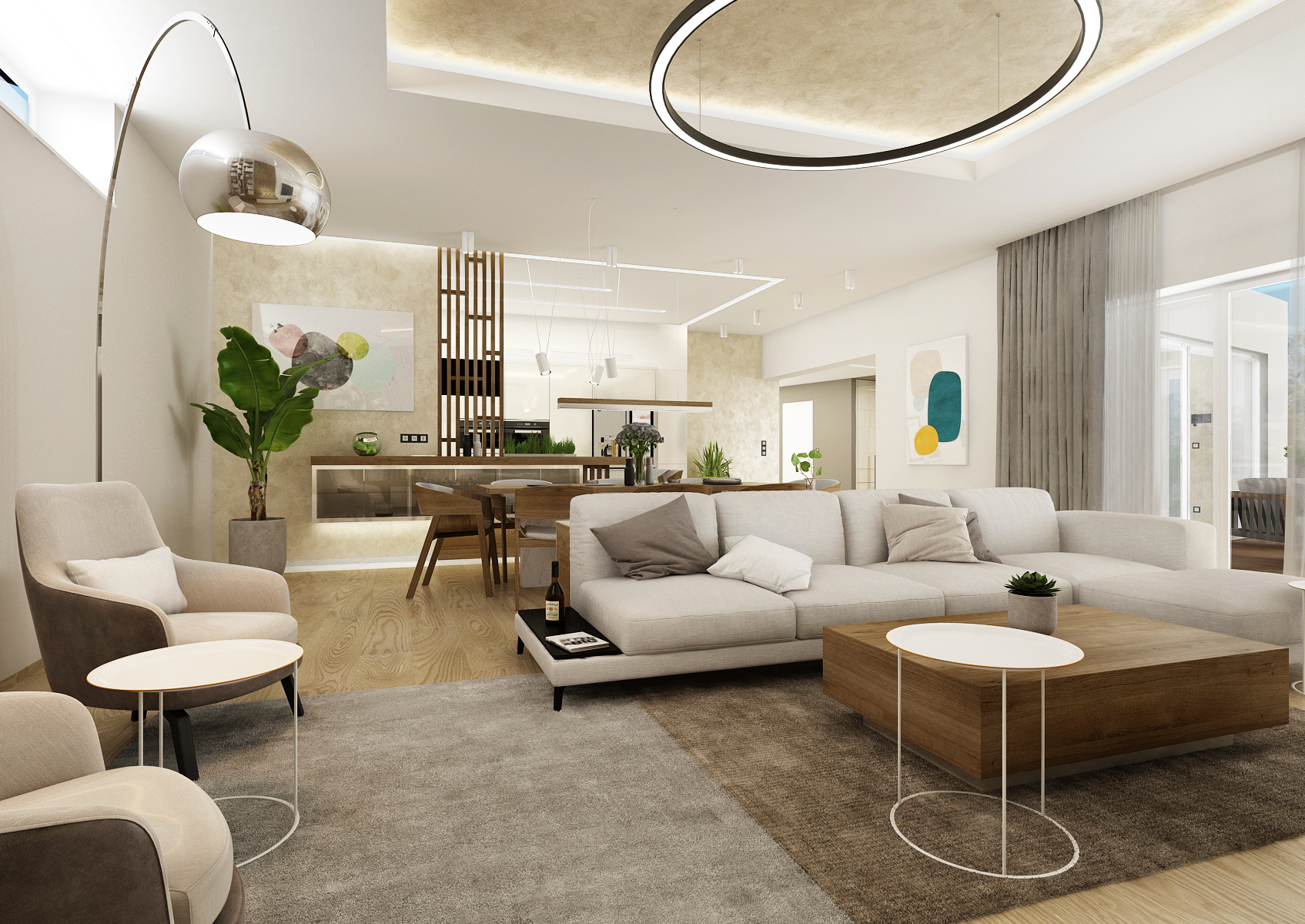 Kuchyně s bezúchytovými dvířky od skříněk v lesku je doplněna o tmavou kuchyňskou desku a okrovou betonovou stěrku na stěně, která se později objevuje i na stropě nad sedací soupravou. Tato část stropu je zdlůrazněna opět podsvíceným podhledem. Prostorná světlá sedací souprava s masivním odkládacím stolkem je doplněna o křesílka a dva druhy koberců.