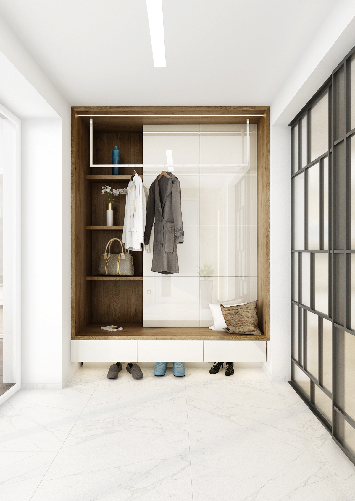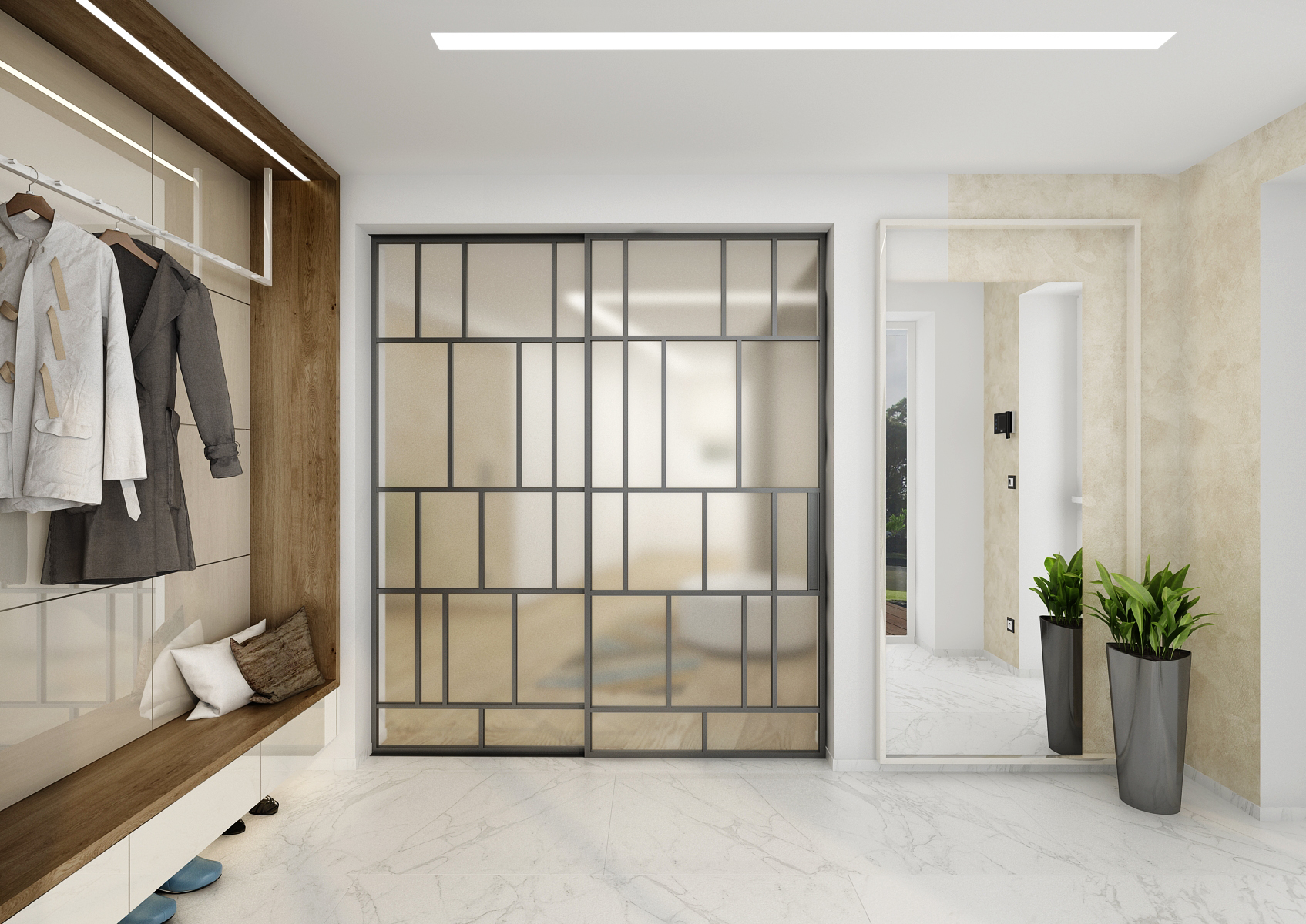 Co se týče prostorné vstupní haly, největší dominantou jsou zde zasouvací dveře s mléčným sklem a koutek s vestavnými skříněmi v béžové barvě. V další části se nachází výklenek s šatní tyčí a prostorem na usazení.