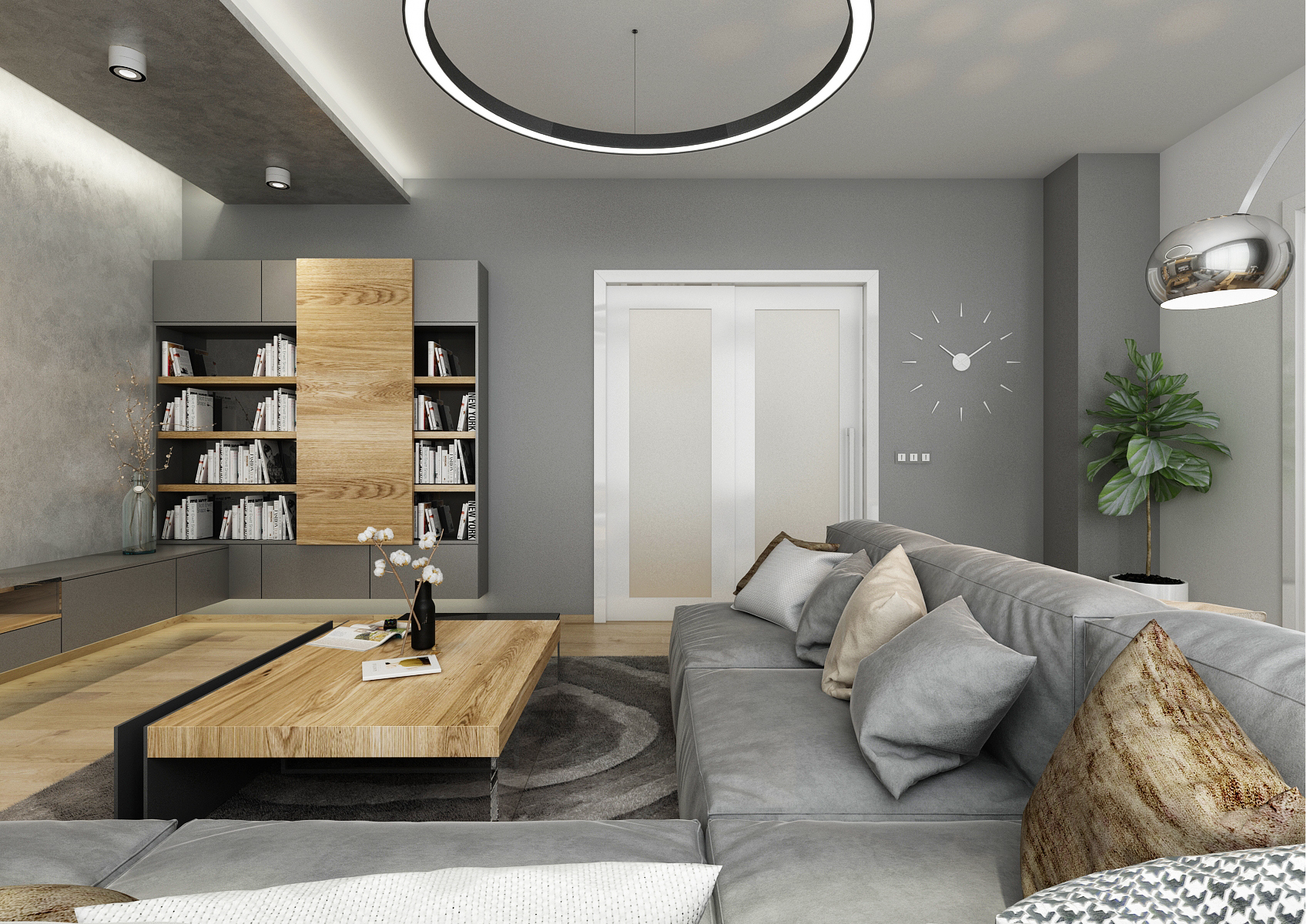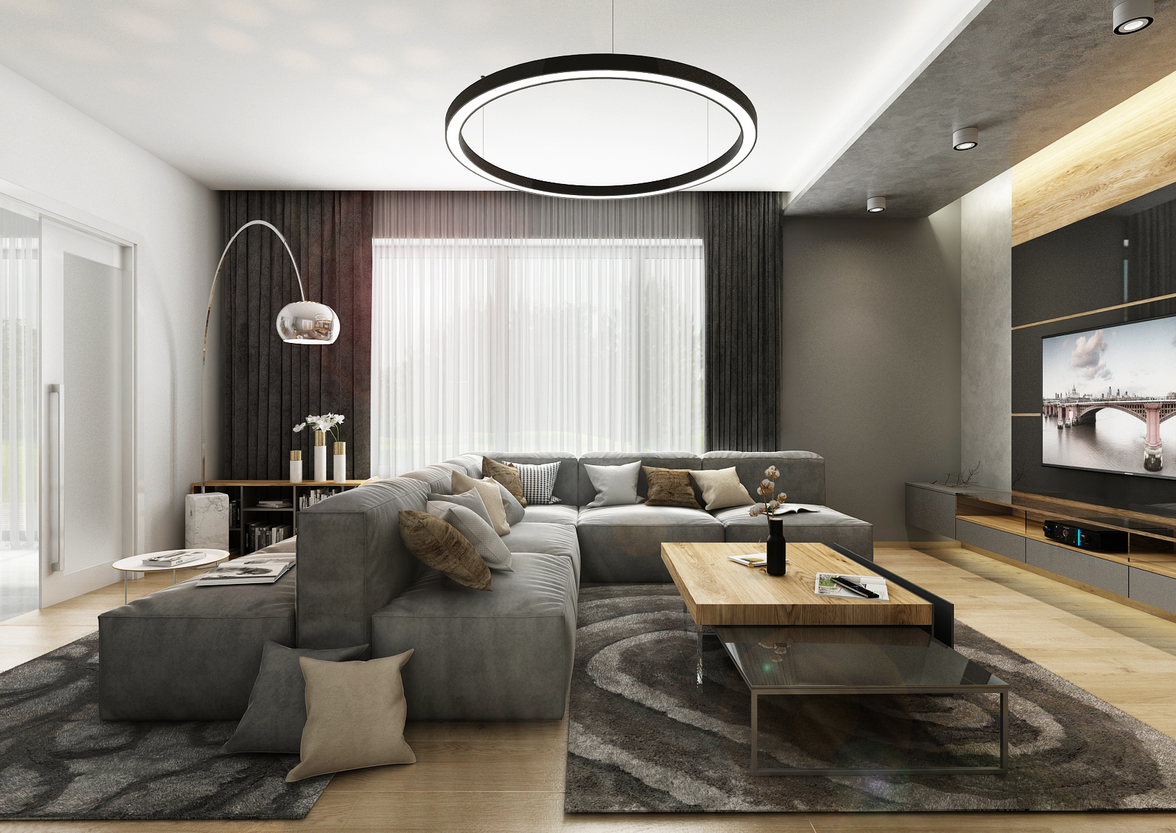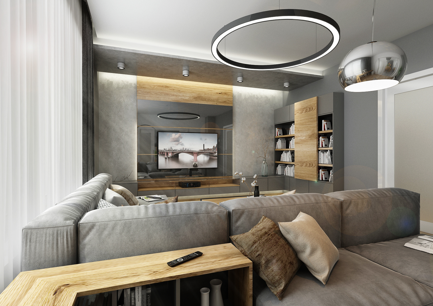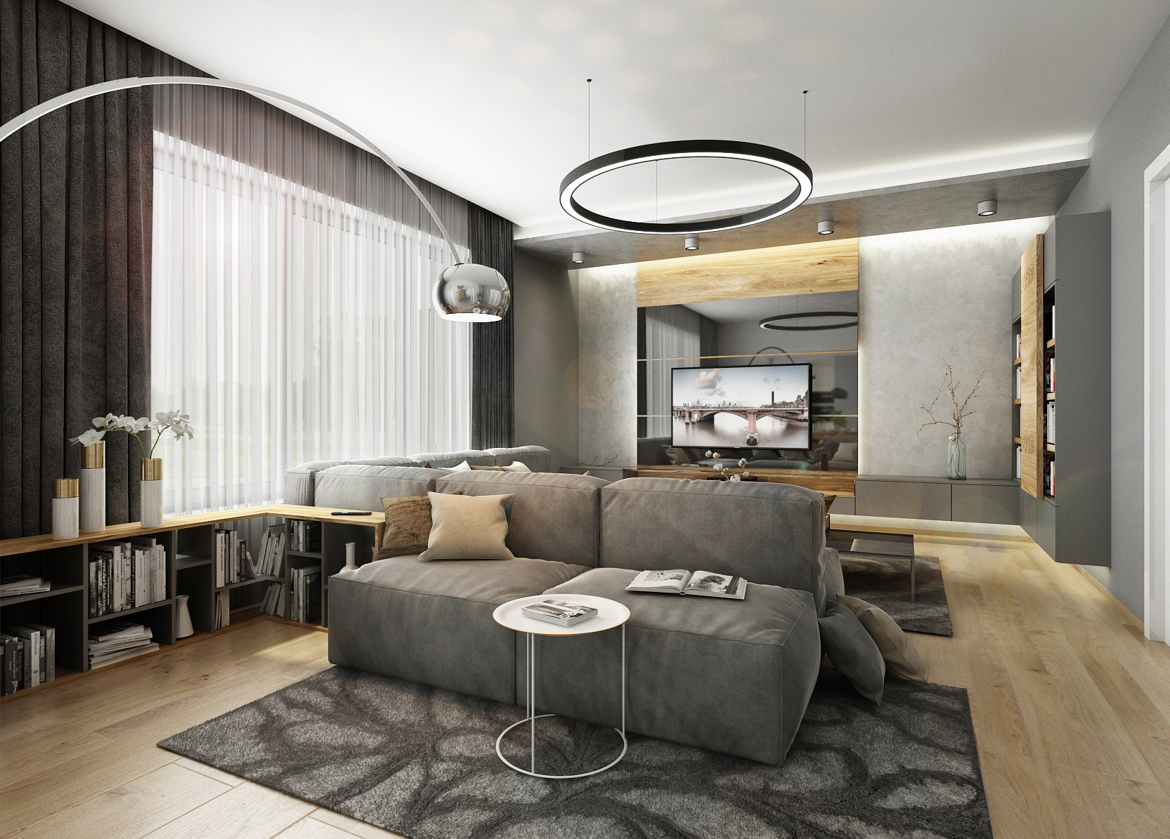 ostatní místnosti v domě. Nábytek v moderním osobitém designu je vyrobený na zakázku s lakovaným povrchem v matném šedém odstínu a s dýhou v dekoru dubu Corbridge. Obklad za televizorem tvoří kouřová zrcadla. Kouřový nádech má také skleněná police nad DVD a deska menšího konferenčního stolku.