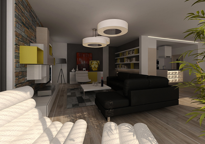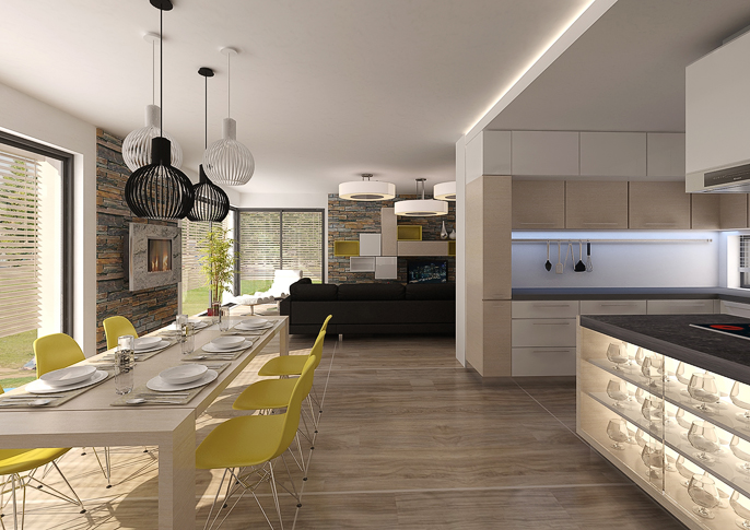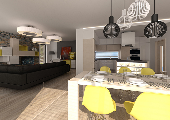 Společenská část. Zde jsou použity výrazné prvky jako například černá sedací souprava, kamenný obklad a velká kruhová svítidla. Světlé zemité tóny se zde kombinují s výraznou antracitou, černou a žlutou doplňkovou barvou. Díky kombinaci s bílou barvou místnost působí prostorně. Kulaté závěsné lampy nad jídelním stolem činí prostor moderní společně s dekoracemi. Prosklené místo na skleničky v kuchyňském ostrůvku budí dojem elegance a čistoty.