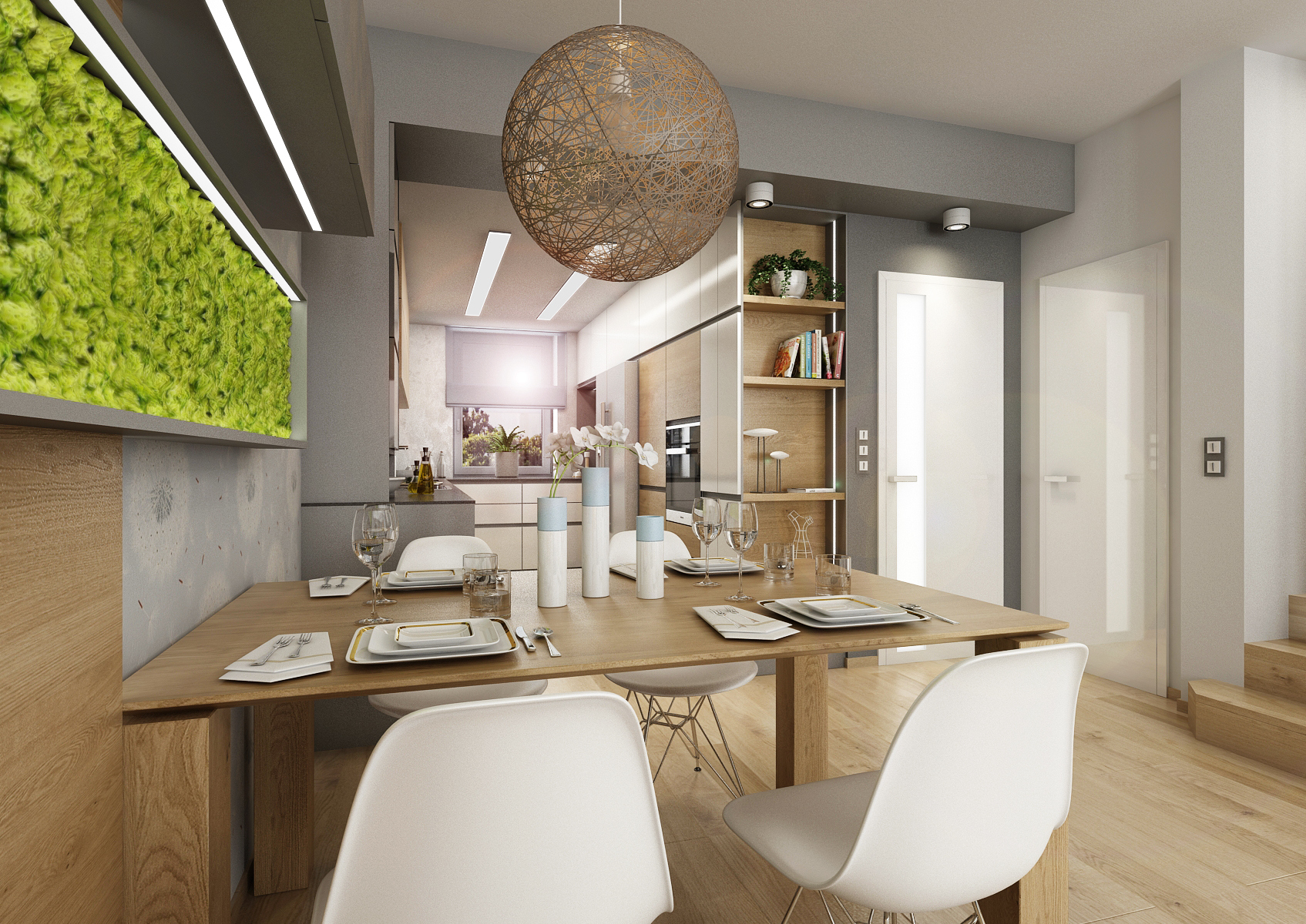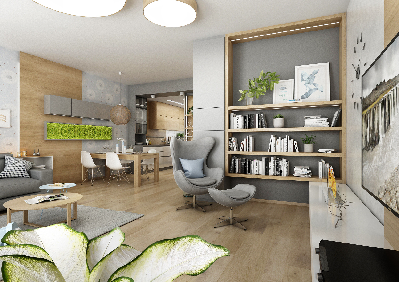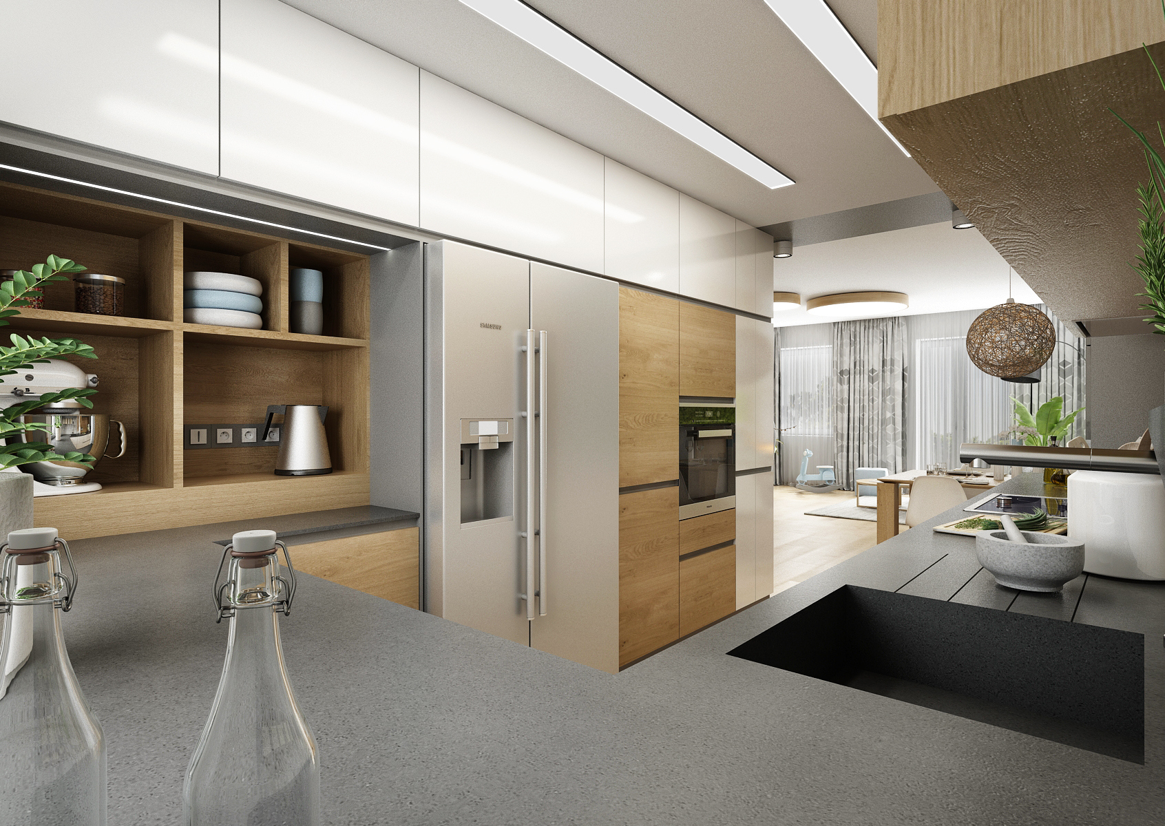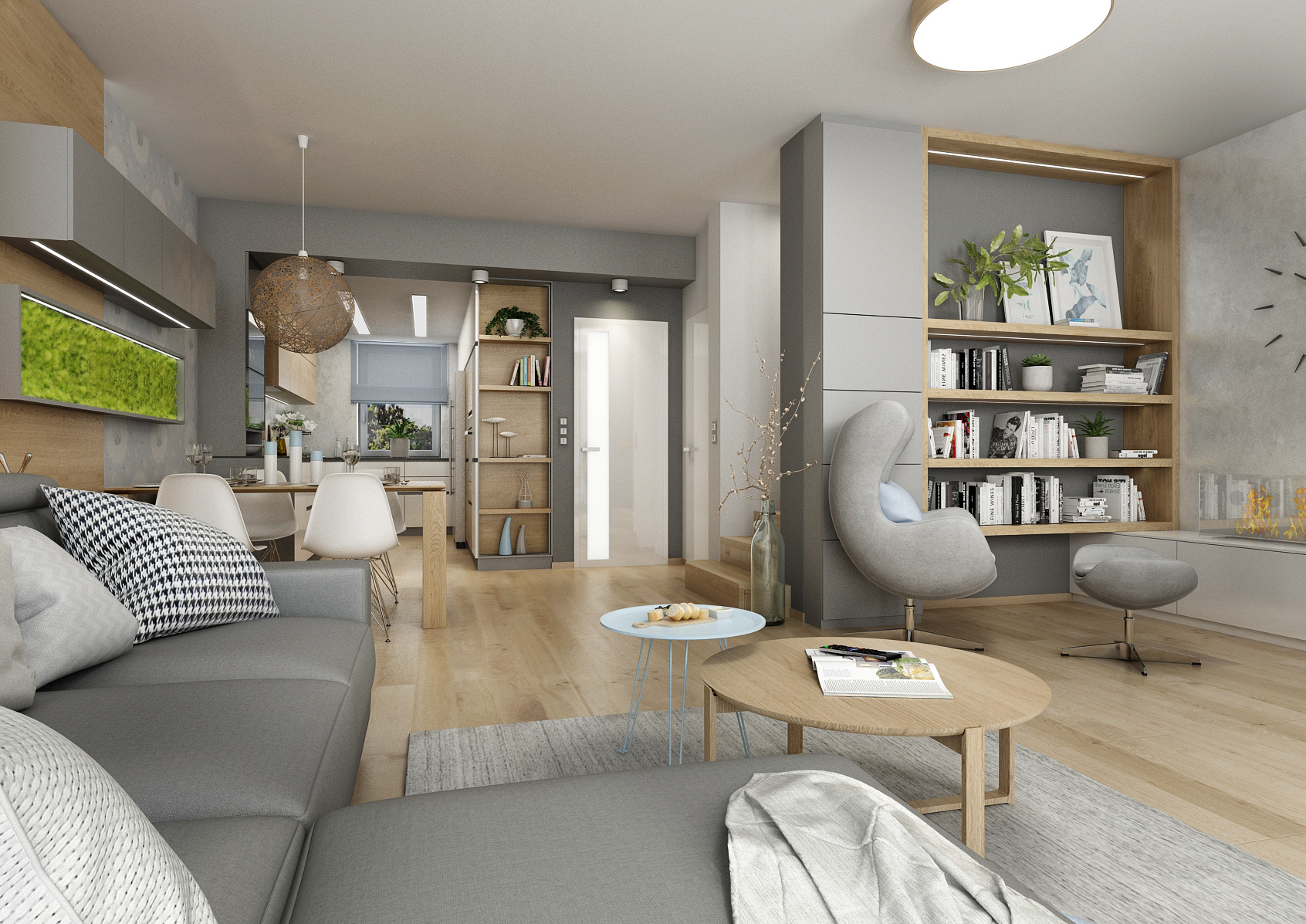 Dekor přírodního dubu je zkombinován s šedým odstínem v matu a bílou vysokého lesku. Pro oddělení schodiště, které stoupá přímo z obývací pokoje, vznikla sádrokartonová příčka s vysokou knihovnou. Velice nenápadná je rohová kuchyňská linka ve tvaru písmene U, zasunutá v nice. Zde byl snížen strop na výšku kuchyňských skříněk. Při pohledu z pokoje bok linky přecházející do šedého překladu vypadá jako její orámování. Vinylová podlaha se plynule stáčí v obložení stěn. Opakování stejného dřevodekoru v celém prostoru působí harmonicky.