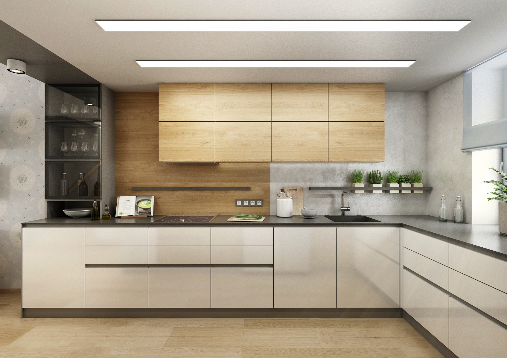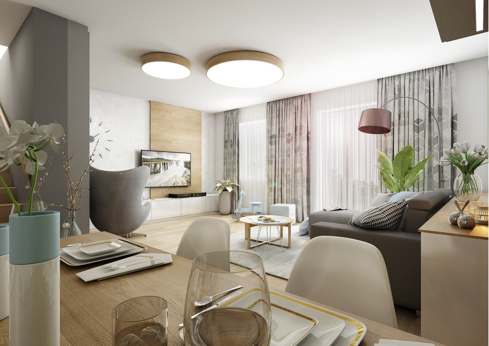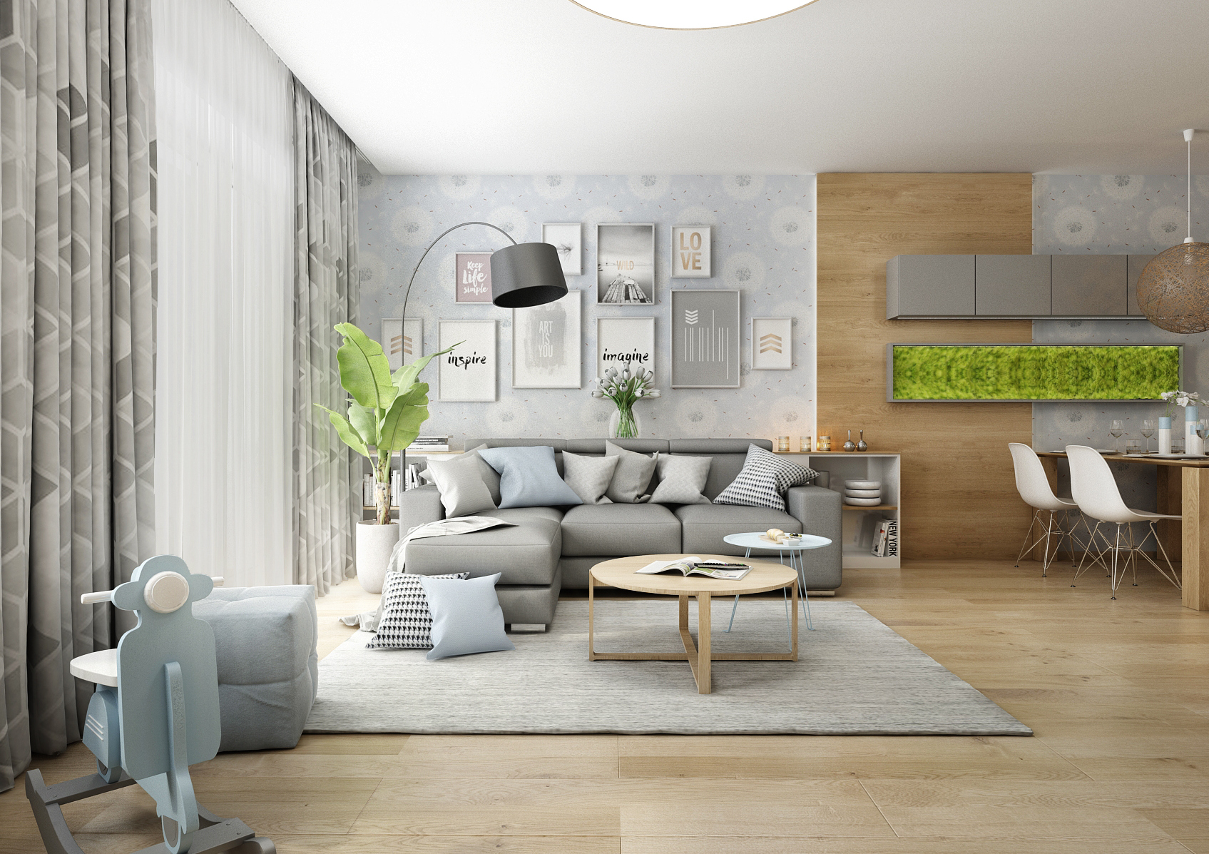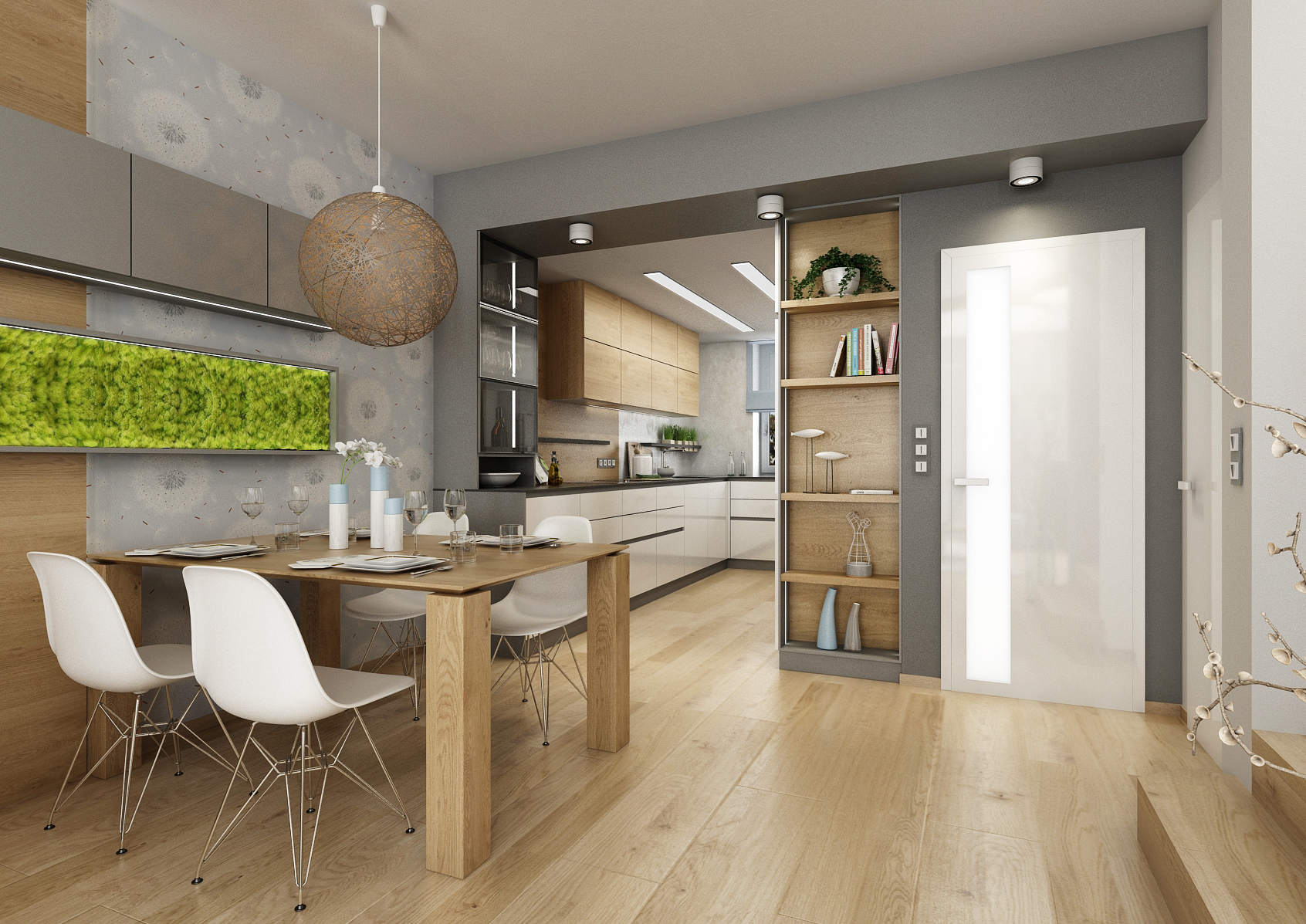Dekor přírodního dubu je zkombinován s šedým odstínem v matu a bílou vysokého lesku. Pro oddělení schodiště, které stoupá přímo z obývací pokoje, vznikla sádrokartonová příčka s vysokou knihovnou. Velice nenápadná je rohová kuchyňská linka ve tvaru písmene U, zasunutá v nice. Zde byl snížen strop na výšku kuchyňských skříněk. Při pohledu z pokoje bok linky přecházející do šedého překladu vypadá jako její orámování. Vinylová podlaha se plynule stáčí v obložení stěn. Opakování stejného dřevodekoru v celém prostoru působí harmonicky.