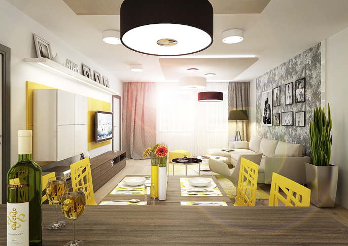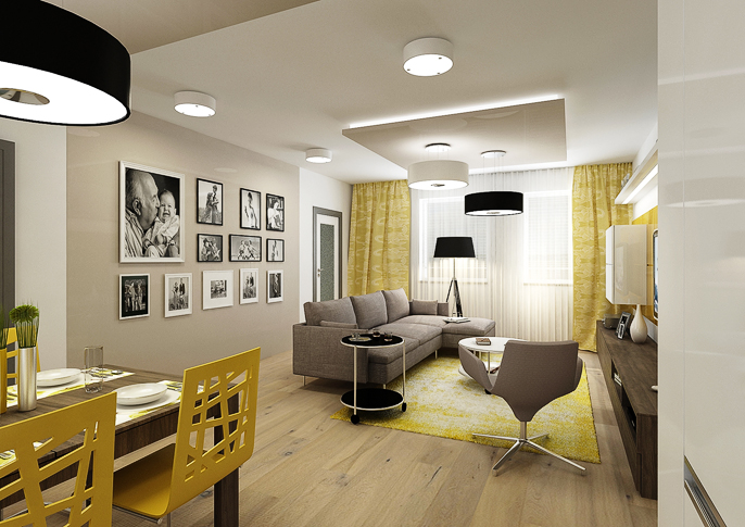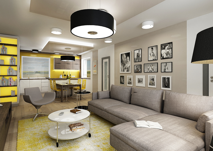 Obývací pokoj s kuchyní v zemitých barvách a žlutou barvou. U kuchyňské linky je žlutý obklad lacobel a dvířka v kombinaci bílá s wenge. Lacobel se pak opakuje ještě v obkladě za TV. Zbytek prostoru je laděn do béžova s šedými prvky nábytku.