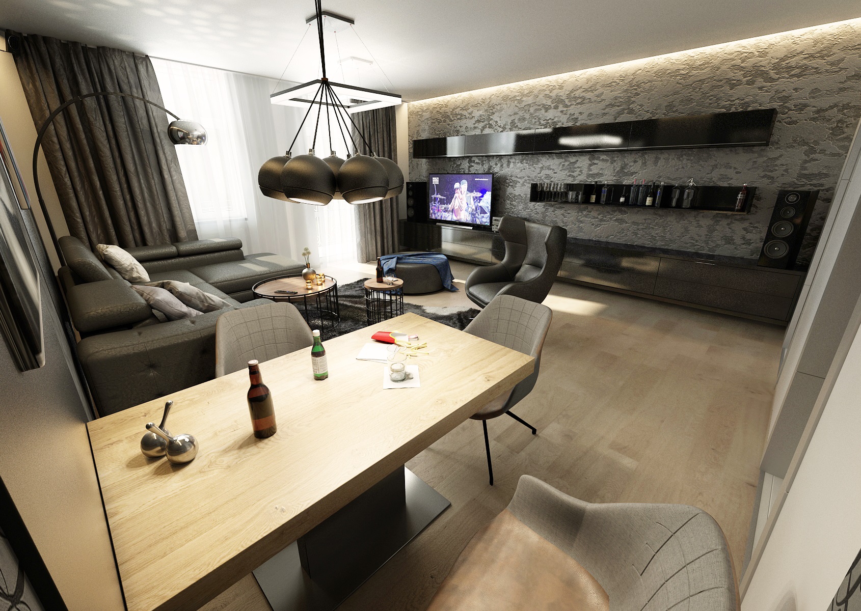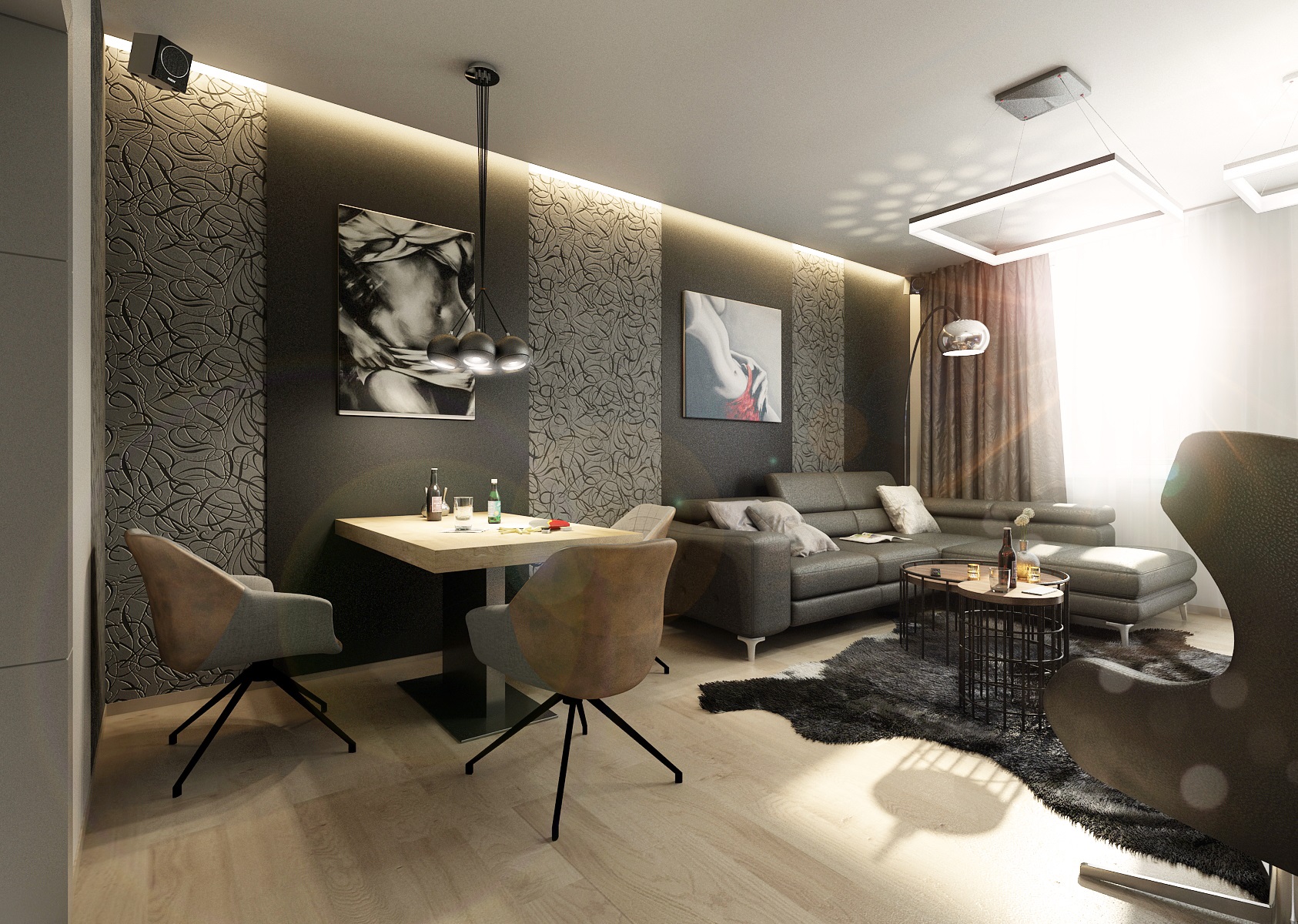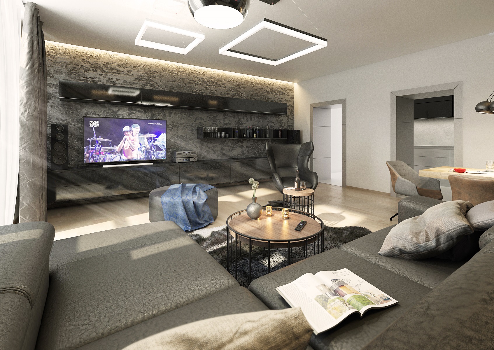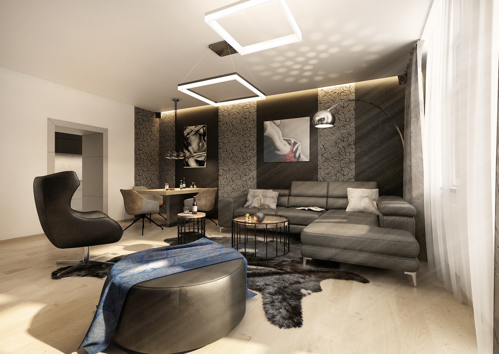 v lesklých i matných odstínech tmavé šedé, která se ideálně doplňuje s přírodní dubovou podlahou. Ze zařizovacích prvků zde najdeme koženou sedací soupravu