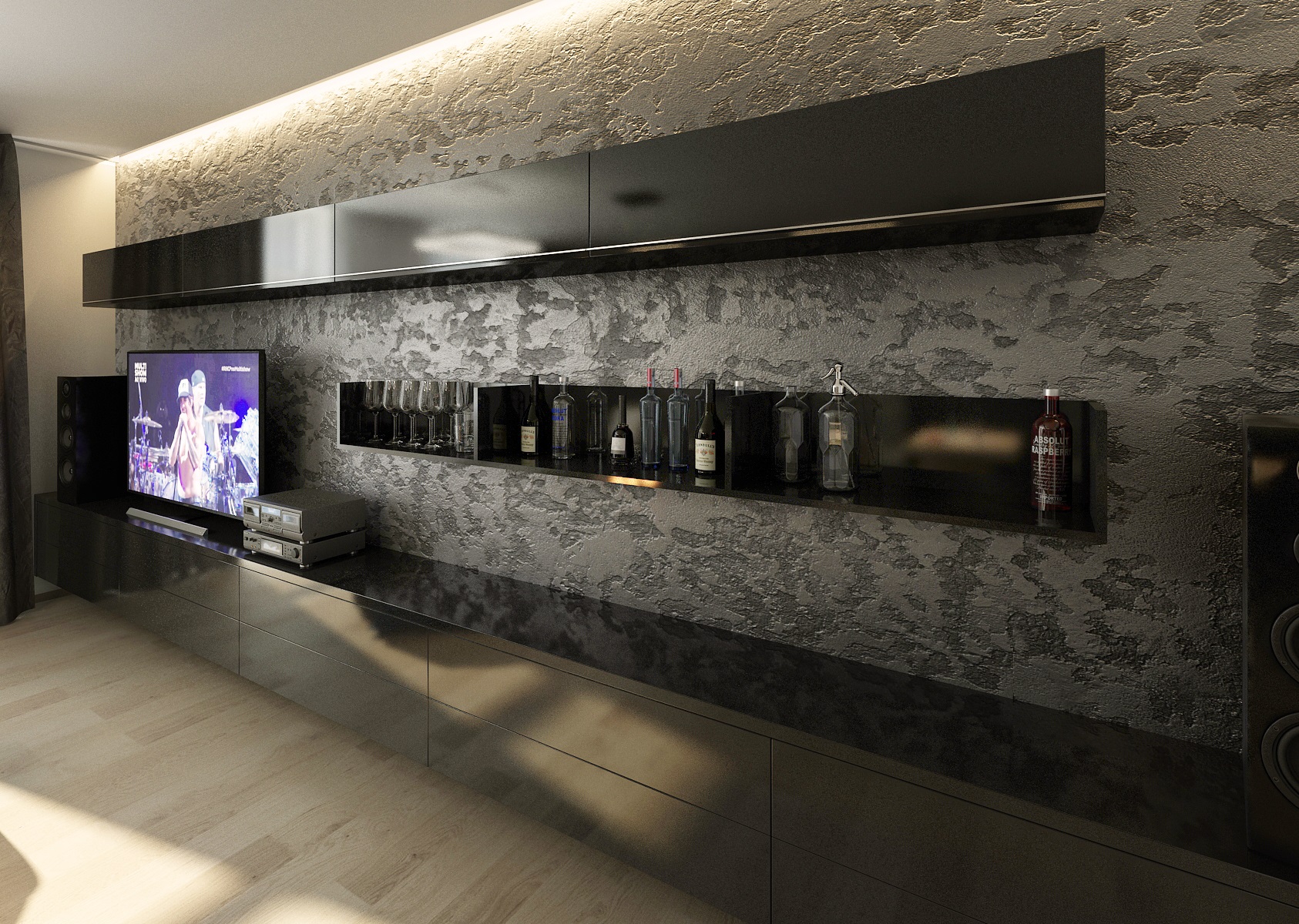 Pohled upoutá výrazná betonová stěrka na zdi za televizorem, jako by odrážela zvětšený vzor kožené sedací pohovky.