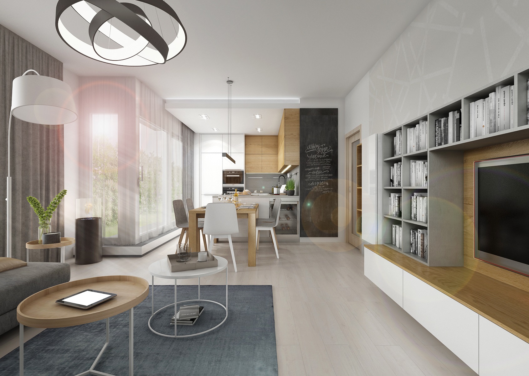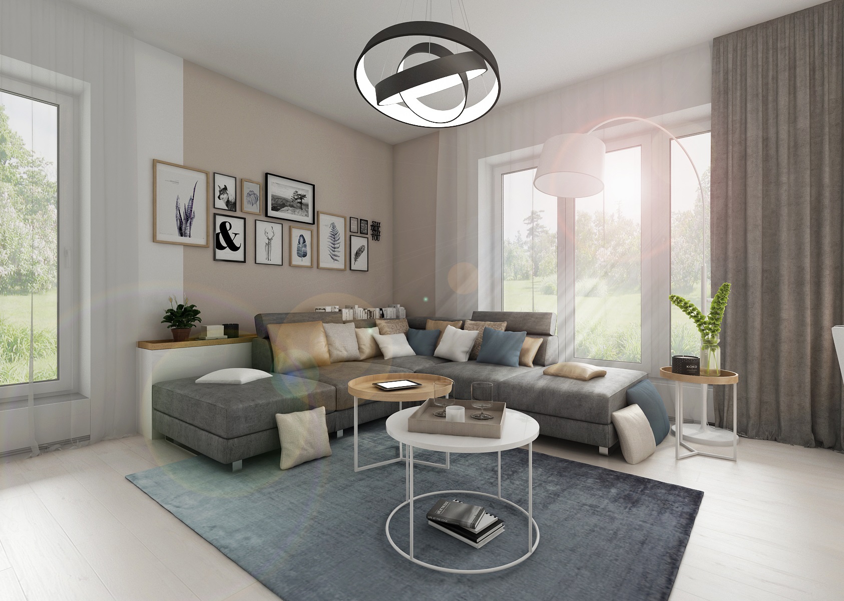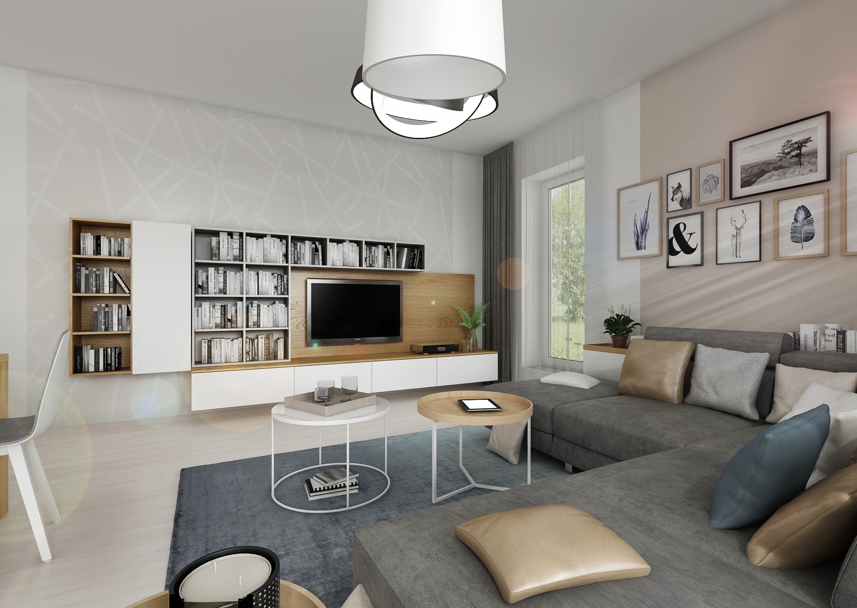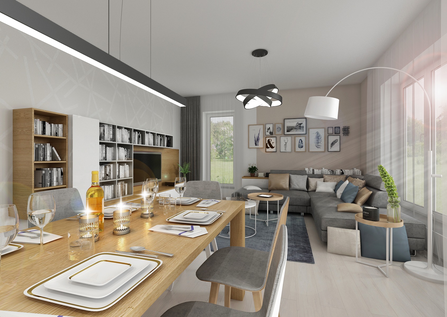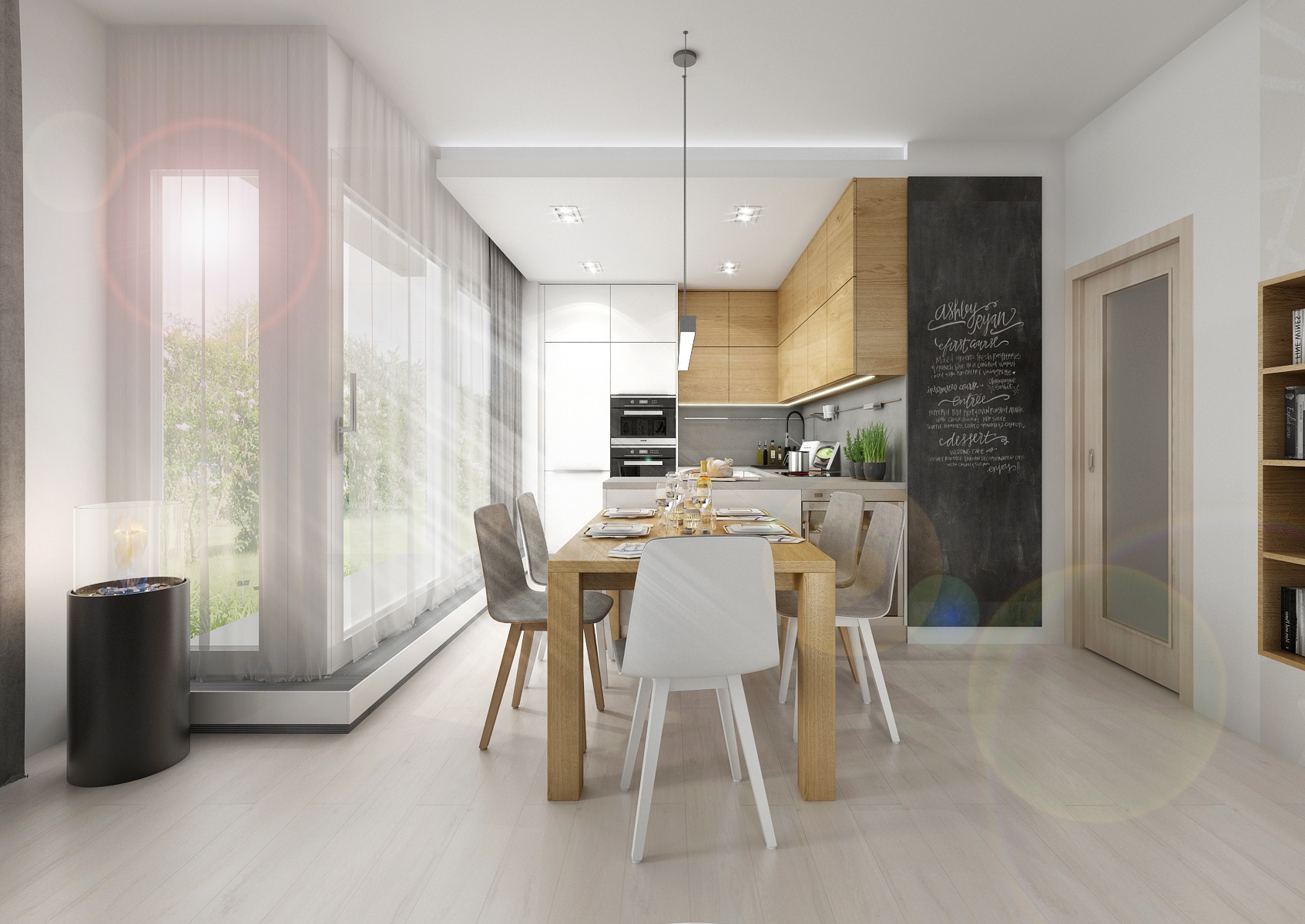 Hébé do tvaru ,,L,,. Jako jídelní stůl byl zvolen dubový dýhovaný stůl