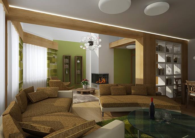 Velký prostor je přirozeně opticky členěn dřevěnými dubovými obklady překladu a sloupu. Nábytek v ořechu společně s pohovkou Valentini ladí interiér do přírodních zemitých barev. U krbu v otevřené části pokoje je vytvořeno vzdušné, avšak intimnější sezení.