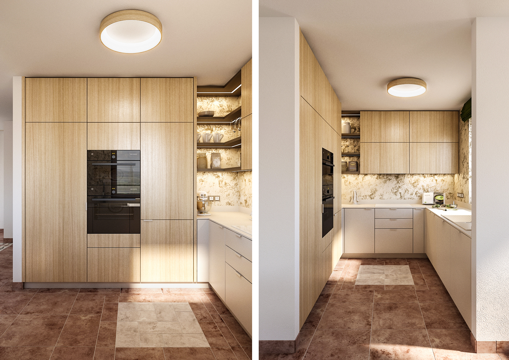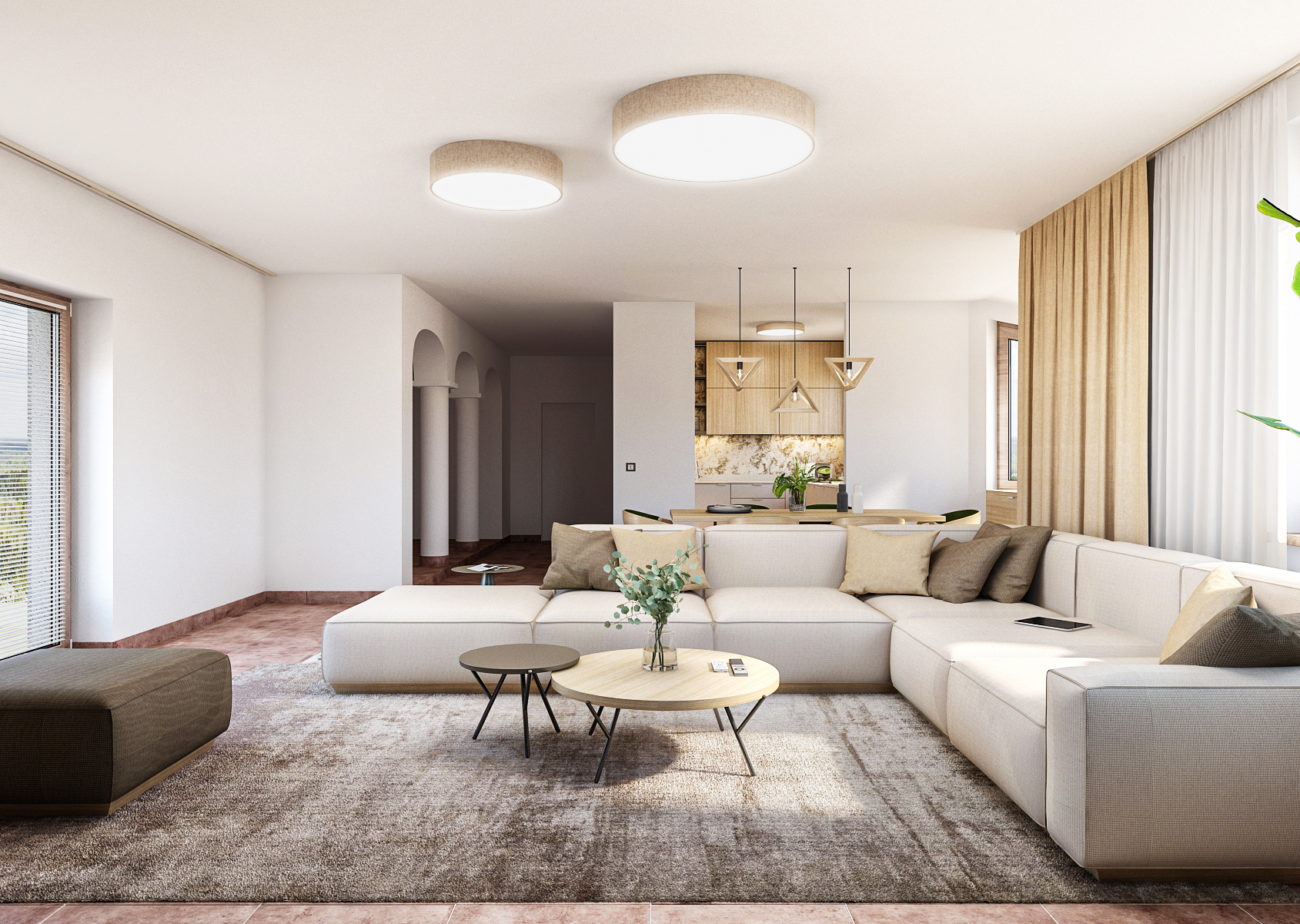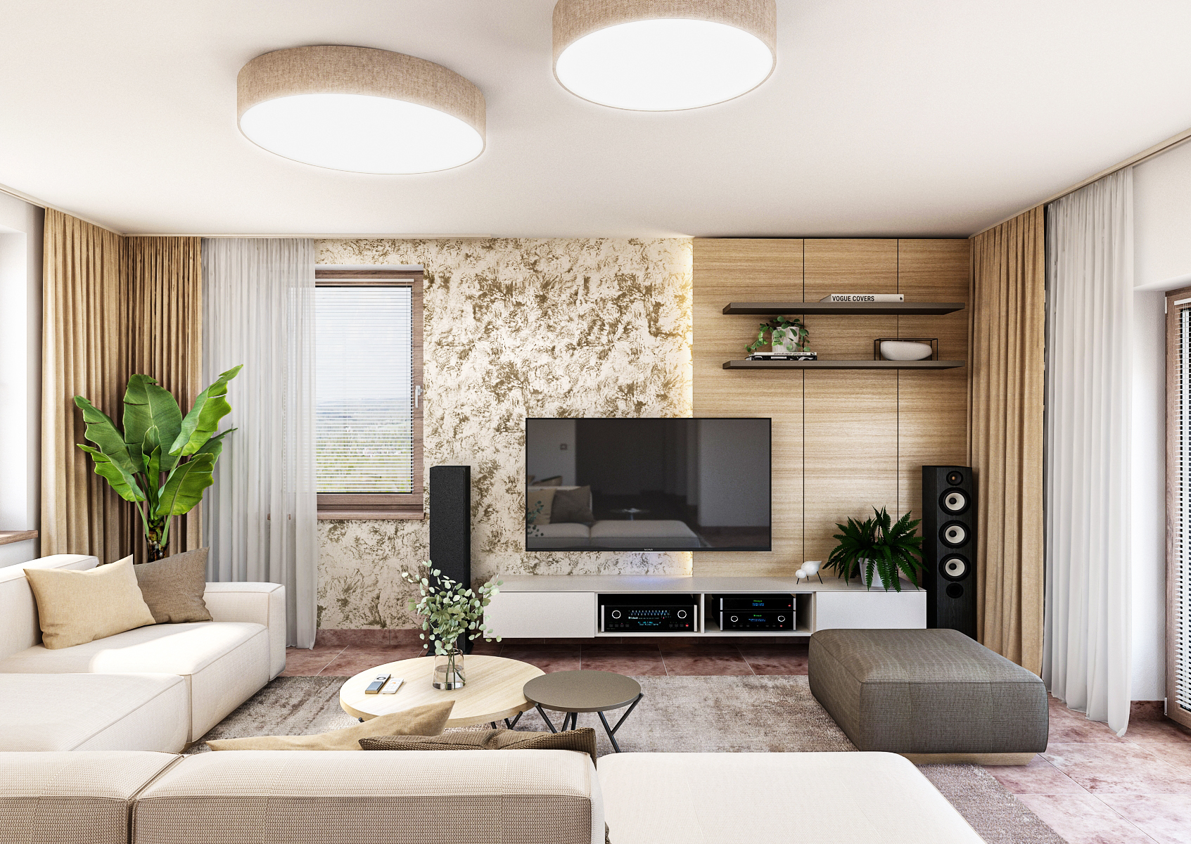 Obývací pokoj je kombinací světlých zemitých tónů s výraznou dlažbou hrající tóny cihlové barvy. Rohová krémová sedací souprava ladí je sladěna s bytovým textilem a dubovým panelem za televizní stěnou s podsvícením. Zbytek stěny je zpestřen strukturovanou betonovou stěrkou.