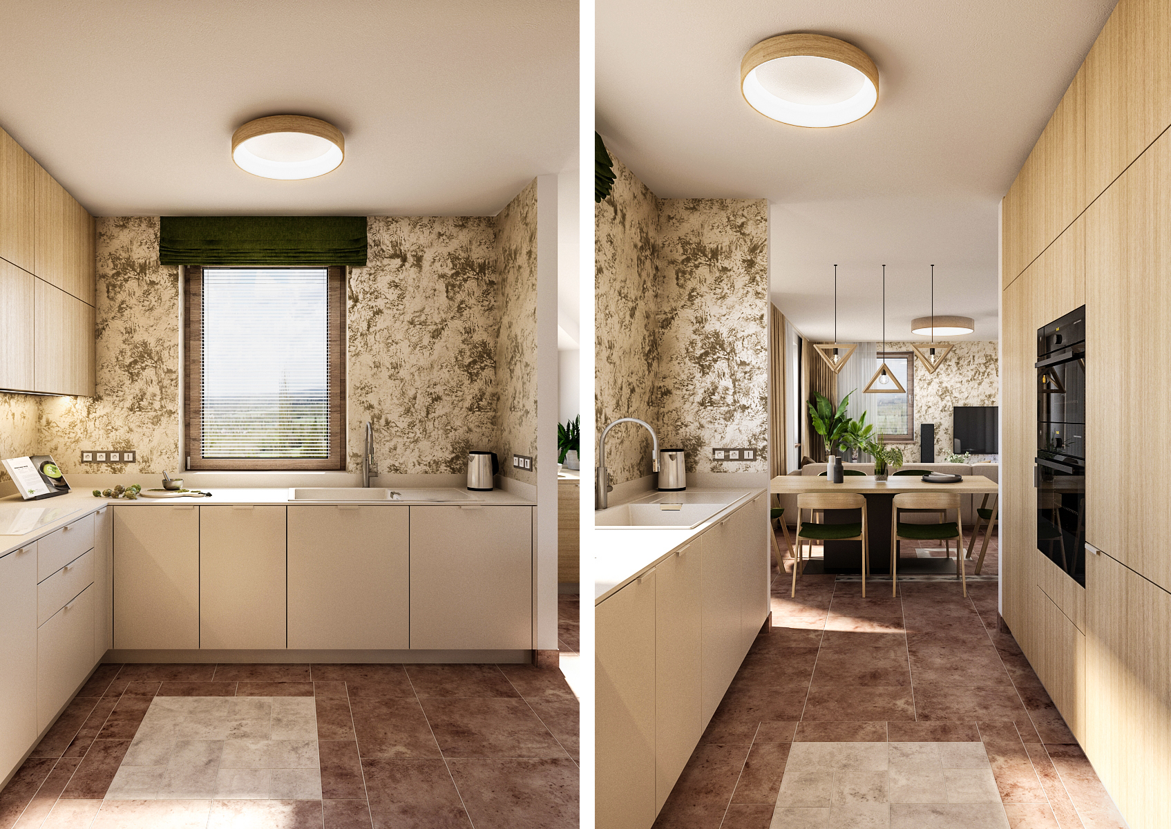 Světlá kuchyně je opět doplněna o přírodní dub v podobě vestavěných skříní se spotřebiči, protější část je laděna do bíla s výraznou betonovou stěrkou. V celém interiéru hrají také akcenty zelené, ať už jde o čalounění, bytový textil nebo květinové doplňky.