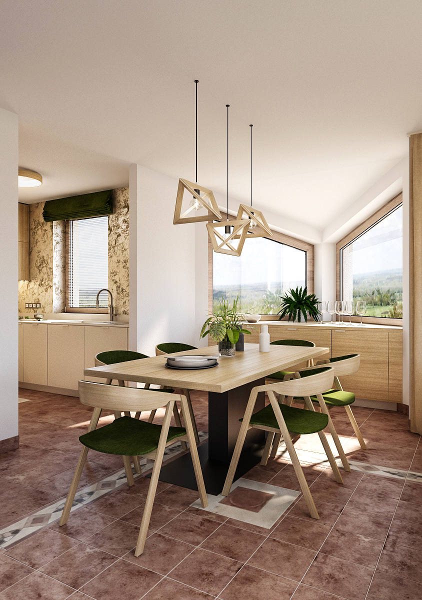 Zajímavým prvkem v interiéru je neobvyklá dispozice. Výklenek s okny je využit velice prakticky, je do něj vložen příborník, který zároveň slouží jako odkládací místo pro případné pokrmy či sklenice na víno. Kousek od výklenku je umístěn jídelní stůl s kovovou podnoží a jídelními křesílky s čalouněním, sladěny jsou zde i svítidla v originálních tvarech.