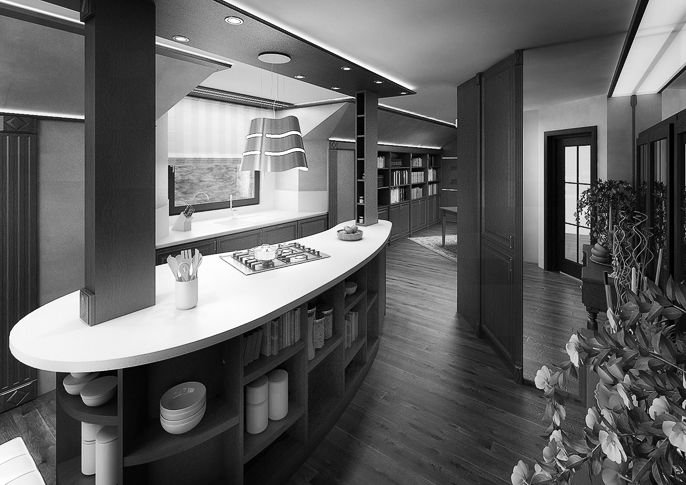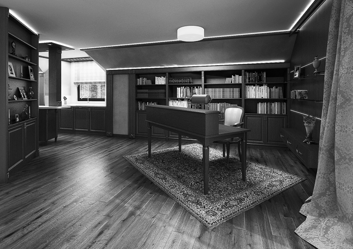 Návrh pracovny spojené s kuchyňským koutem v podkrovním bytě je vybaven nábytkem v historizujícím stylu, zkombinovaném s moderními tvary. Nejzajímavějším prvkem je atypický kuchyňský ostrůvek, který je osvícen závěsnou lampou a bodovými stropními světly. Po stěnách v pracovně jsou vestavené knihovny a uprostřed stojí rustikální pracovní stůl, který je dominantou pokoje. Design V. Prokop.